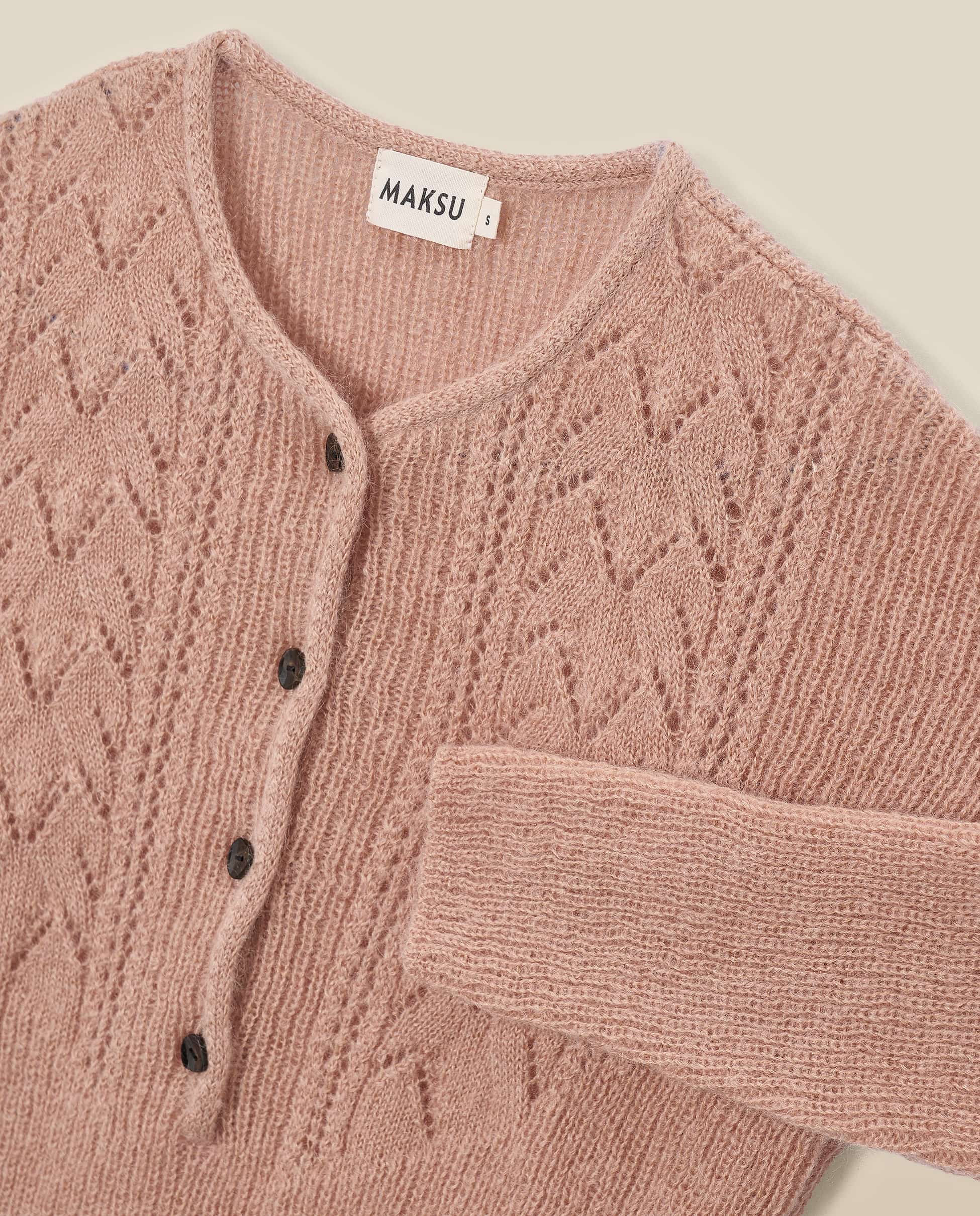 Delicate texture and everyday warmth come together in the Claire Sweater, knitted from a soft mohair blend in a gentle blush pink. The relaxed silhouette features a rounded neckline and tonal buttons through the front, with a heritage-inspired openwork knit across the chest for subtle dimension. Ribbed cuffs and hem complete the look with gentle structure.