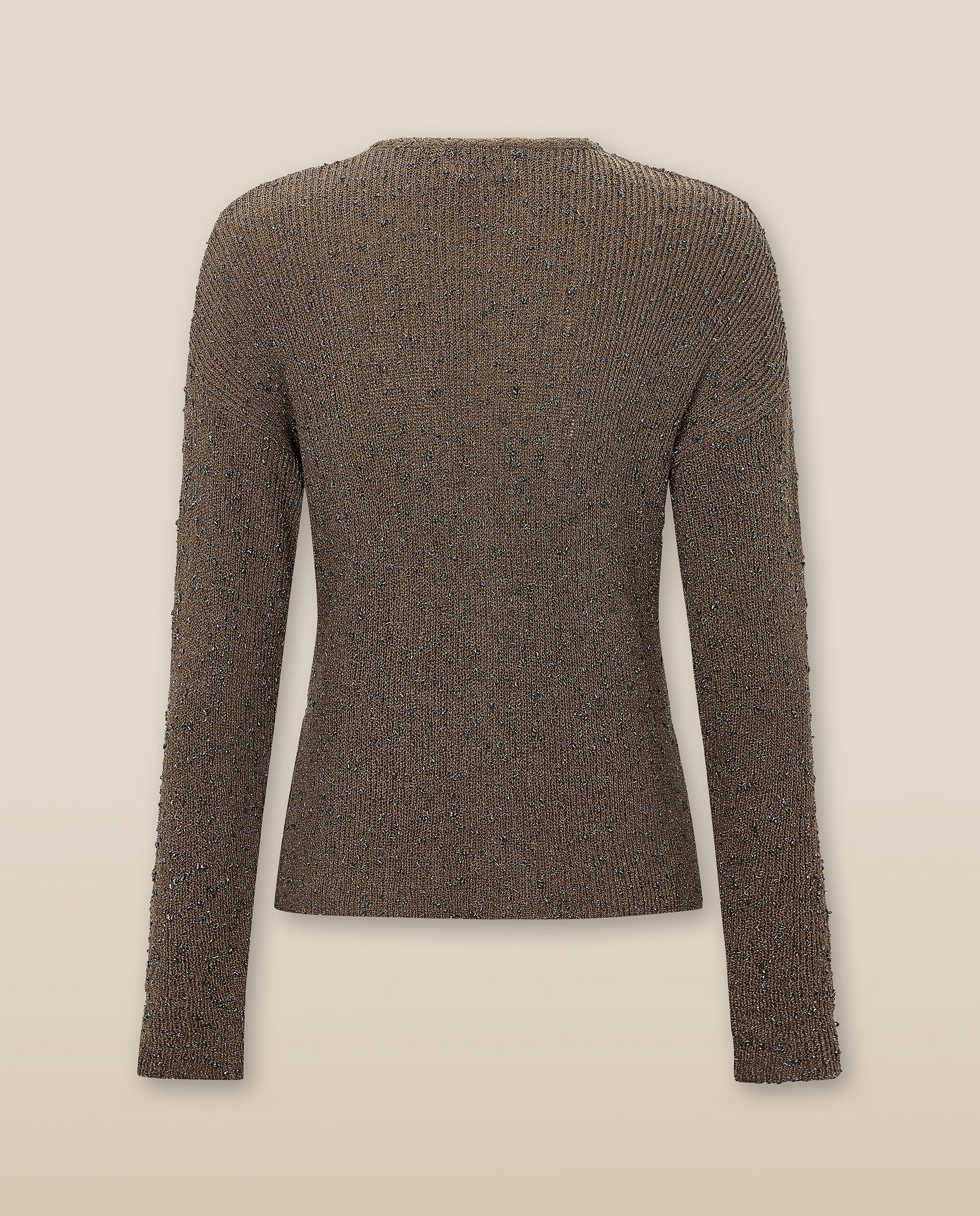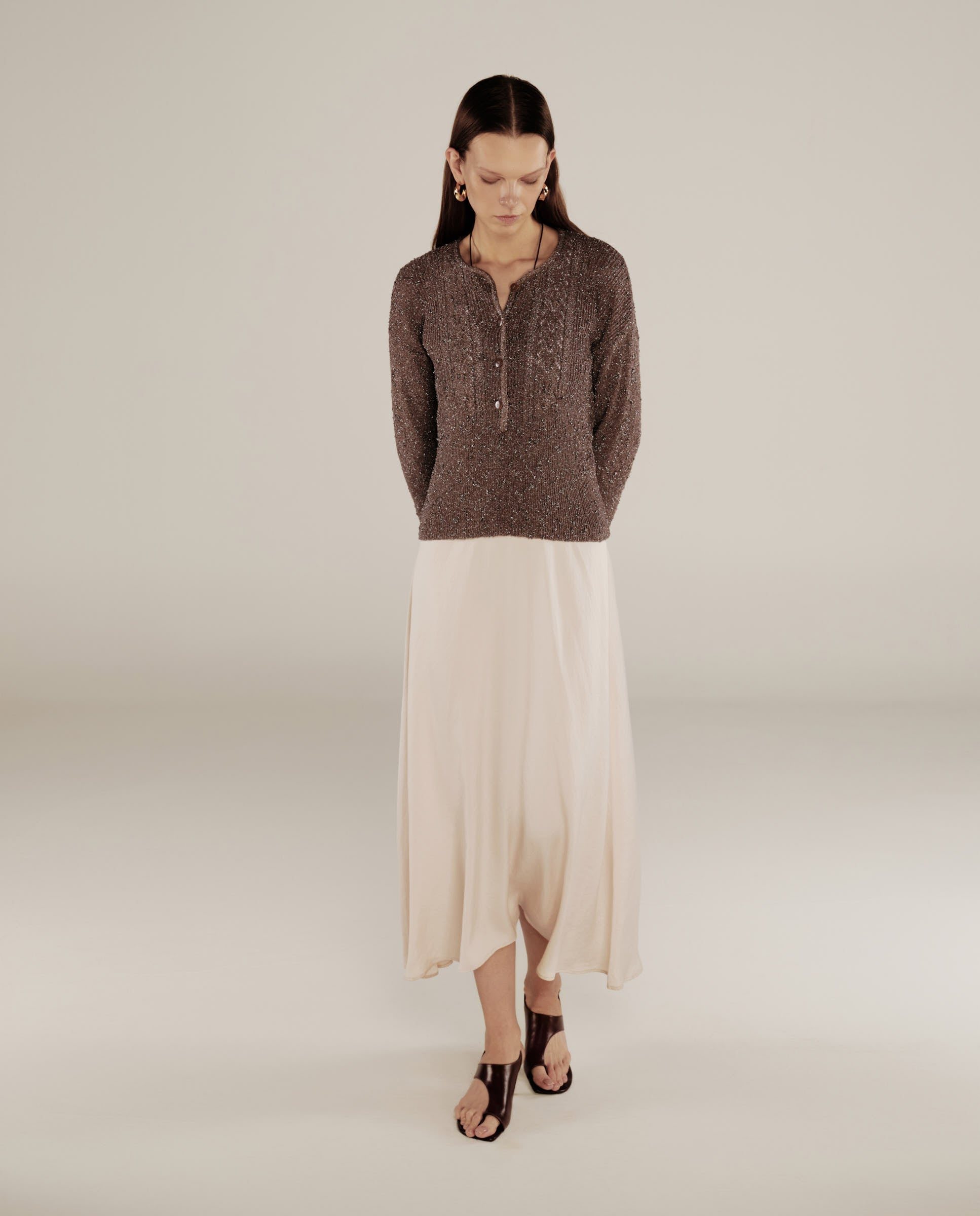 In a soft, neutral taupe, the Clivia Sweater marries understated elegance with everyday wearability. The gently shimmering yarns highlight the intricate patterning across the bodice, and the round neckline lends a timeless finish. Buttoned through the front, it’s tailored yet comfortable—perfect for infusing laid-back outfits with subtle polish and adding a touch of radiant sophistication to any ensemble.