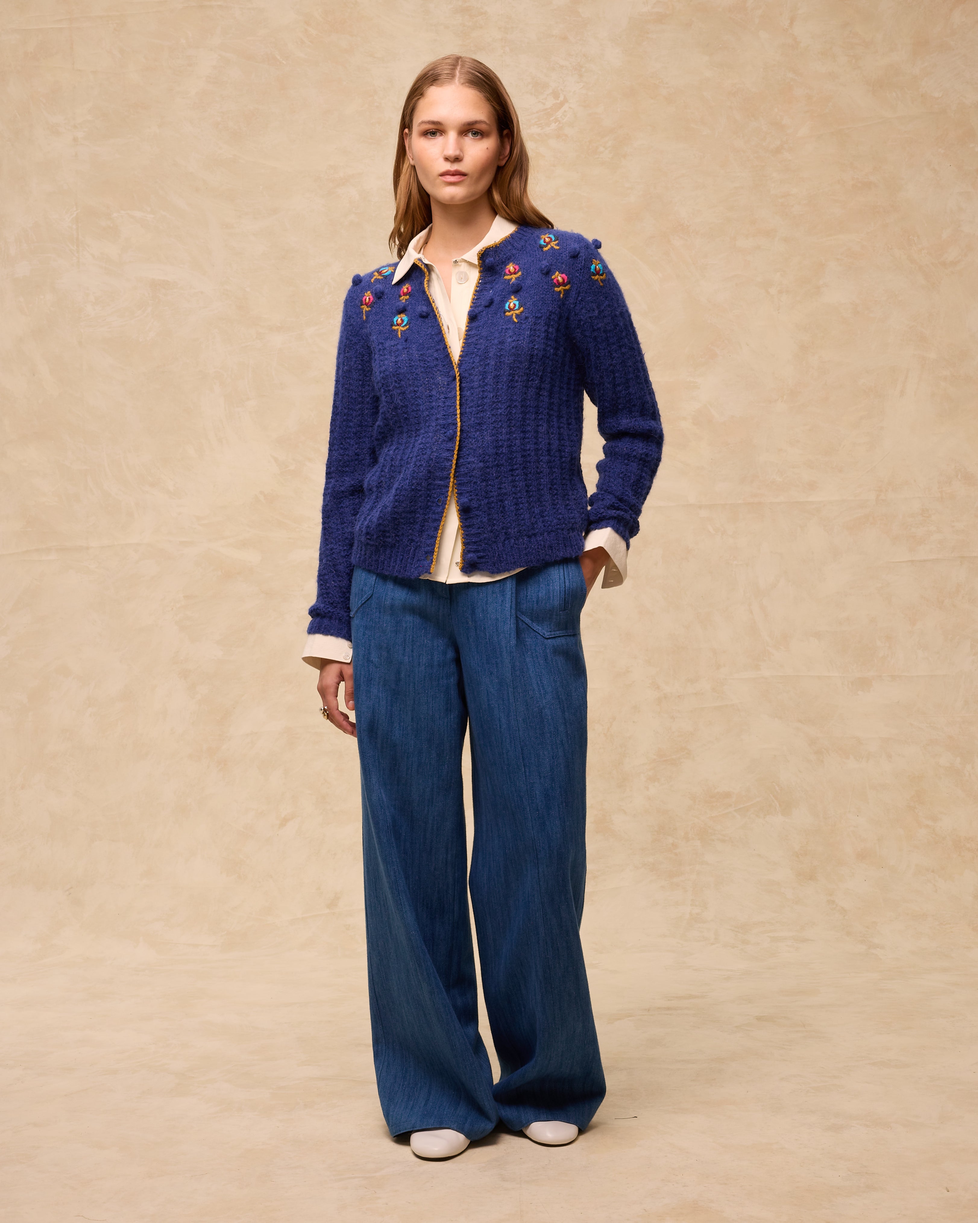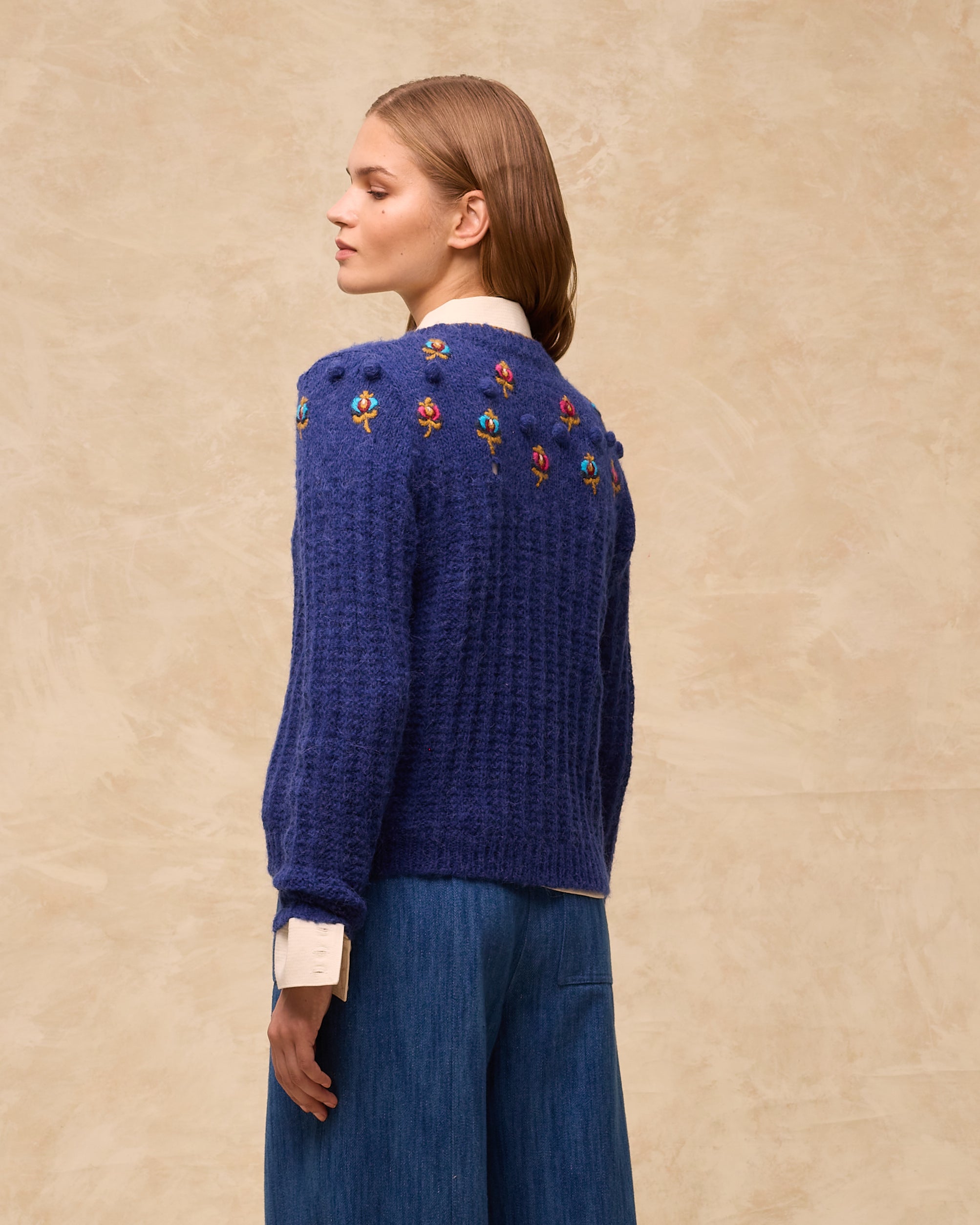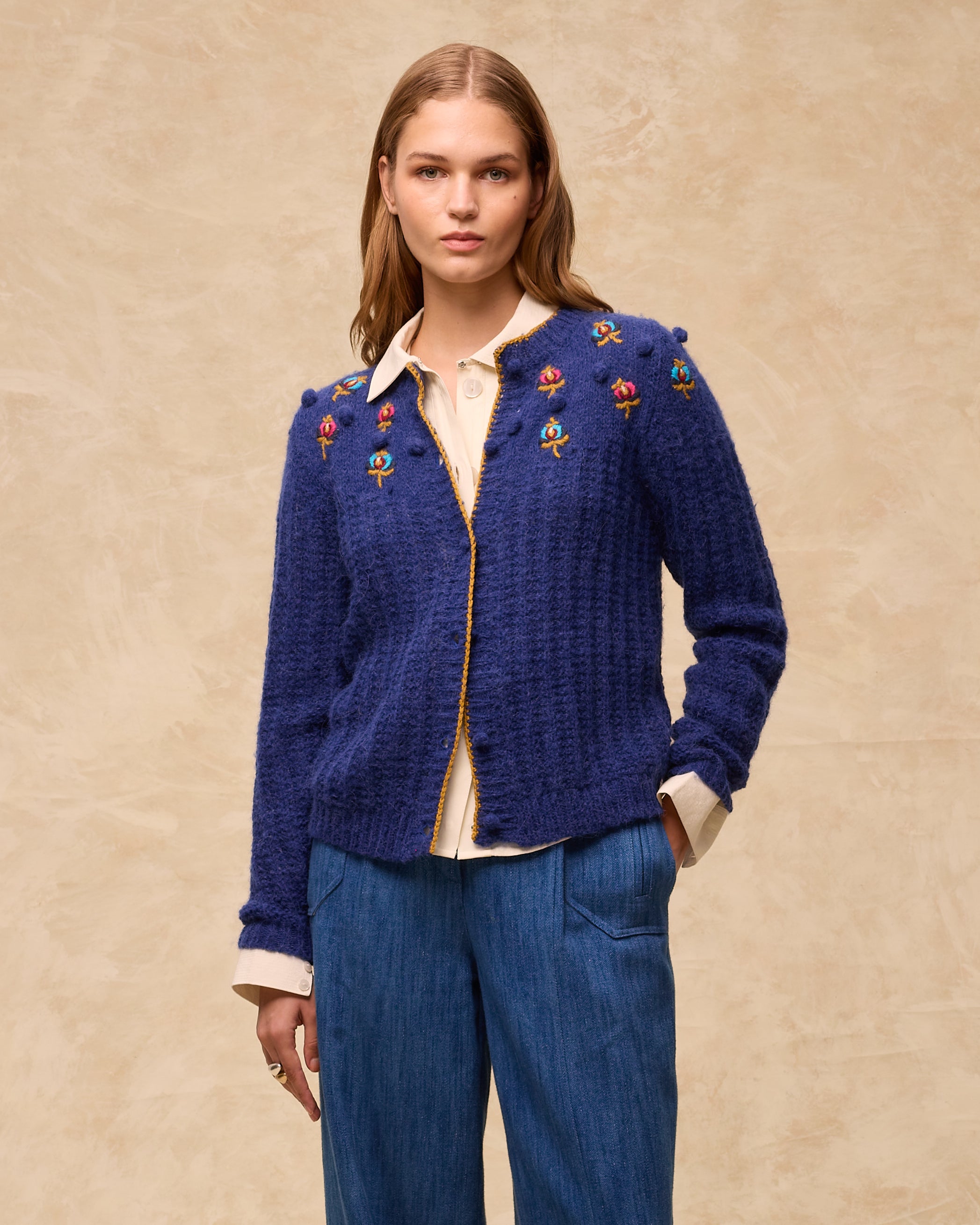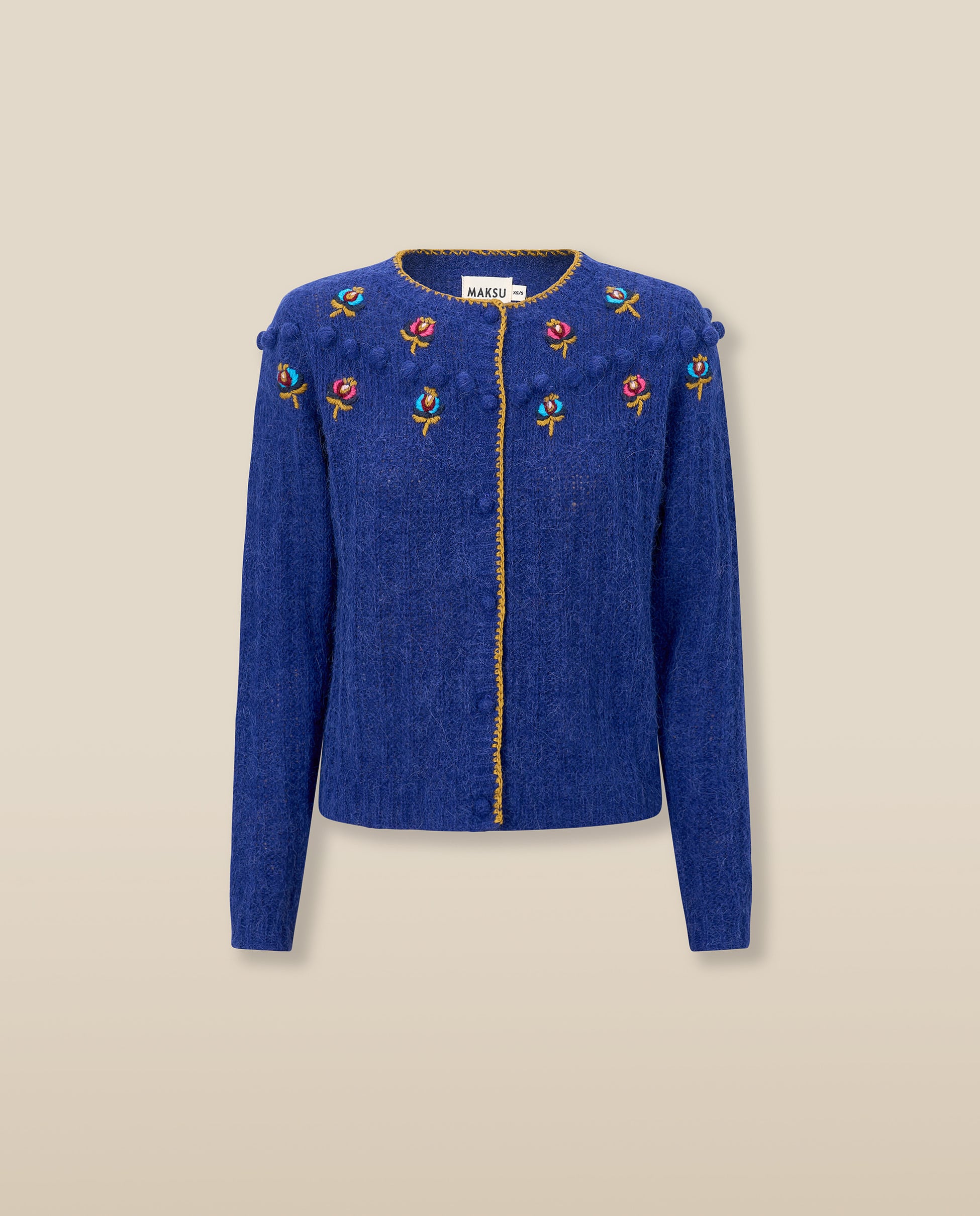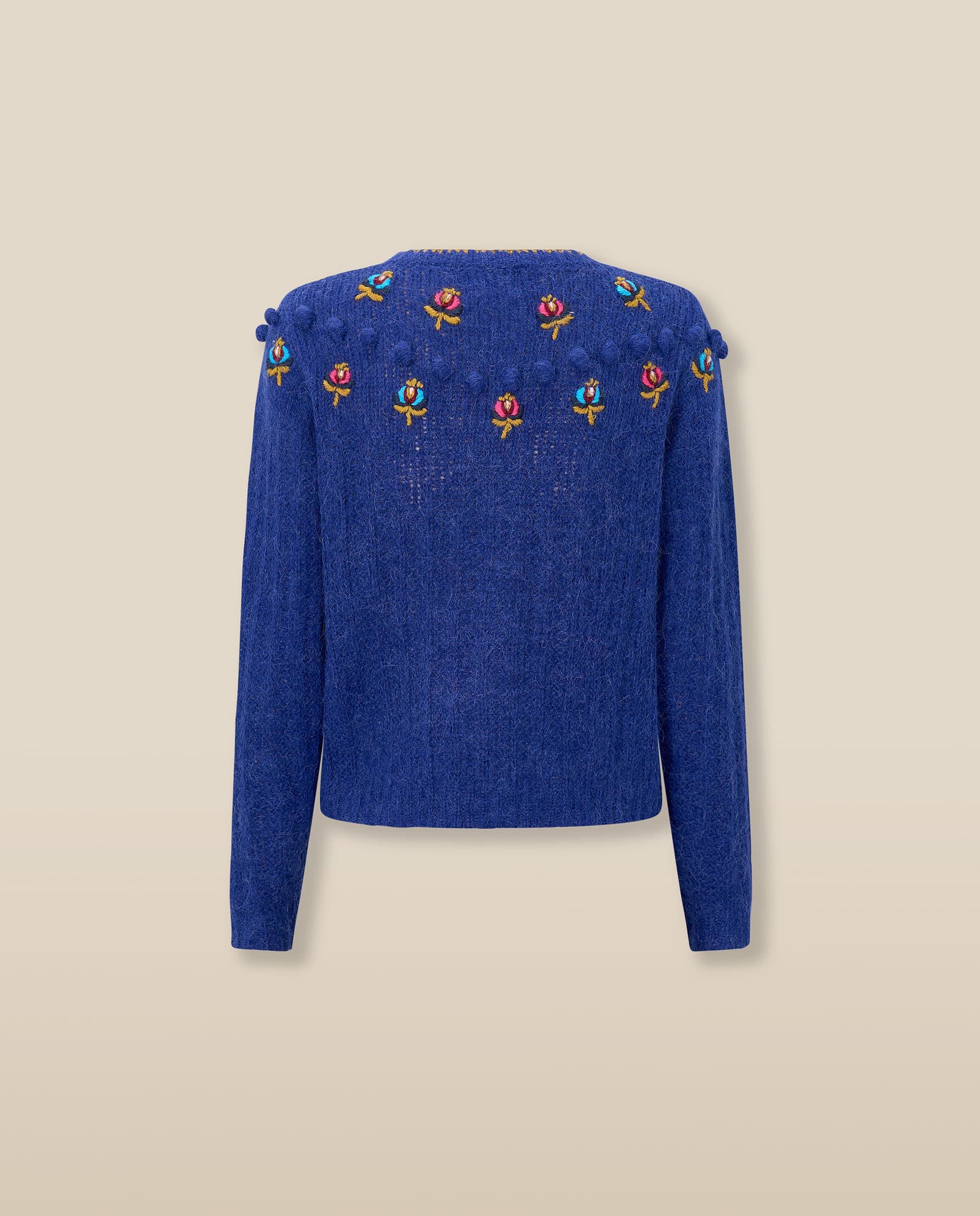 A rich blend of heritage and craft, the Miley cardigan is woven in a vibrant blue wool blend with intricate floral embroidery across the shoulders and chest. Its softly textured finish is enhanced with tonal pompom details and contrast crochet edging along the neckline and opening. Designed for layering, it features a lightly cropped silhouette with long sleeves and a clean open front.