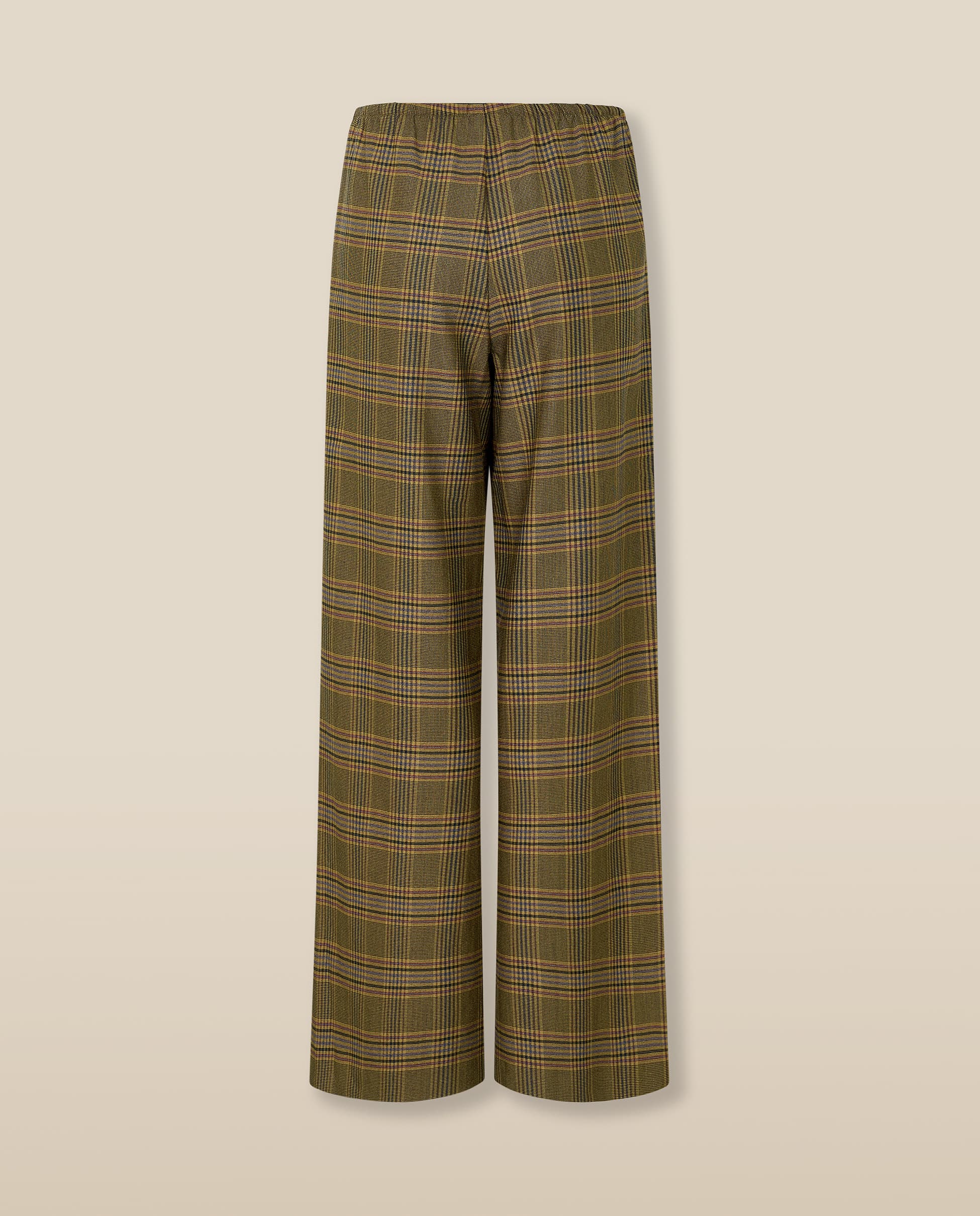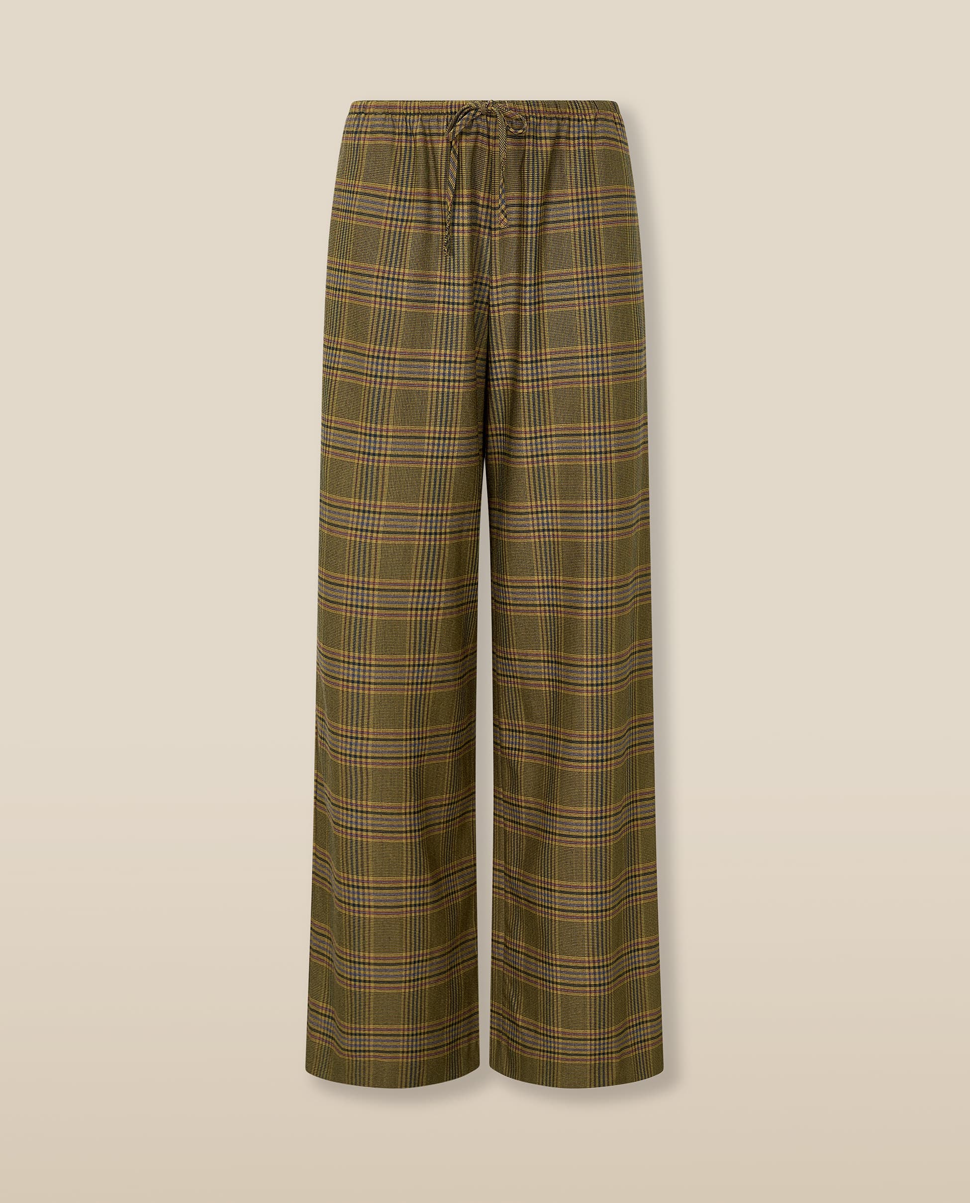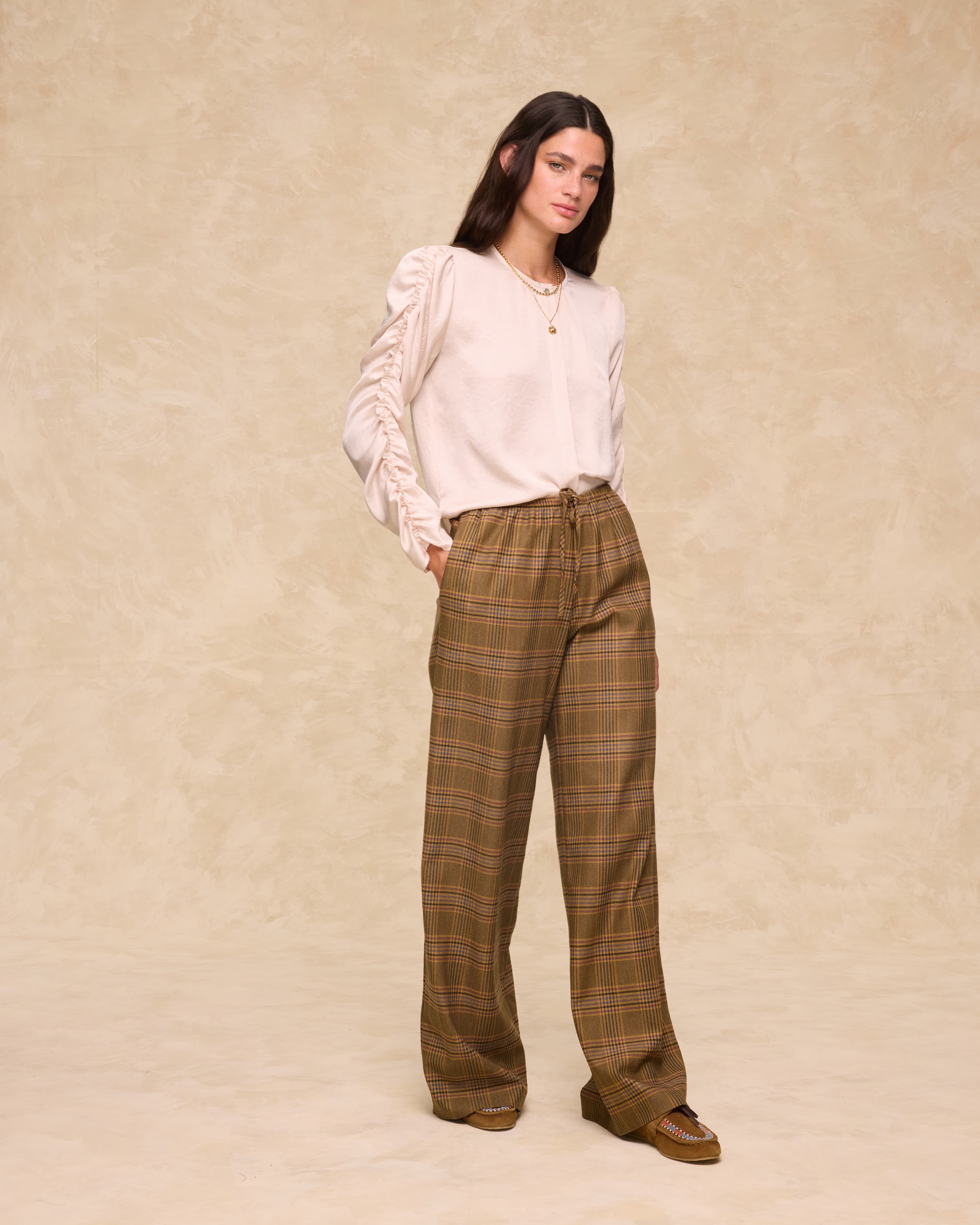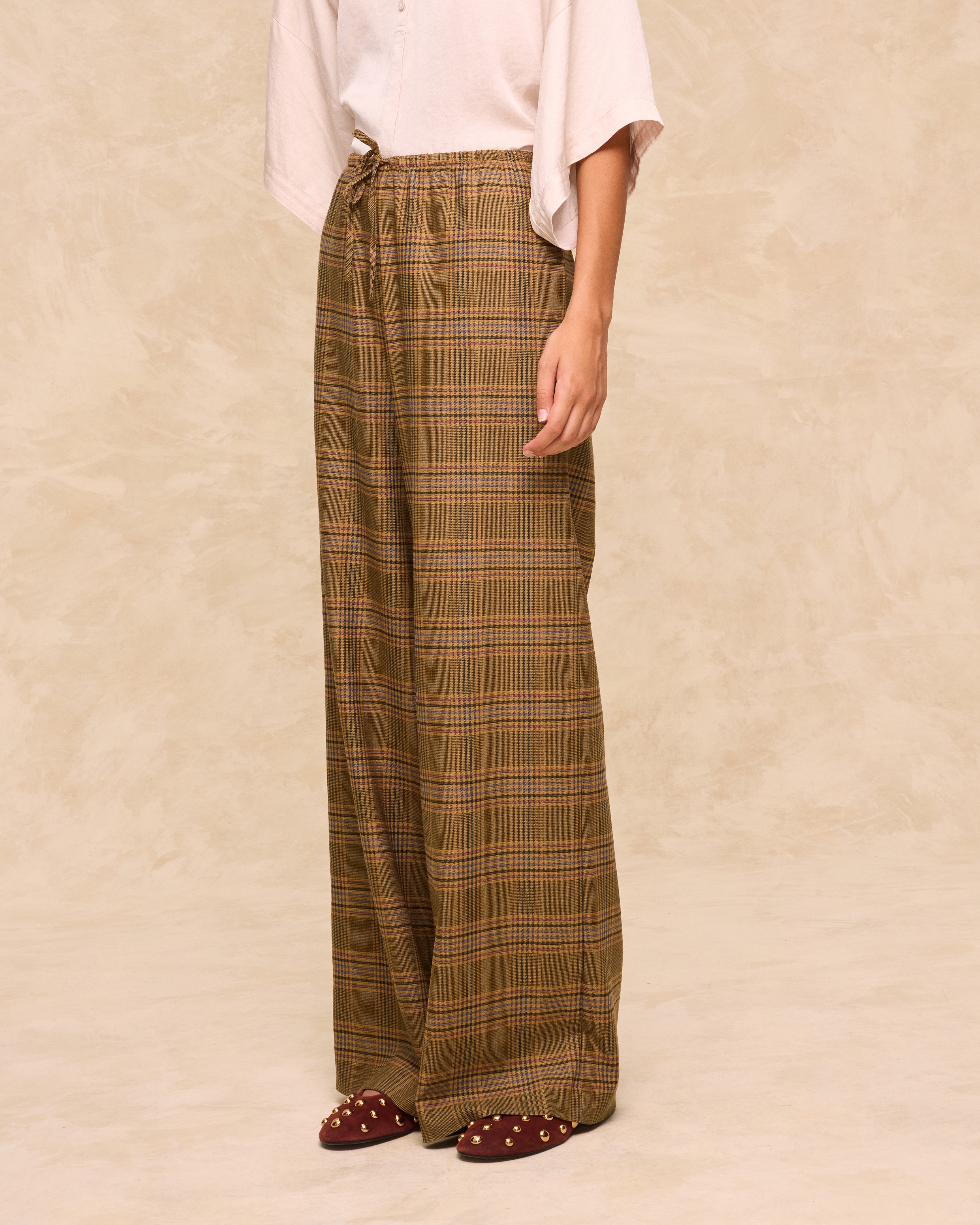 A relaxed essential in a refined check, the Henry trousers are crafted from Italian-woven fabric in rich mustard tones with soft violet and warm brown accents. They fall in a fluid wide-leg silhouette with a adjustable tie waistband. Side pockets add everyday ease, whether worn solo or styled with the matching Francine jacket.