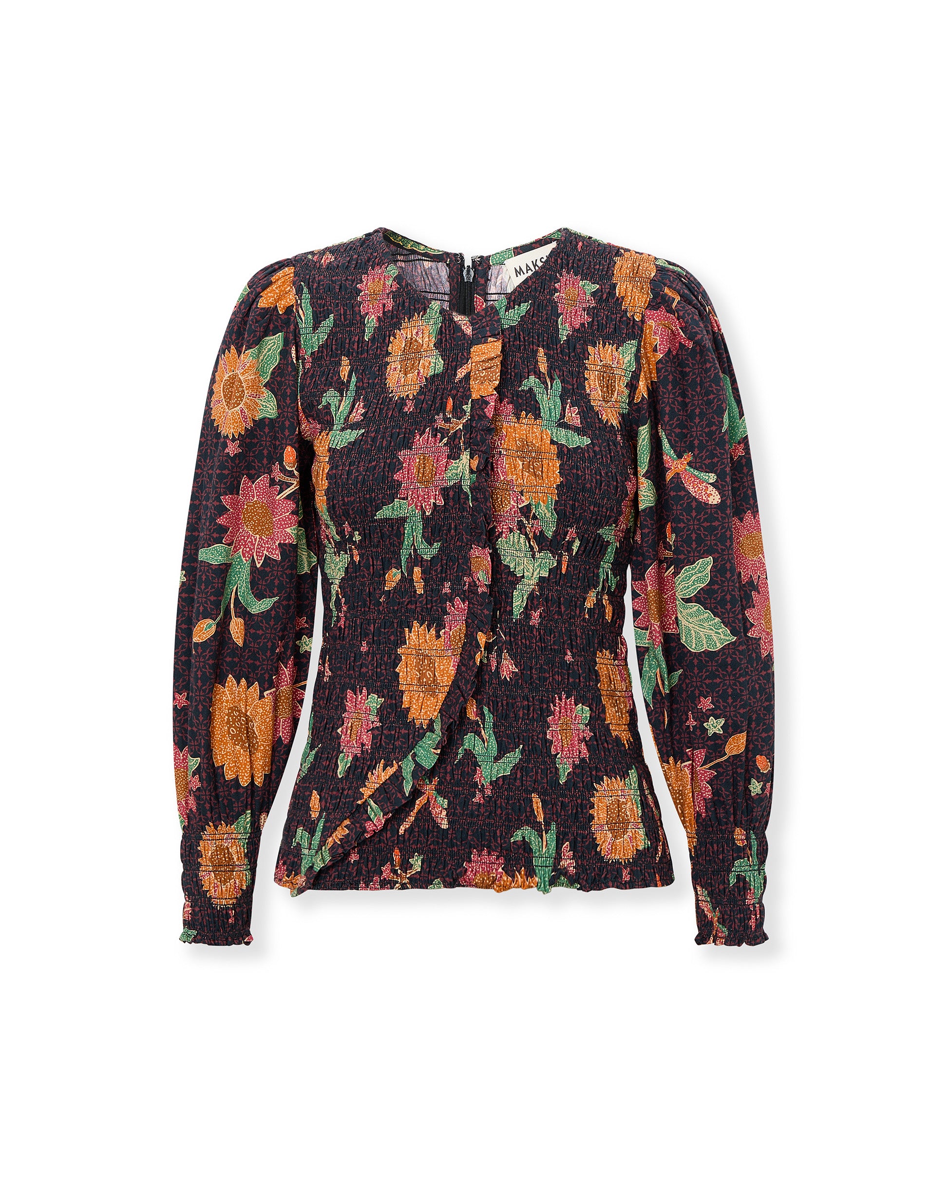 The Scarlet blouse blends a bold botanical motif with softly sculpted volume. Crafted from 100% cotton with a shirred finish, it features a soft round neckline, voluminous sleeves with gathered cuffs and a ruffled peplum hem that enhances the silhouette. A discreet zip at the back ensures a smooth fit.