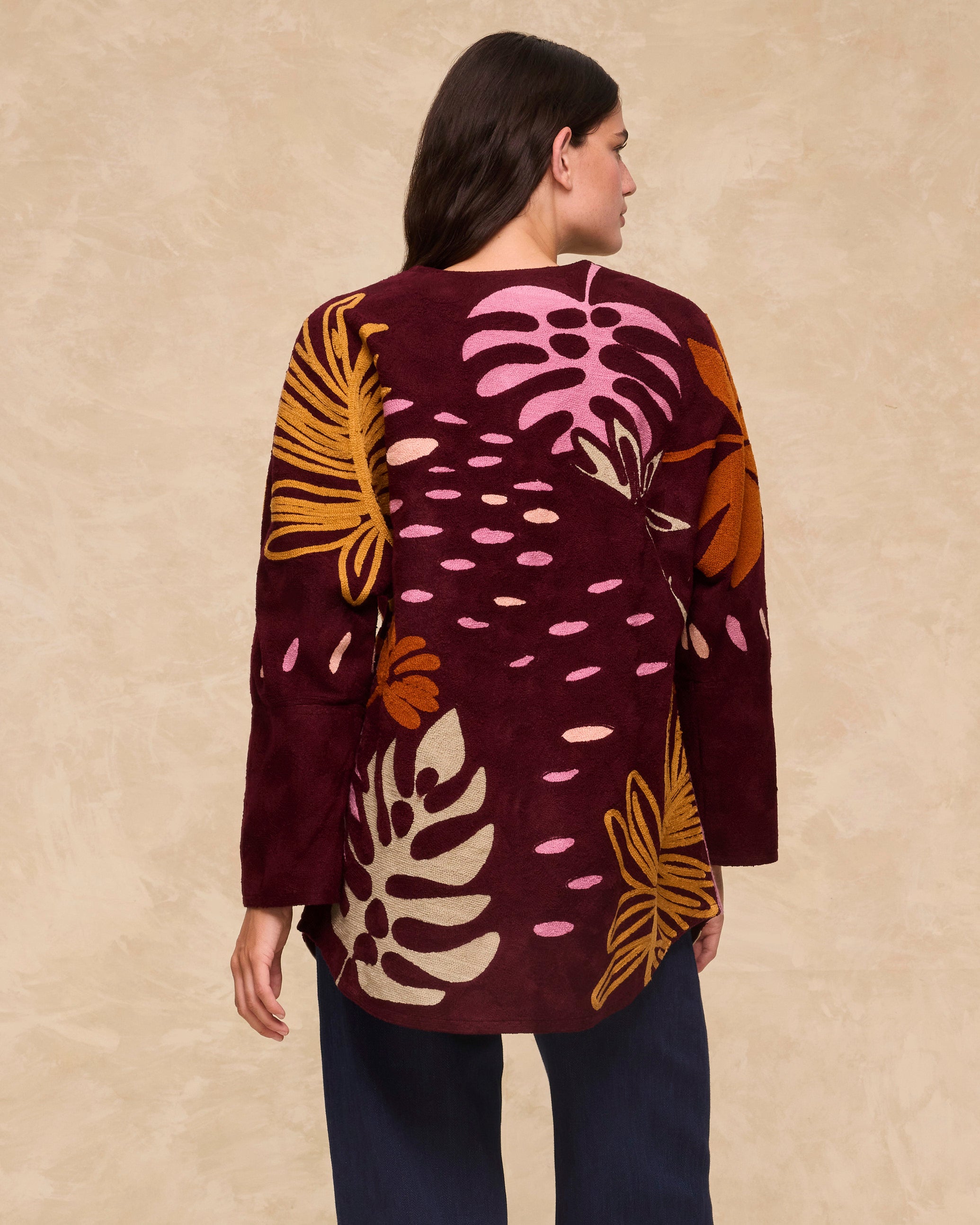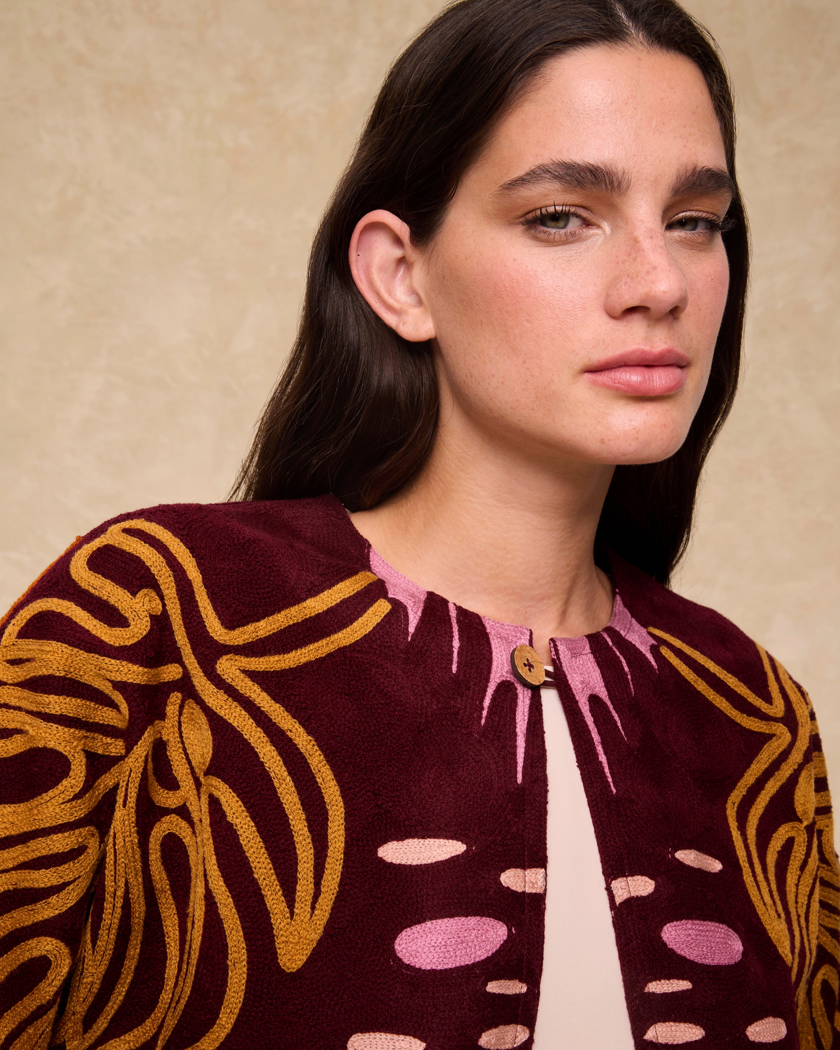 Rich in texture and colour, the Arrecife coat is crafted from 100% cotton and detailed with oversized botanical embroidery in contrasting tones. Cut to a relaxed, collarless silhouette, it fastens at the neckline with a single natural wood-style button and is designed to layer easily over any outfit. • Bold botanical embroidery in ochre, pink and terracotta tones • Relaxed, open silhouette with rounded neckline and single button fastening • Made from 100% cotton with a softly structured feel
