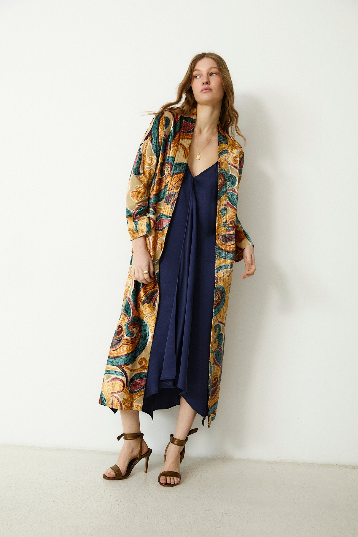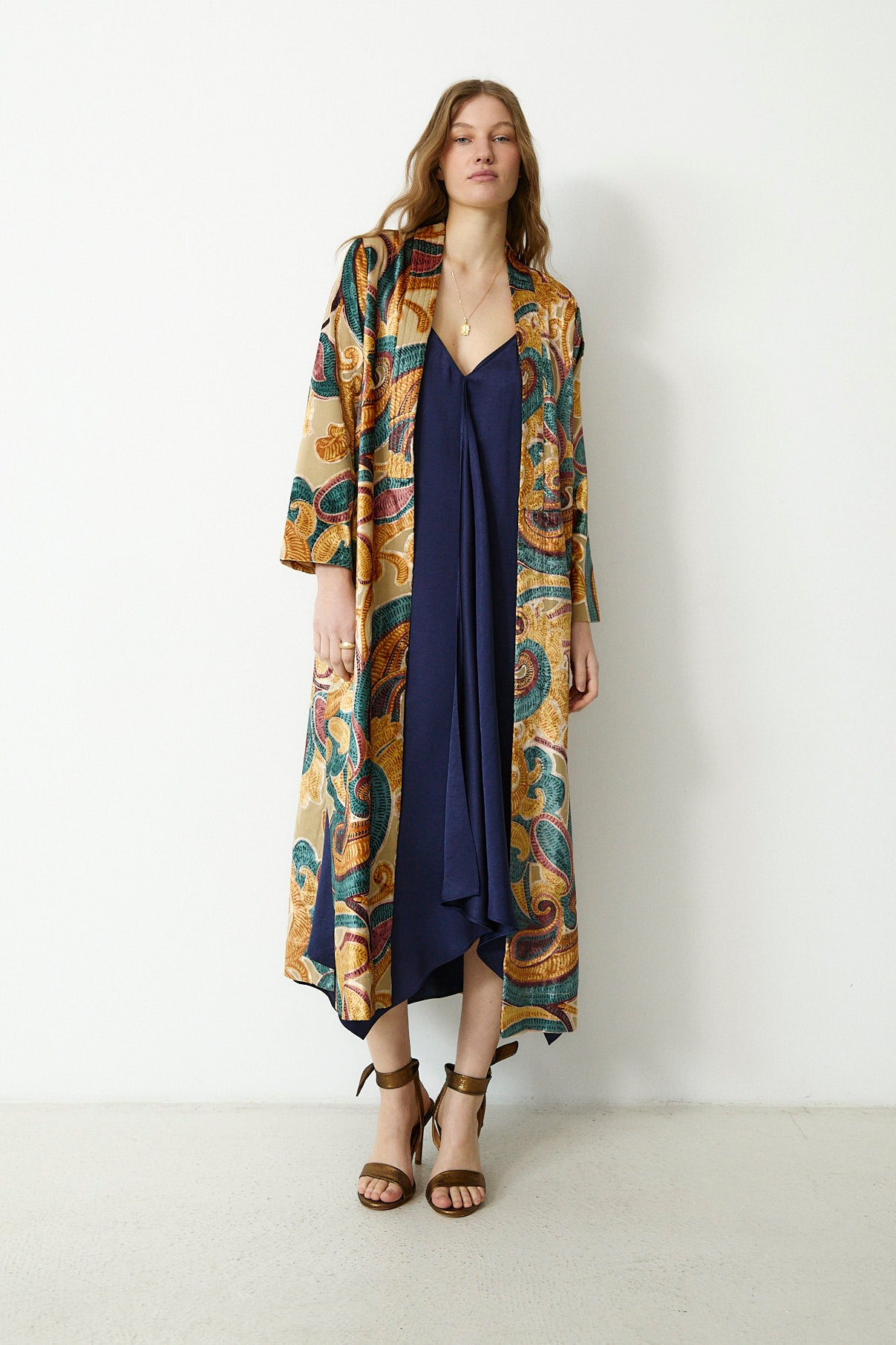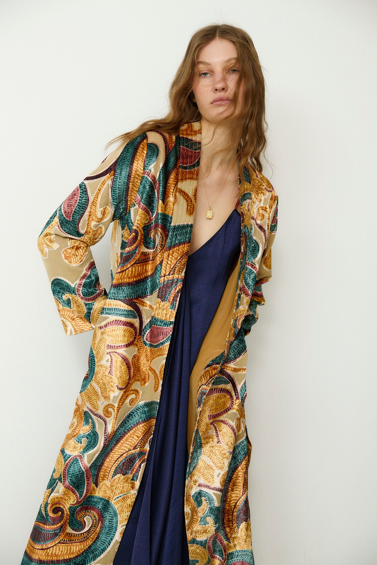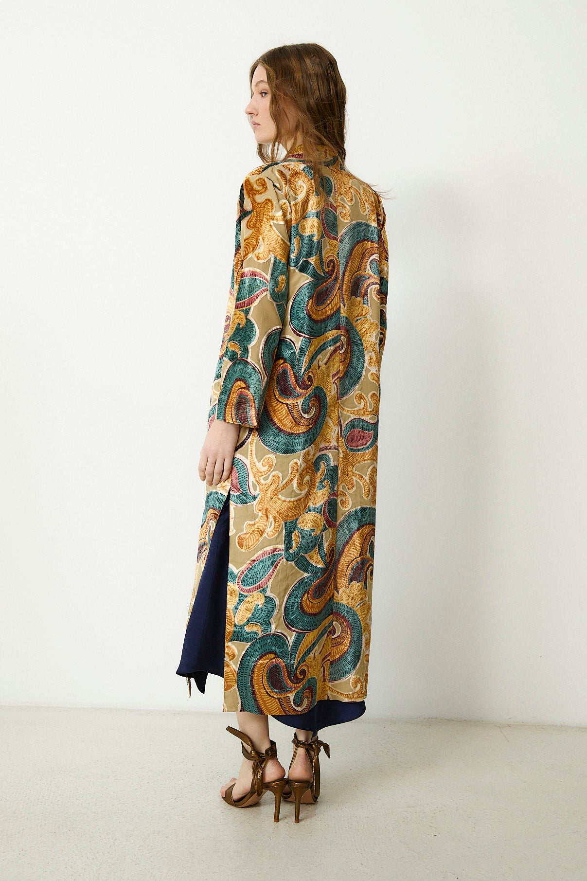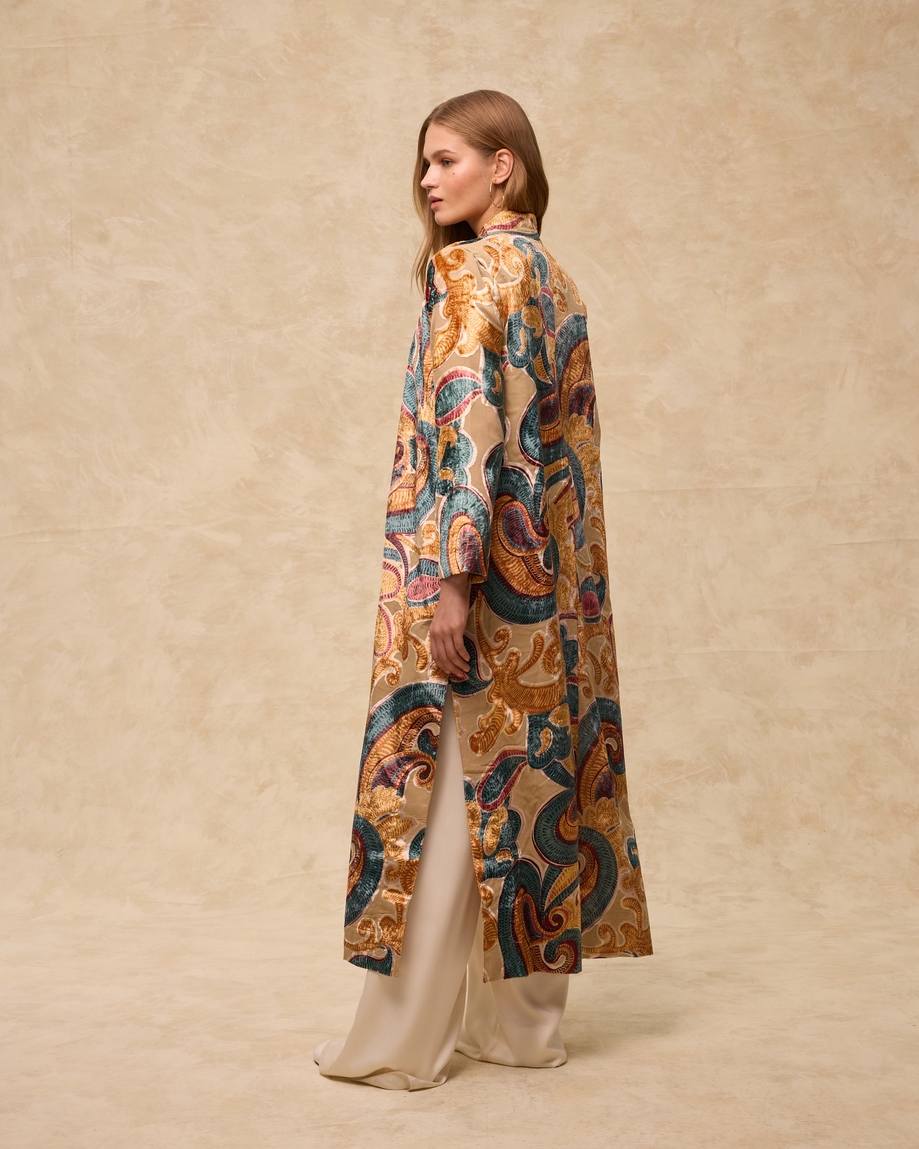 A statement in both texture and colour, the Cianita Kimono features an expressive swirling motif in rich jewel tones. Designed in a relaxed, open silhouette, it falls fluidly to the ankle with wide sleeves and a softly structured drape. The golden beige base is contrasted by intricate embroidery in teal, plum and ochre, creating a bold yet elevated finish.
