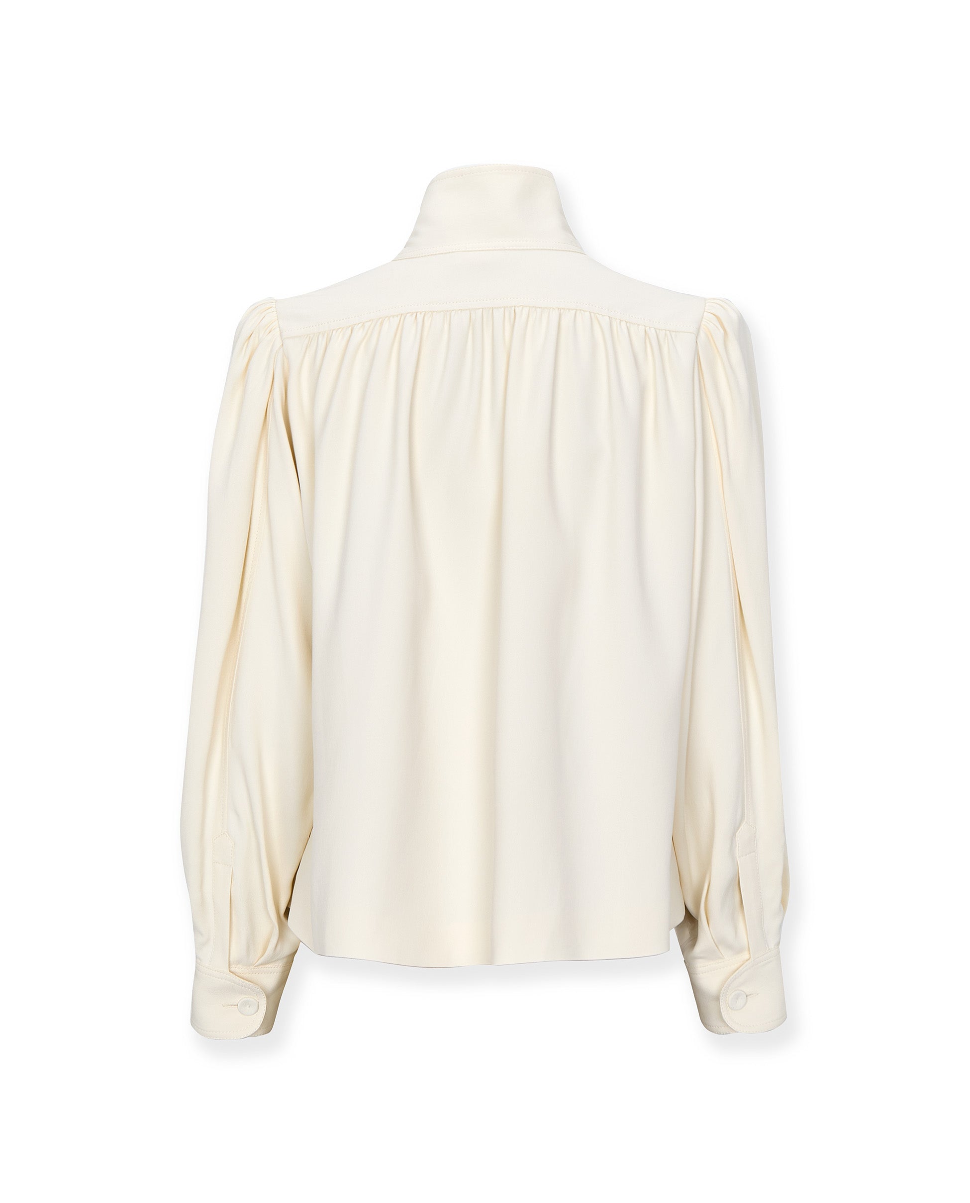 • Gathered shoulders and voluminous sleeves for soft structure