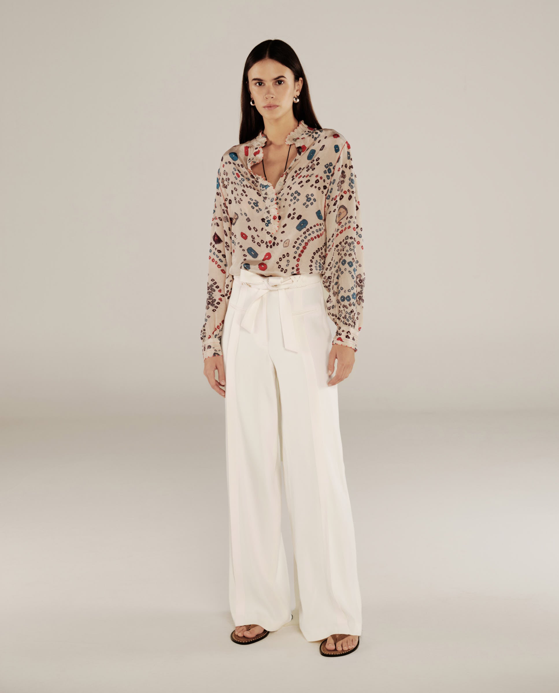 The Parul Trousers in cream are an elegant and sophisticated wardrobe essential, designed to be both timeless and versatile. Showcasing a high-rise waist and a flowing palazzo silhouette, they embody MAKSU's modern approach to tailored separates. Intricate braided detailing on the waistband adds an artisanal touch, while the structured yet fluid fabric ensures graceful movement from day to night.