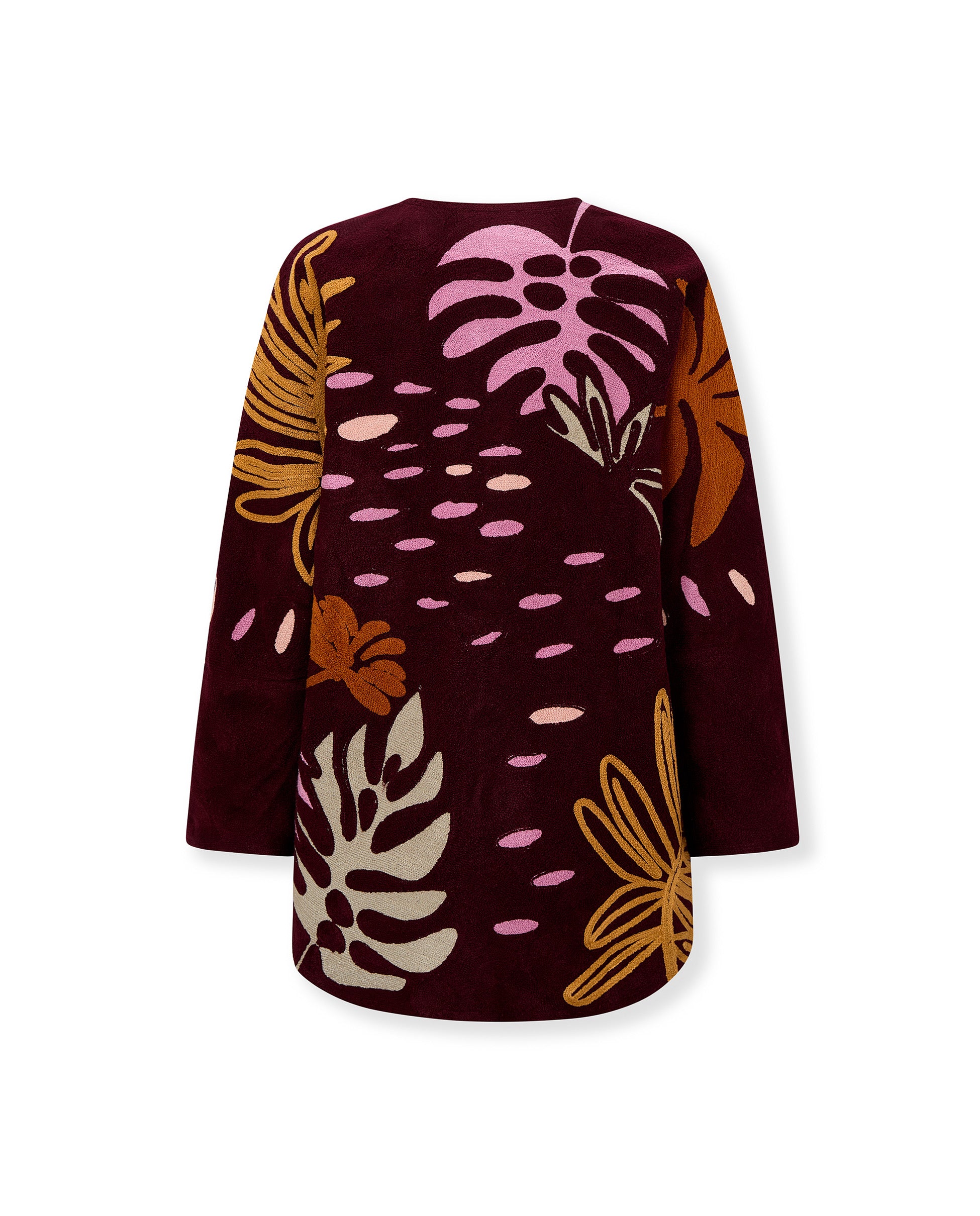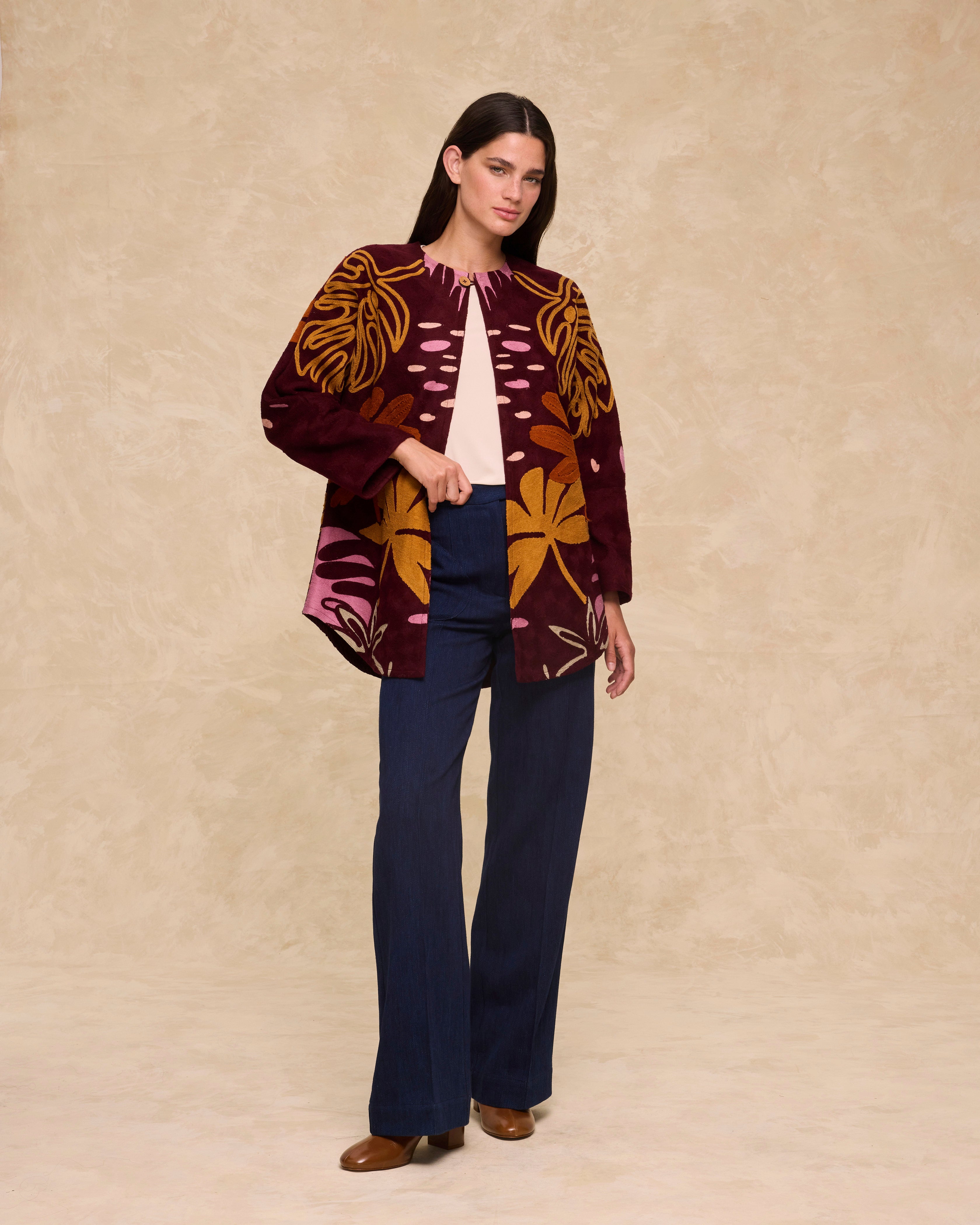 Rich in texture and colour, the Arrecife coat is crafted from 100% cotton and detailed with oversized botanical embroidery in contrasting tones. Cut to a relaxed, collarless silhouette, it fastens at the neckline with a single natural wood-style button and is designed to layer easily over any outfit.