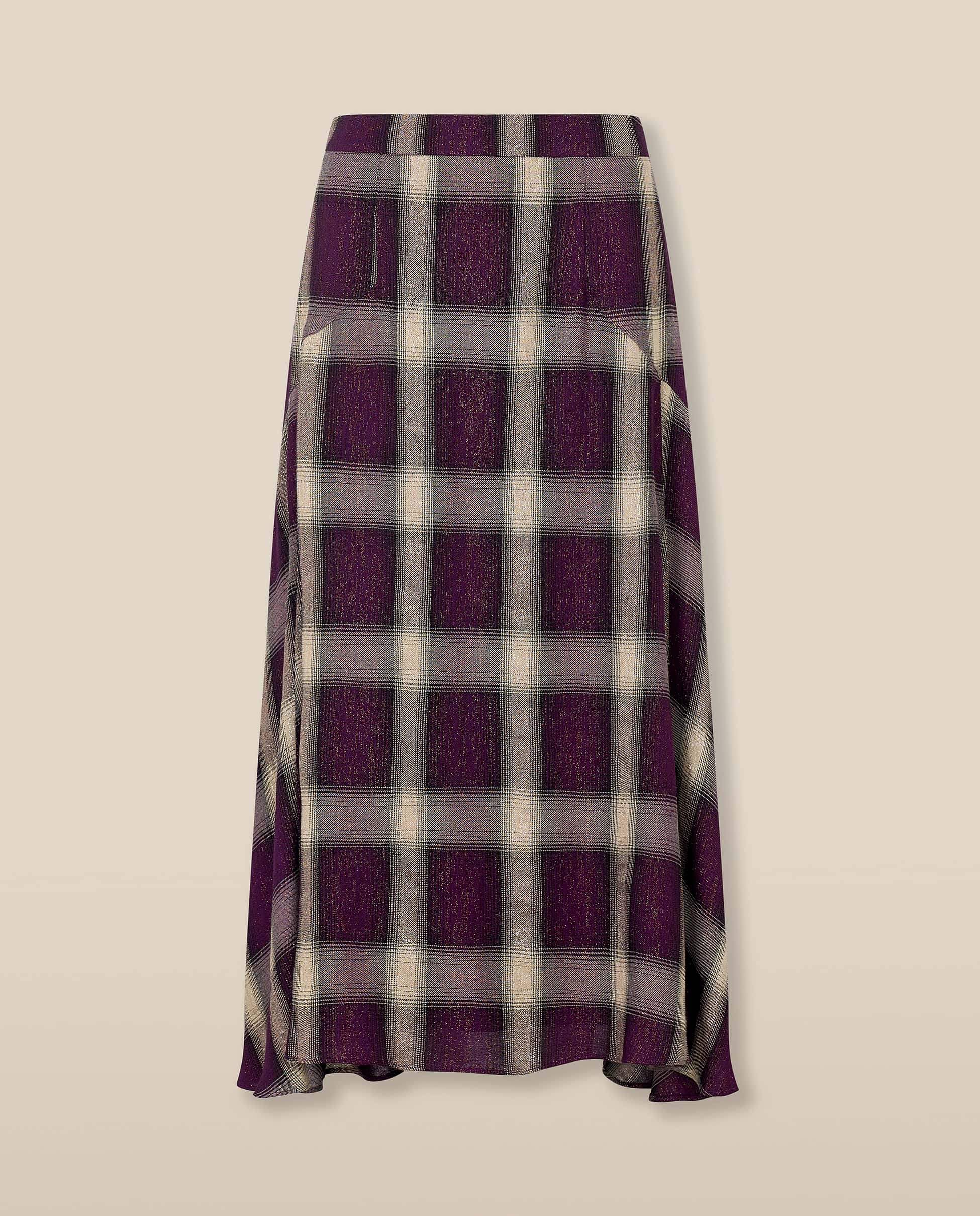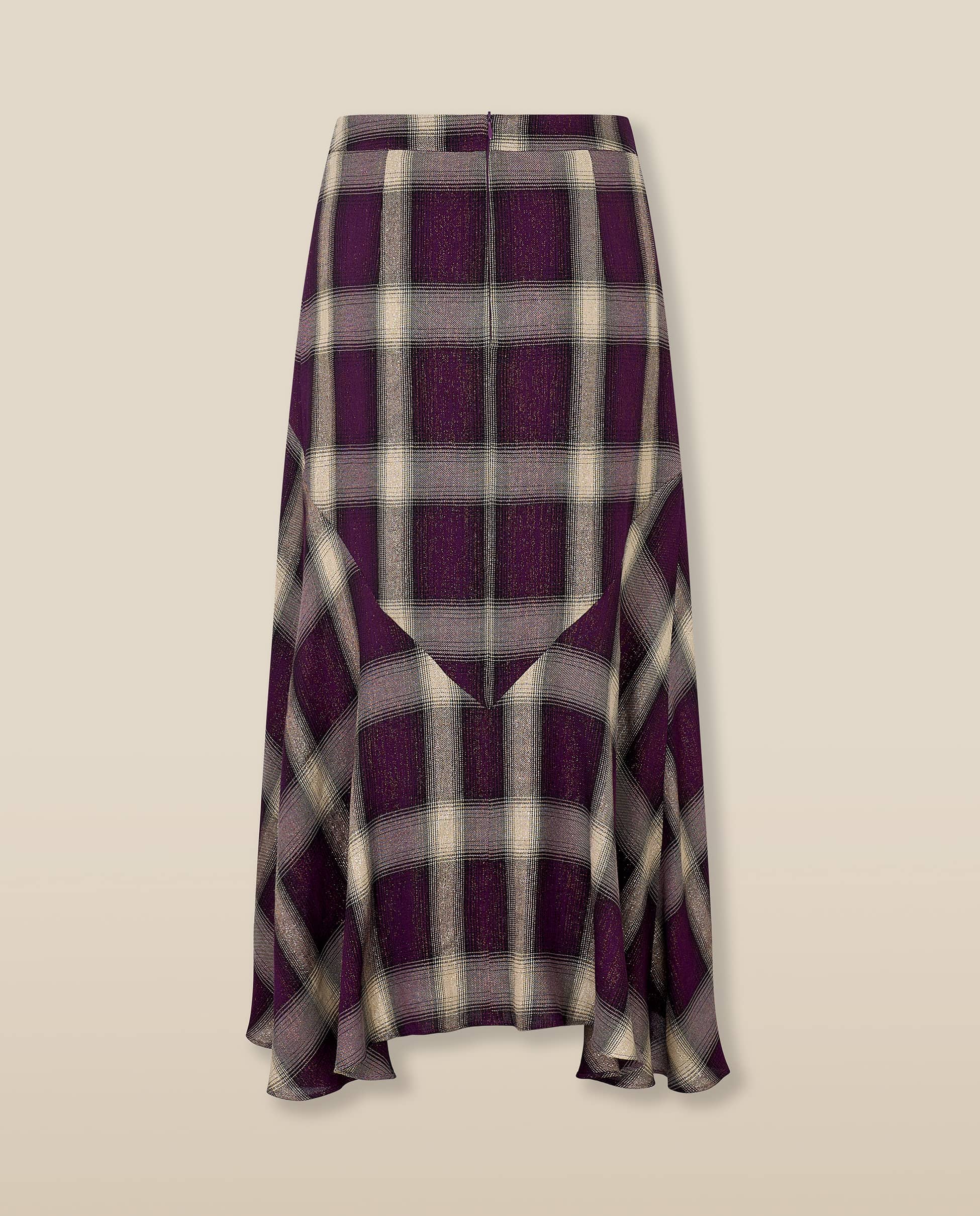 Crafted from Italian check fabric with a golden shimmer, the Arianne Skirt is cut to a flowing A-line silhouette that skims the body with ease. The midi-length hem dips slightly at the sides for a subtle, fluid shape, while the bold aubergine check adds richness and depth. Finished with a clean waistband and concealed zip at the back for a polished look.
