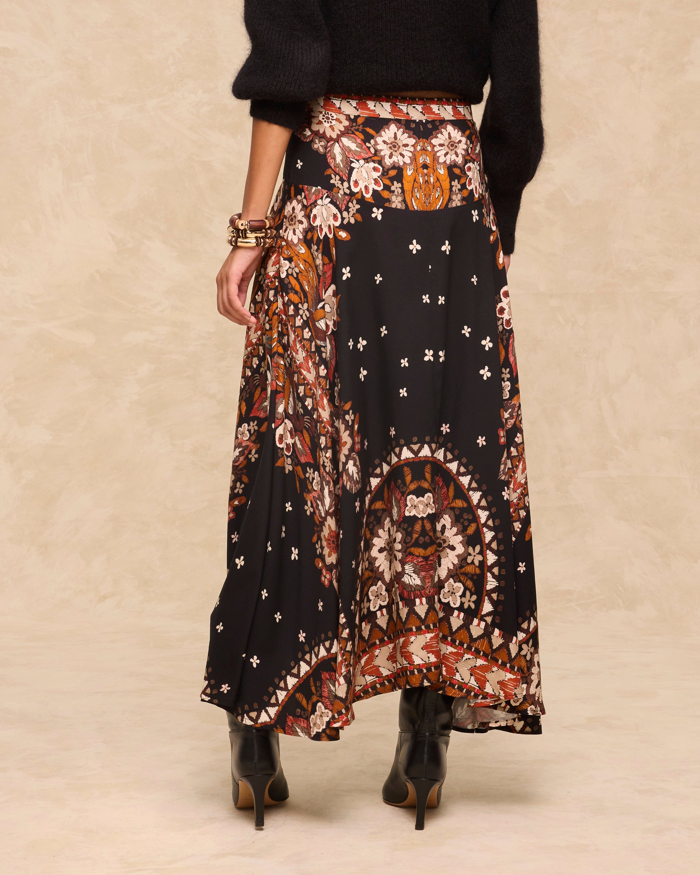 DELPHINE | Black Paisley Floral Print Midi Skirt