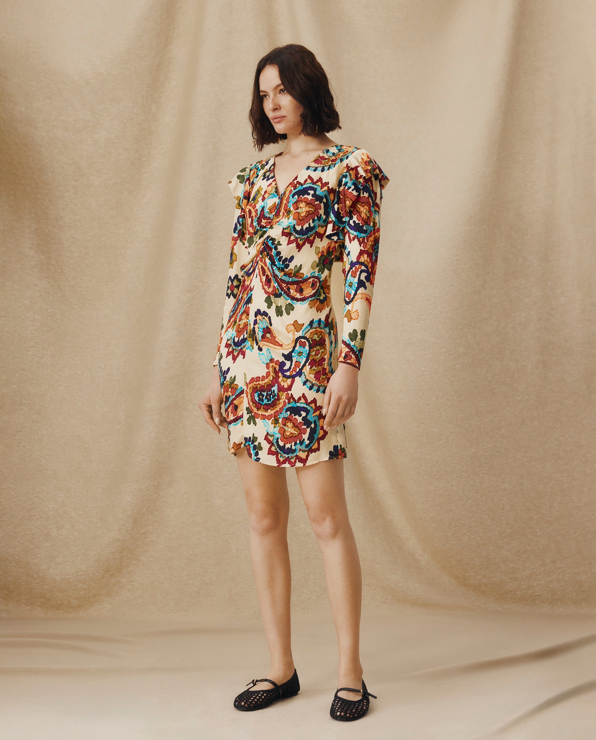 SALENA | Cream Multi Ruche Detail V-Neck Short Dress