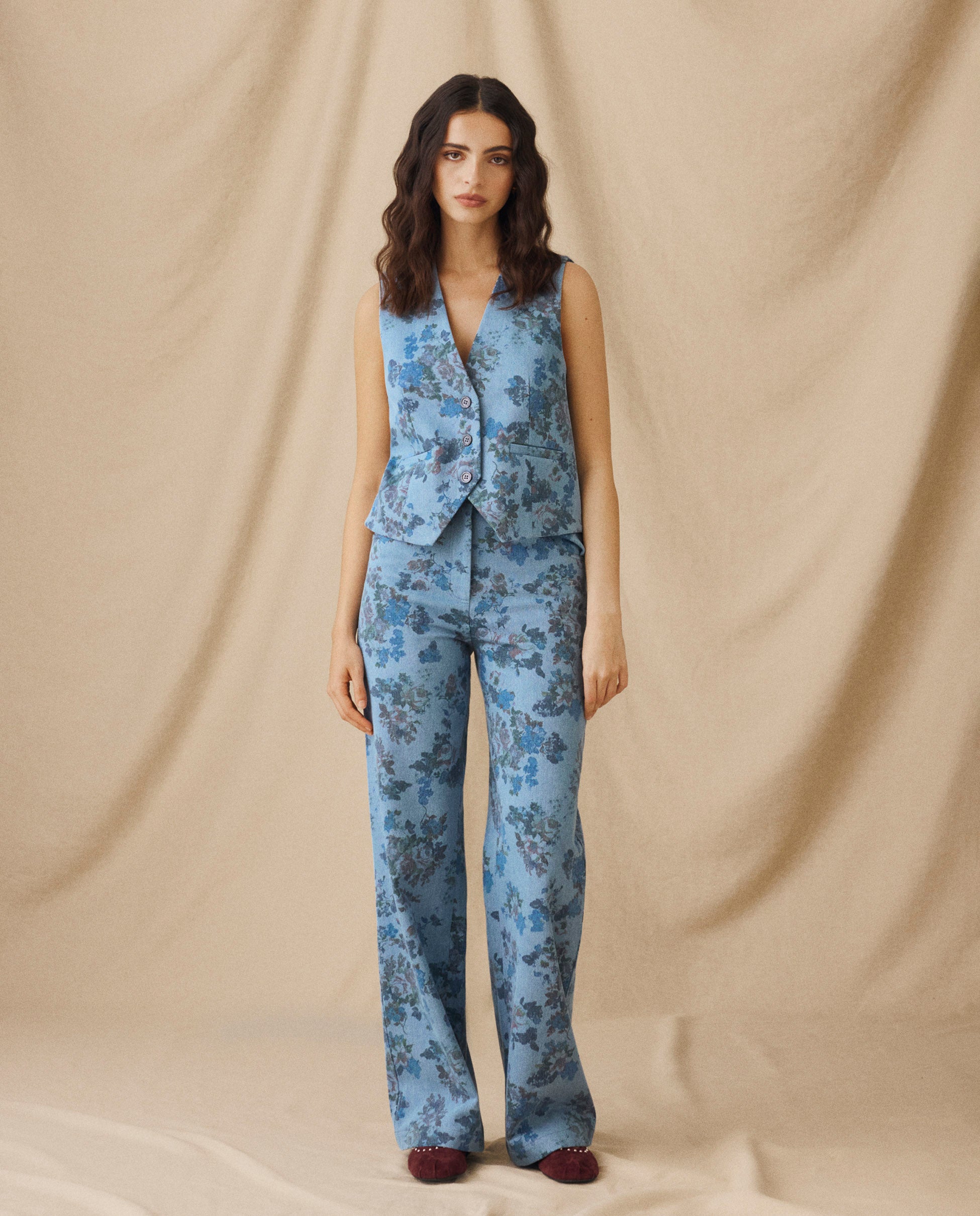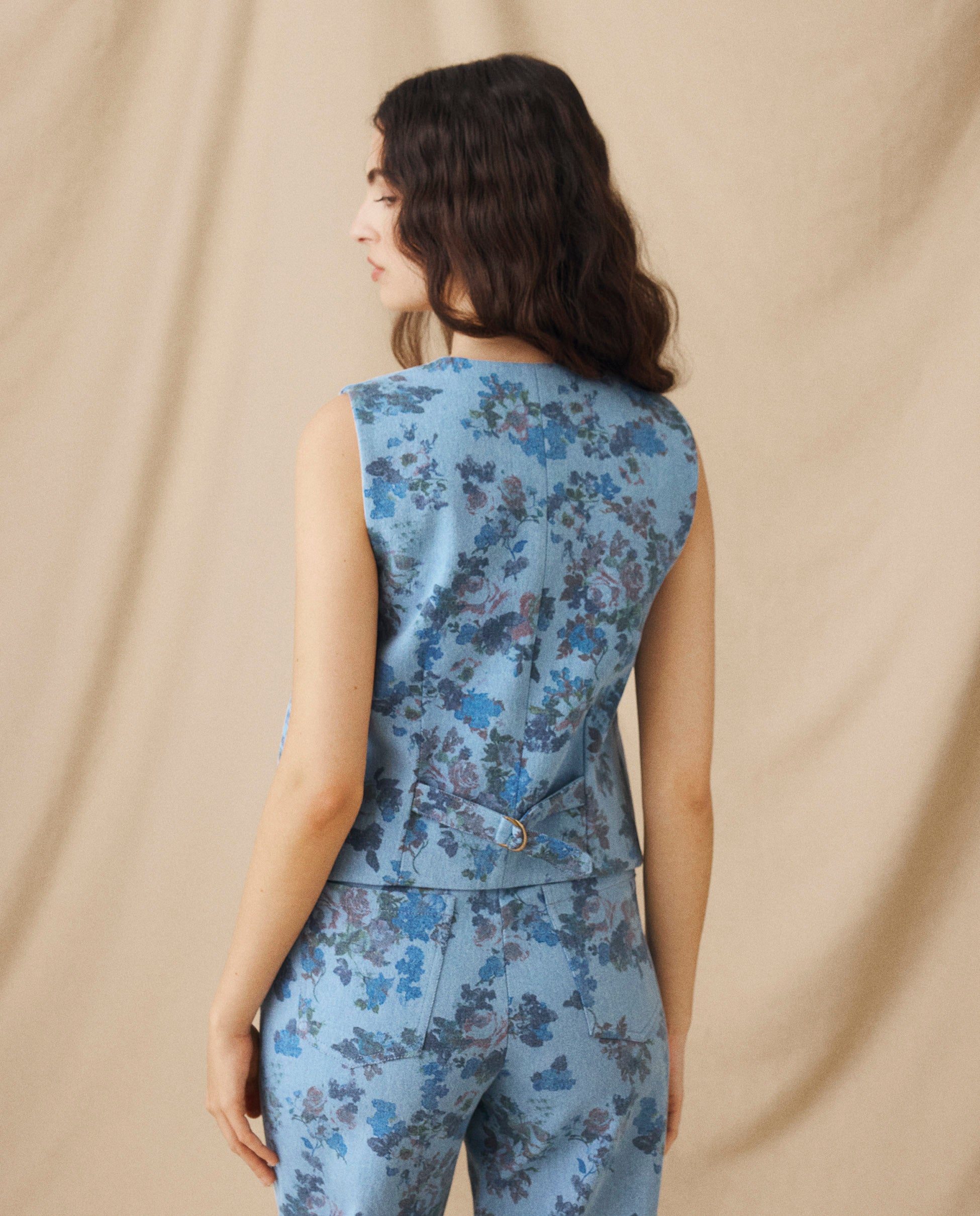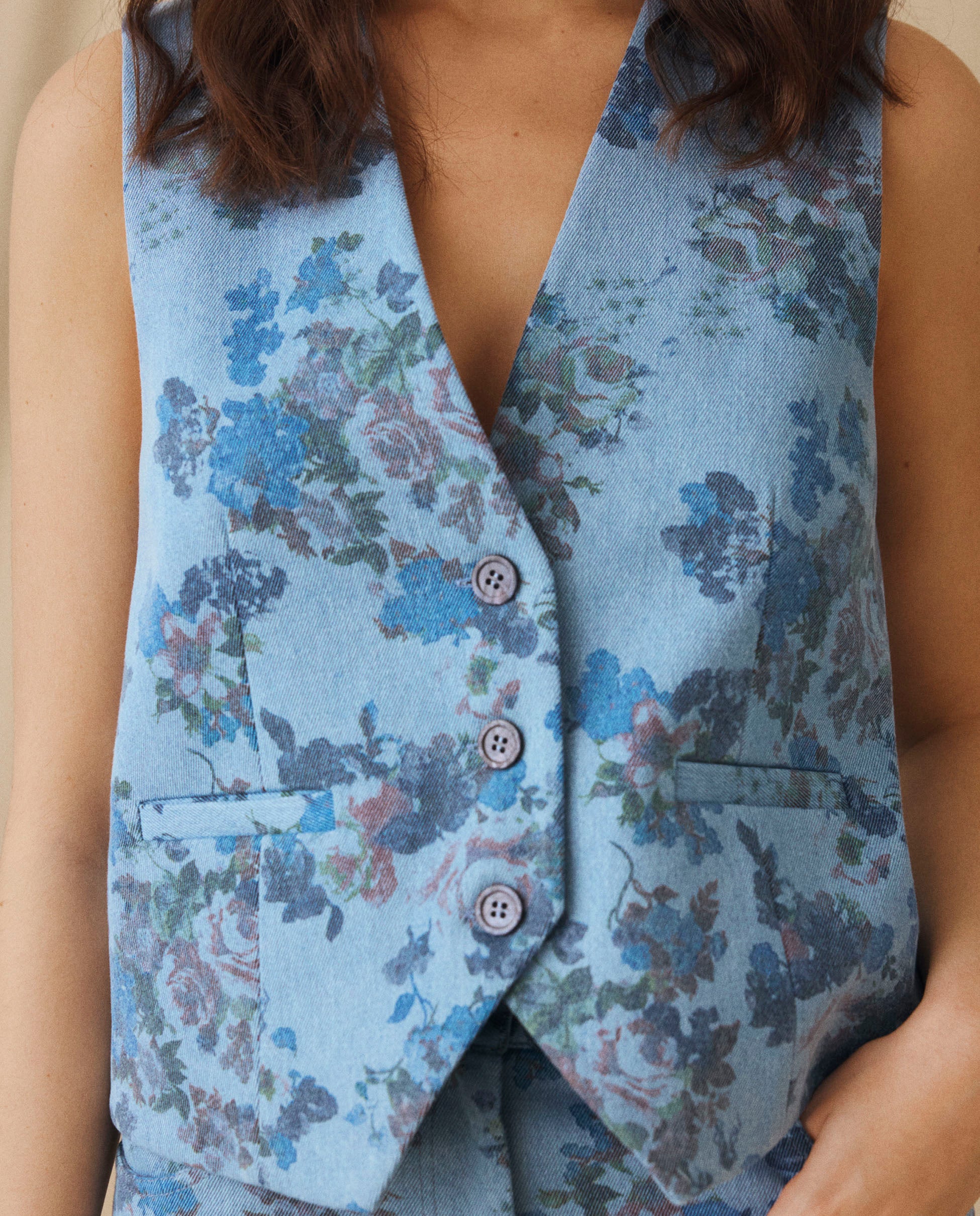 Tailored from 100% cotton with a floral print, the Connie Vest blends vintage charm with modern edge. Cut to a structured silhouette, it features a deep V neckline, button fastening, and a back tab with D-ring detail for subtle shaping. Pair with the matching trousers for effortless coordination.