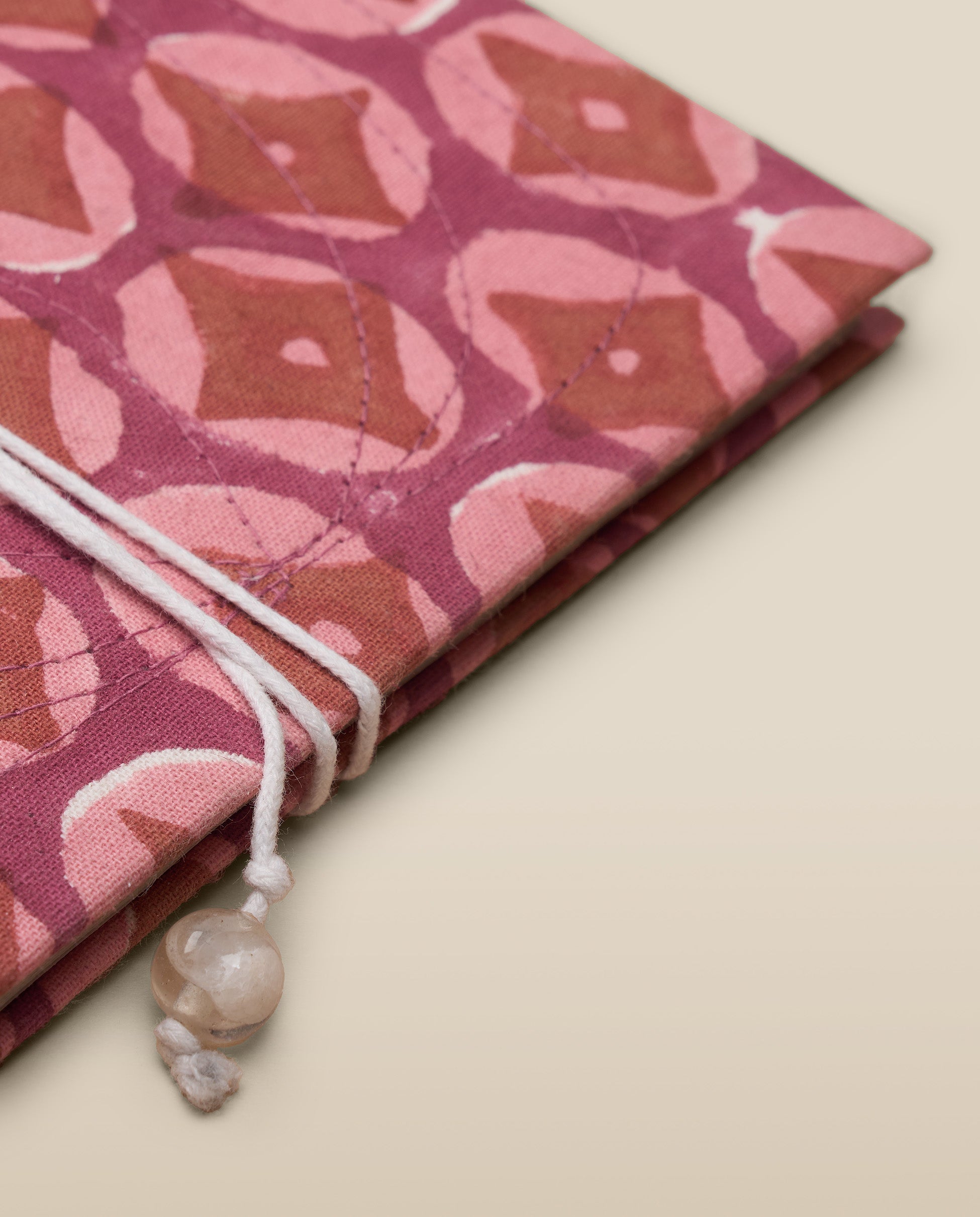 A joyful twist on everyday stationery. Printed with a bold geometric floral motif in shades of pink and rust, this softbound notebook is finished with tonal stitch detailing and a tie closure with glass bead accent. The cover is crafted from recycled, handmade paper, while the inside holds 60 blank pages of smooth bleached 90 GSM paper—perfect for everyday notes, sketches or journaling.