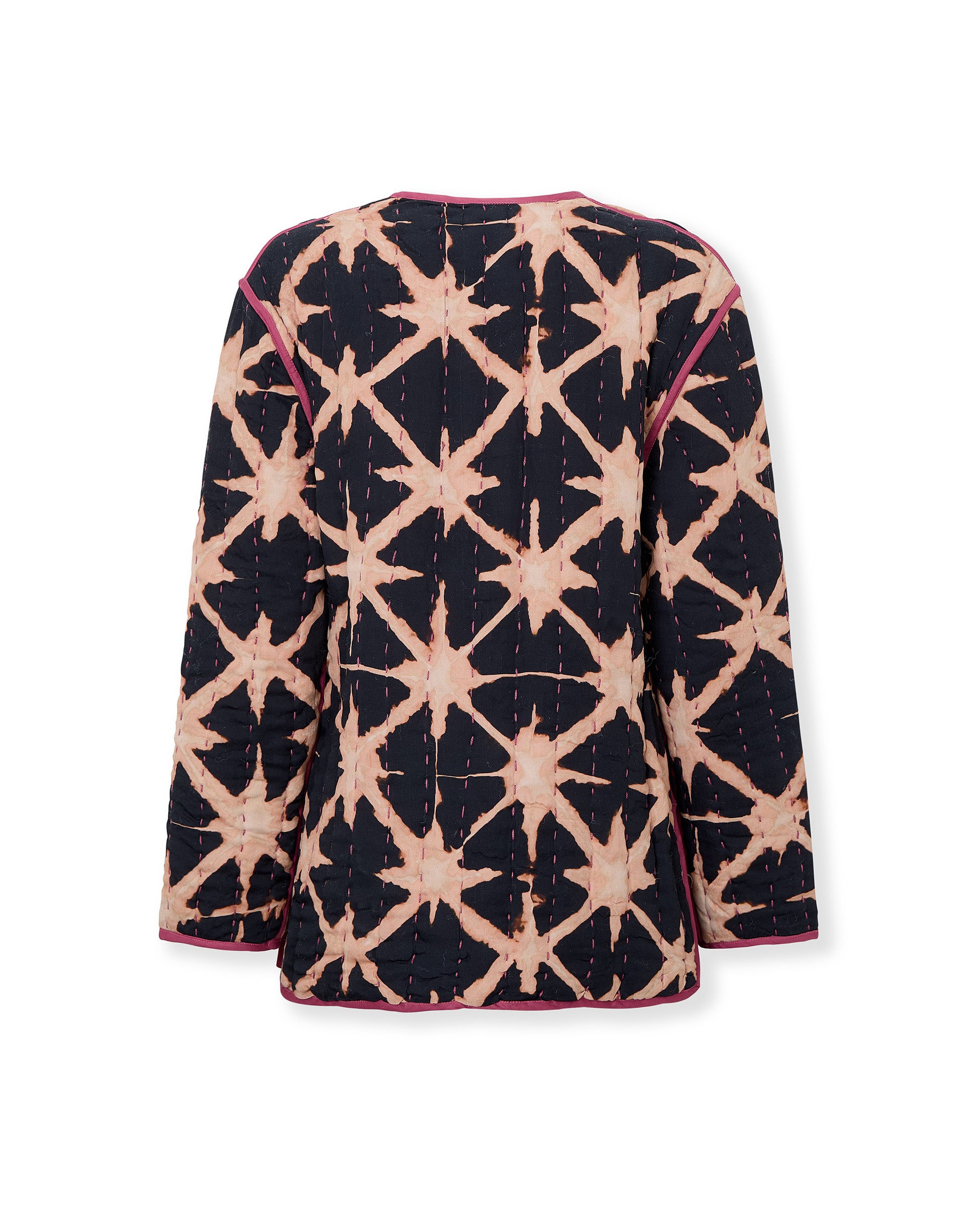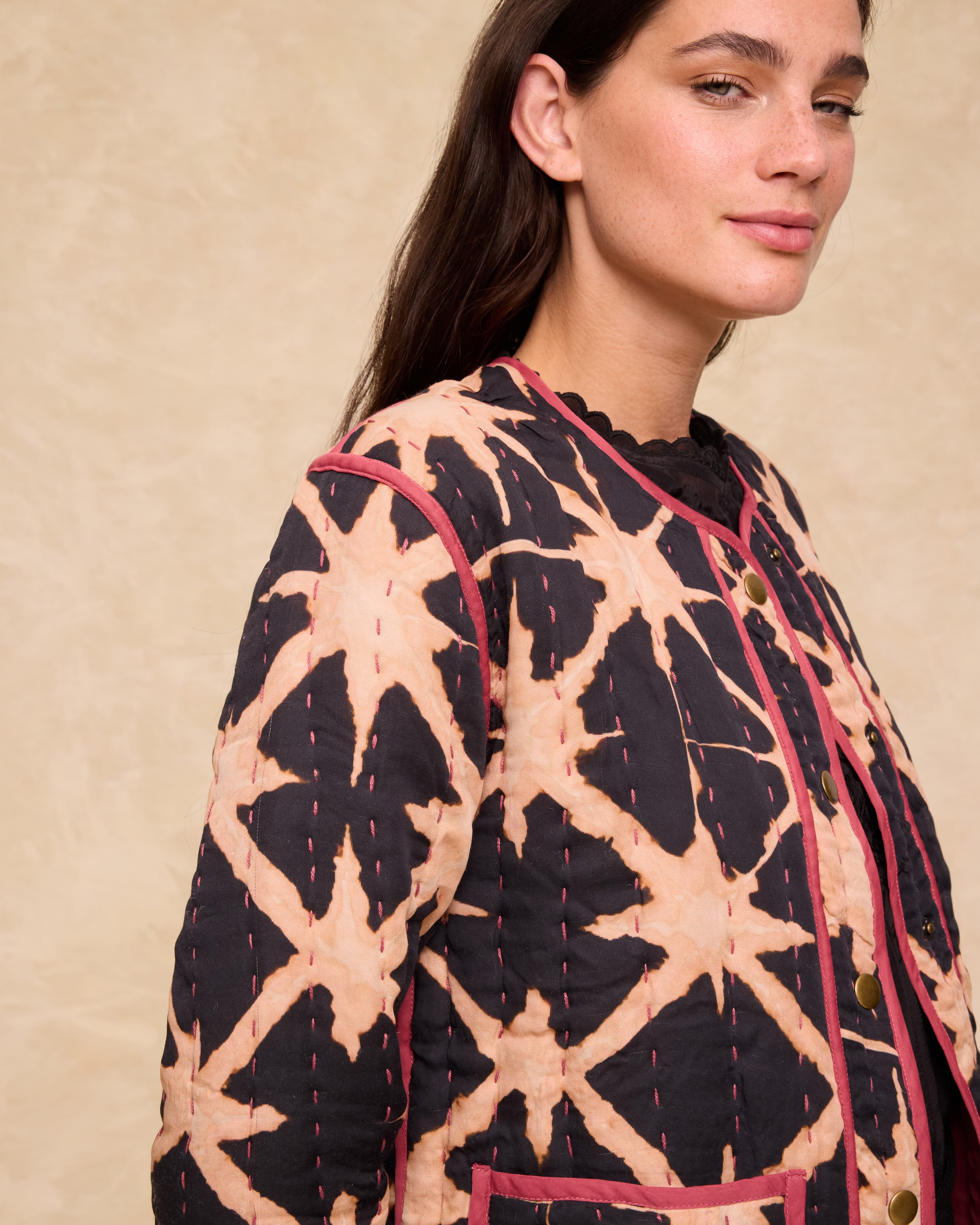 A bold statement in texture and pattern, the Estrella coat is crafted from a lightweight viscose-modal blend and padded for subtle volume. Its star-inspired motif is framed by contrast piping and finished with tactile topstitching throughout. A rounded neckline, gold-tone snap buttons and patch pockets complete the artisanal feel.