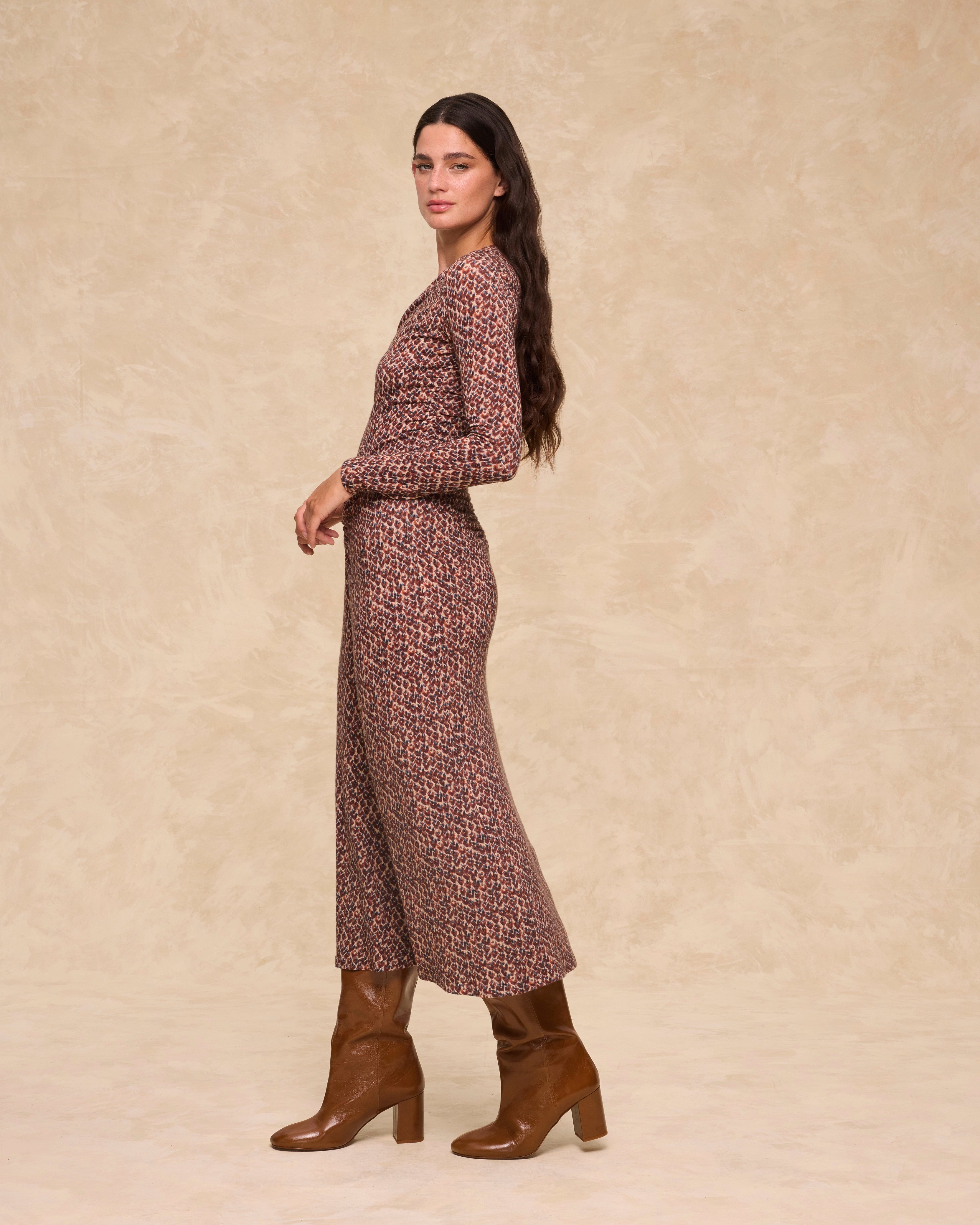 The Marissa Skirt moves fluidly with every step, designed with a ruched centre seam that flatters the waist before flowing into a soft midi hem. Its tonal rust print adds depth and texture, perfect for both refined coordination or effortless contrast.