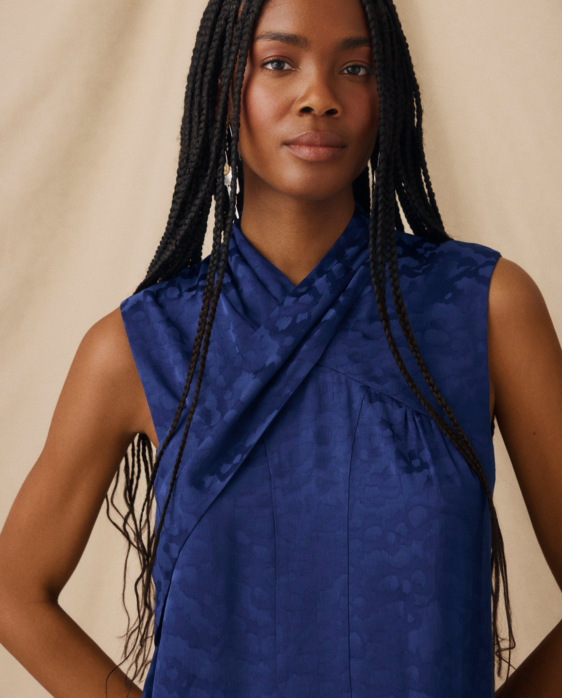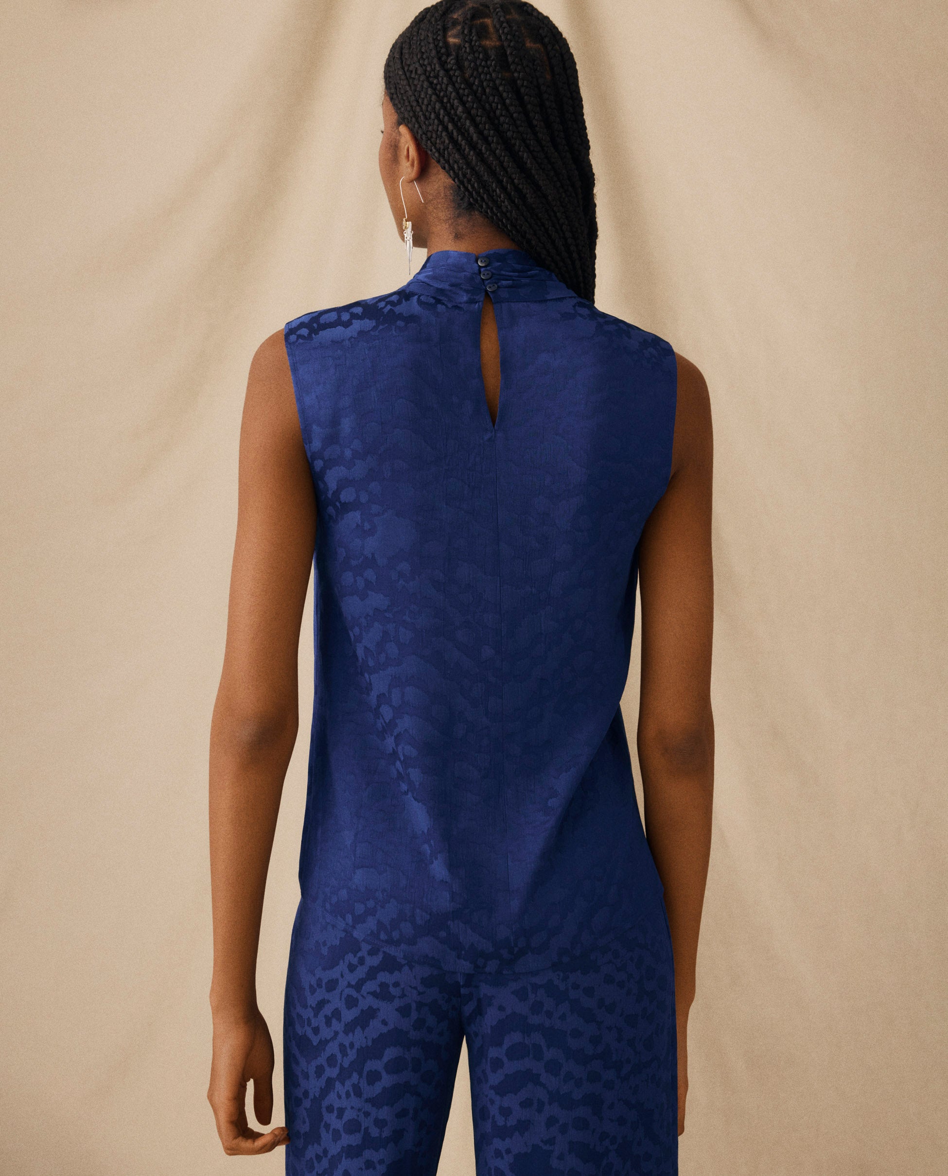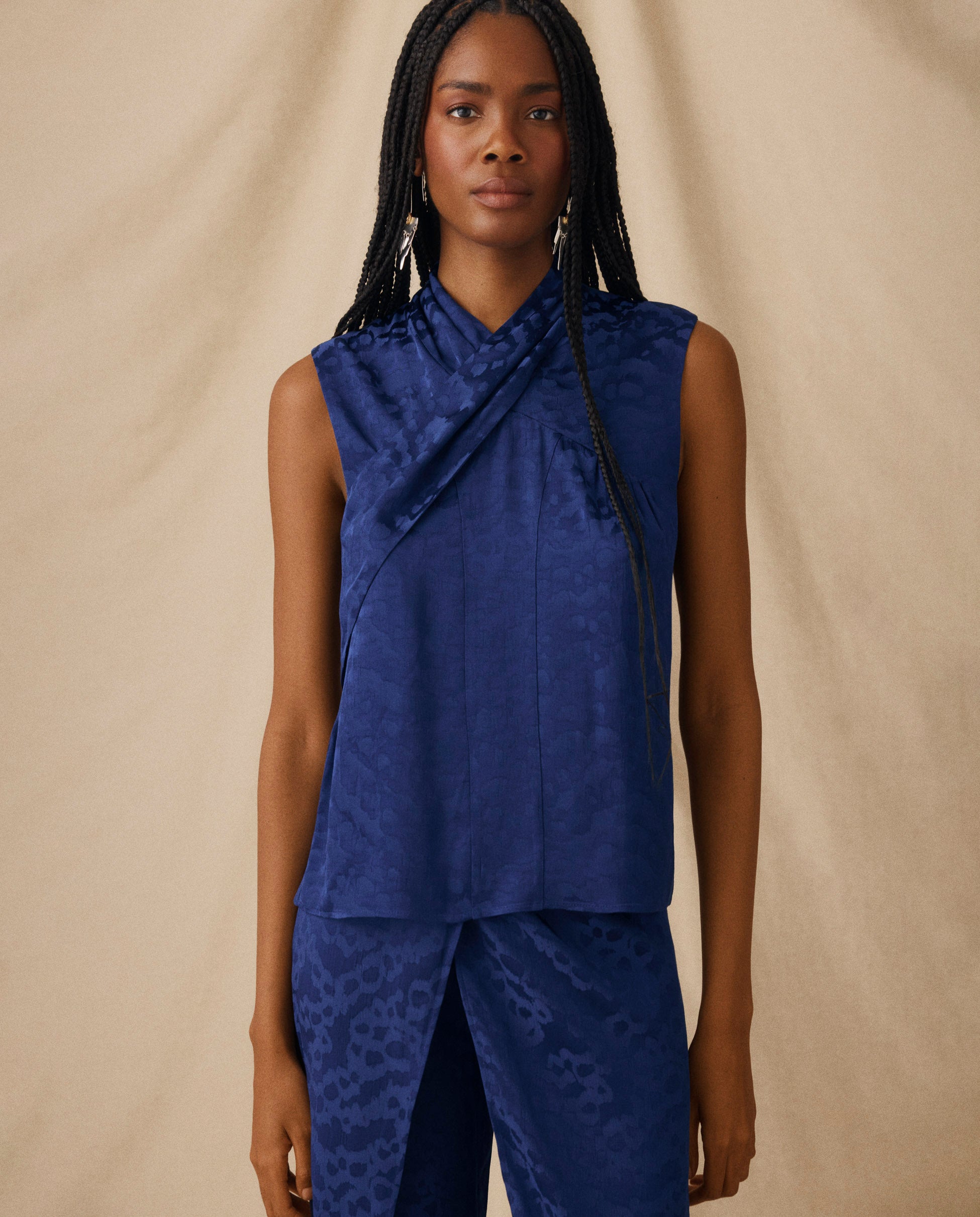 Crafted in fluid jacquard with a subtle leopard texture, the Elaine Top features a softly draped neckline that crosses at the front for sculptural effect. Sleeveless and relaxed in shape, it fastens with fabric-covered buttons at the back of the neck.