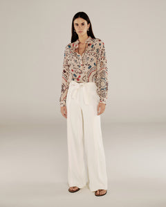 Elevate your wardrobe essentials with the Parul Blouse, defined by its sophisticated scarf-inspired neckline. Cut from a luxurious, fluid fabric, it drapes effortlessly, to transition seamlessly from workday dressing to weekend outings. An asymmetrical front hemline creates a subtle cutout effect, adding to its modern allure. A concealed back zip closure completes the streamlined silhouette, striking the perfect balance between modern elegance and enduring style.