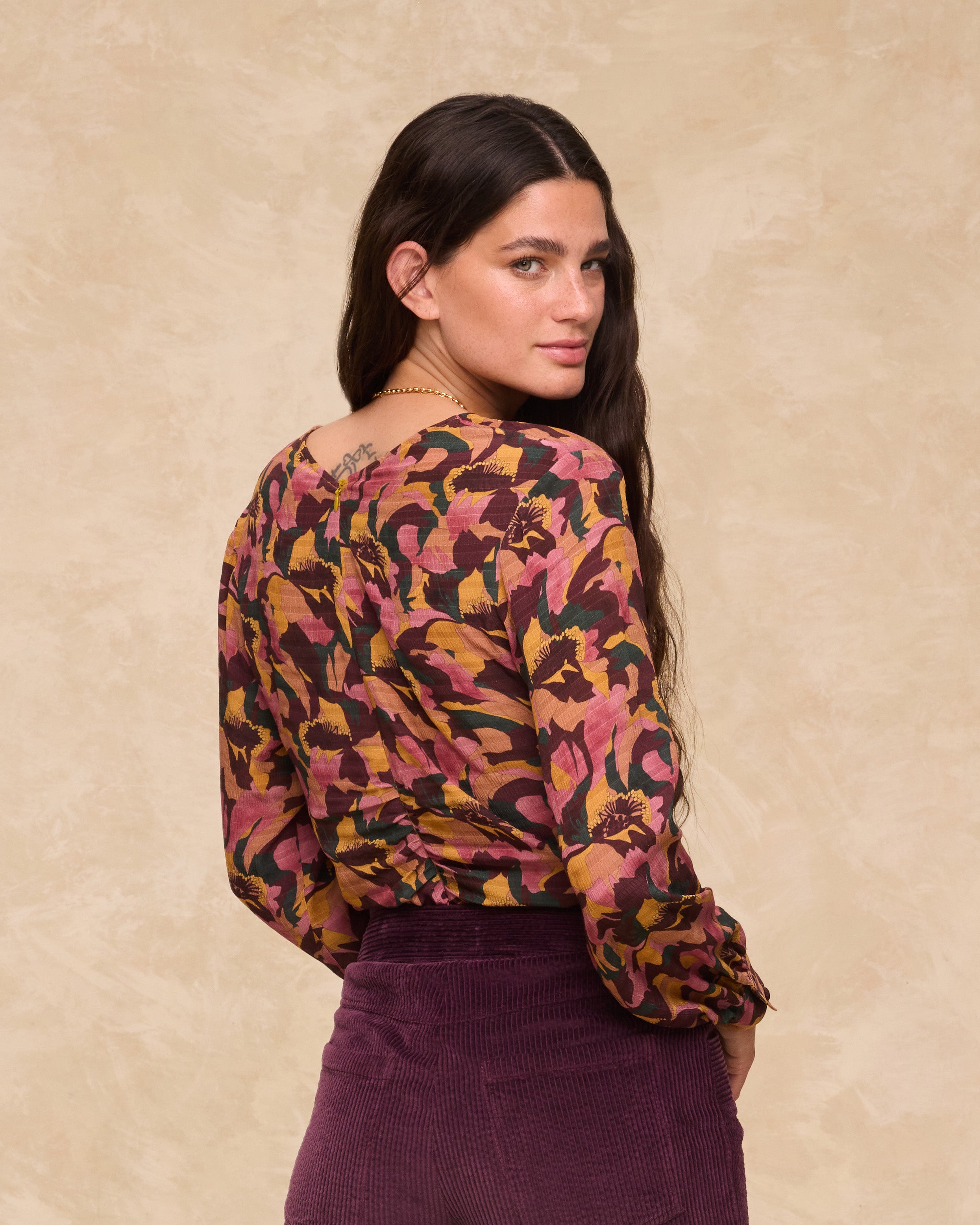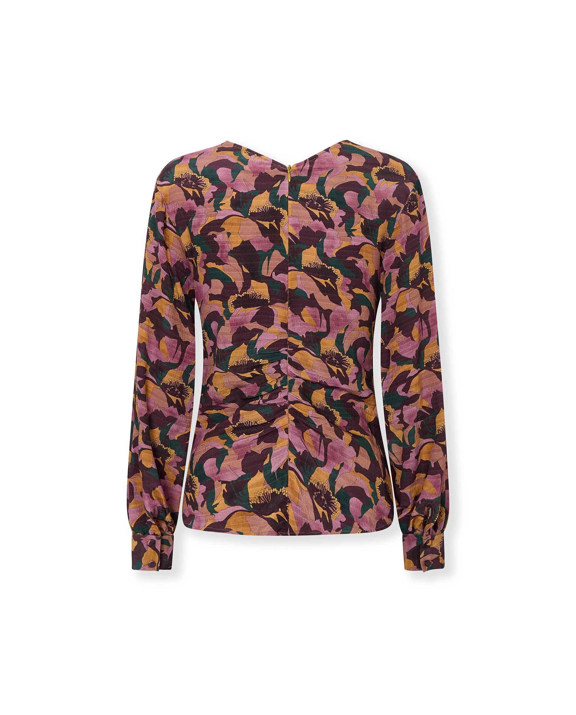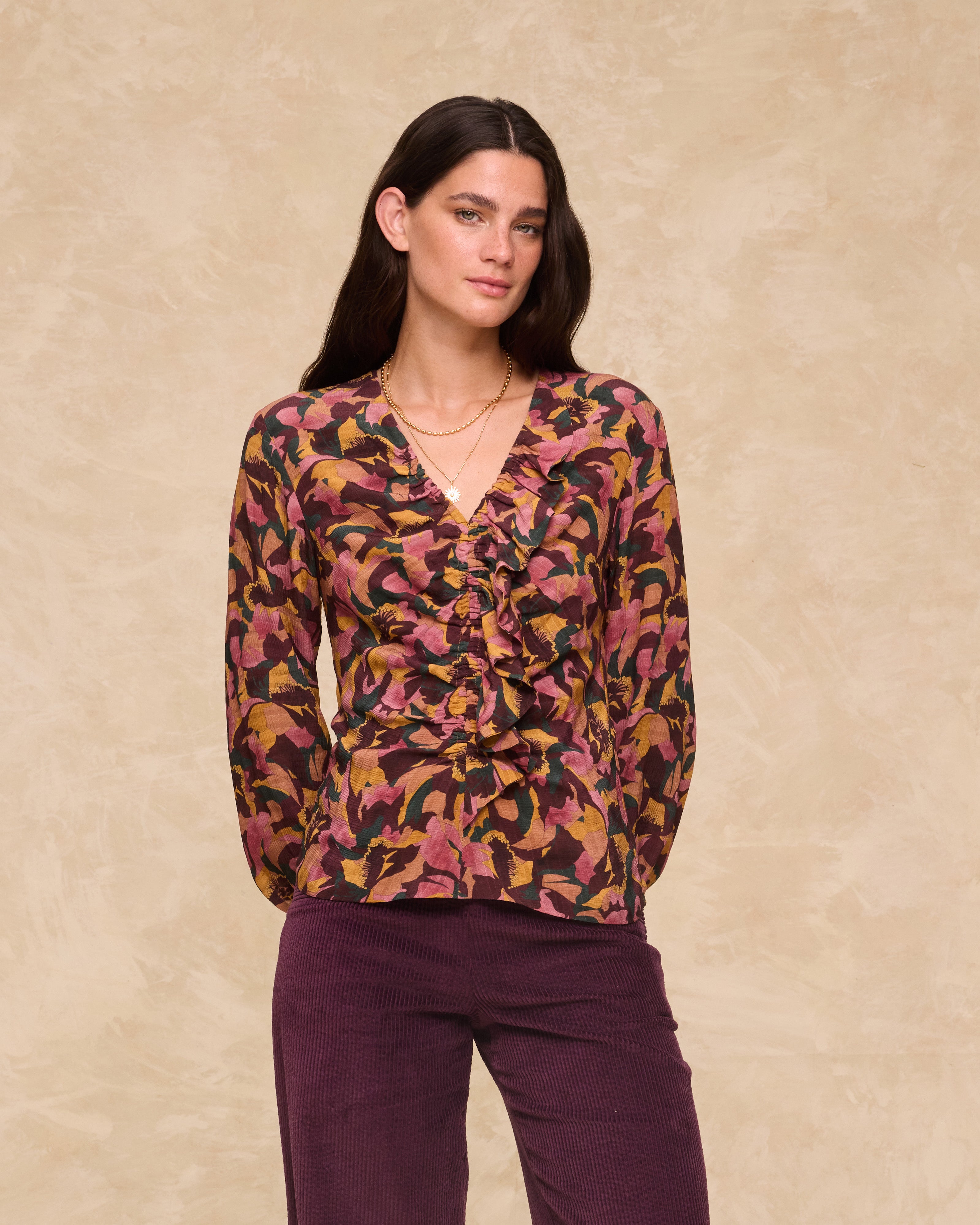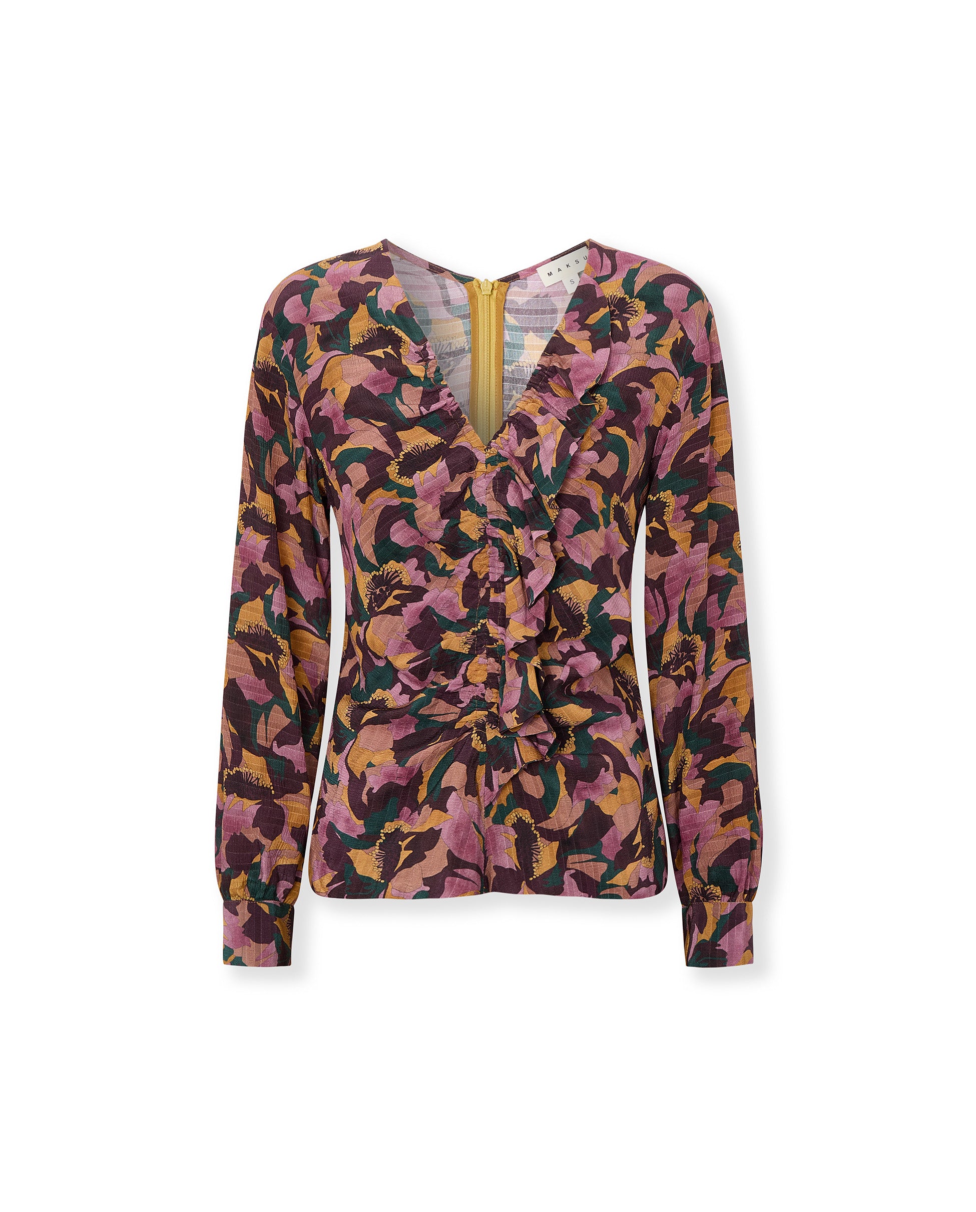 The Saachi blouse blends romantic detail with rich colour in a statement floral print. Cut from a softly textured fabric with natural movement, it features a ruched front with cascading ruffles, full-length sleeves with buttoned cuffs, and a gently fitted waist for shape. An invisible zip at the back ensures a smooth, flattering finish.