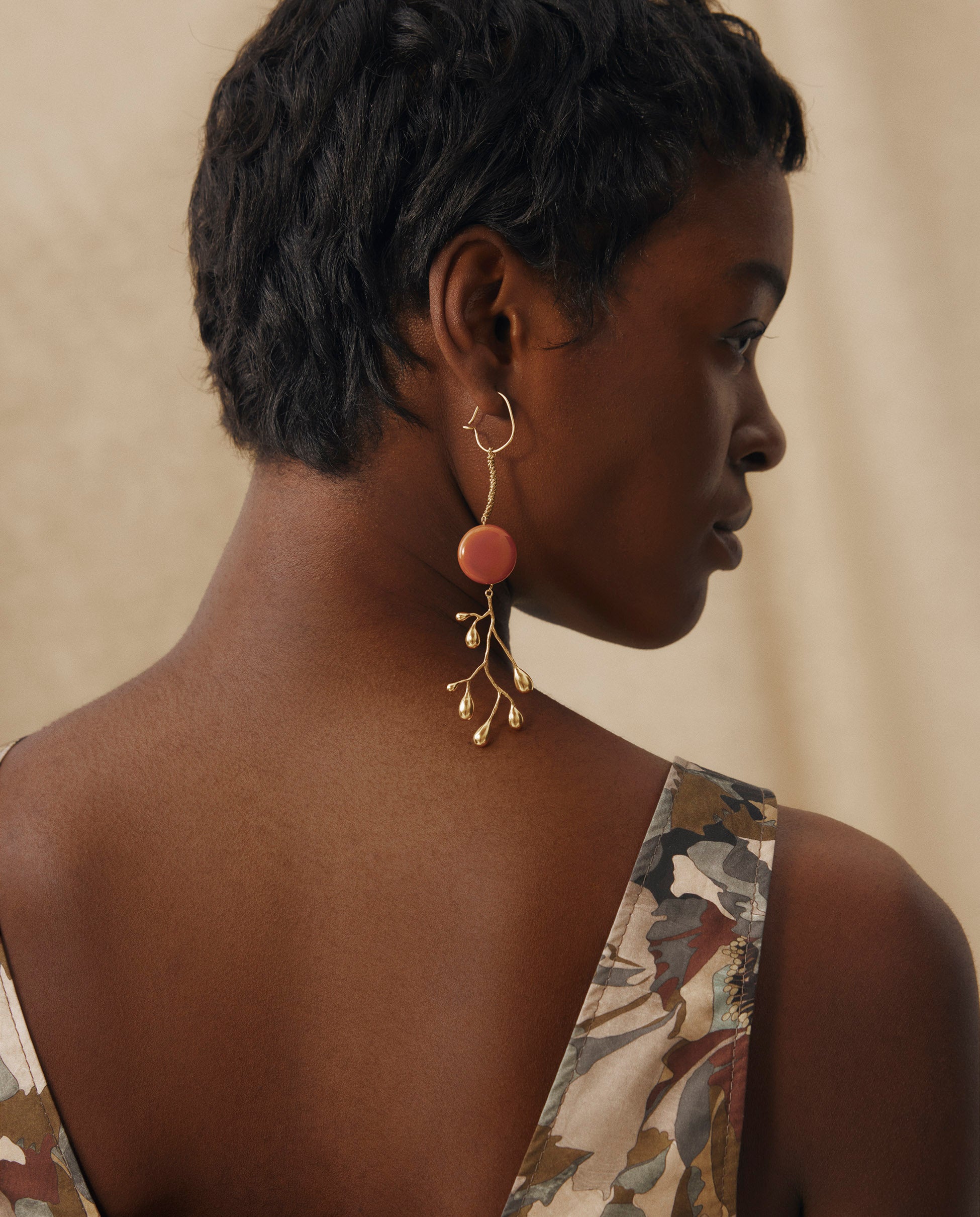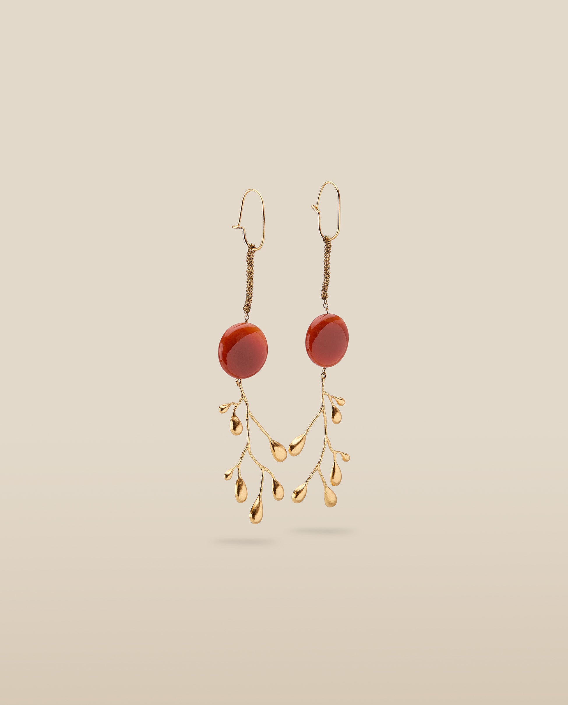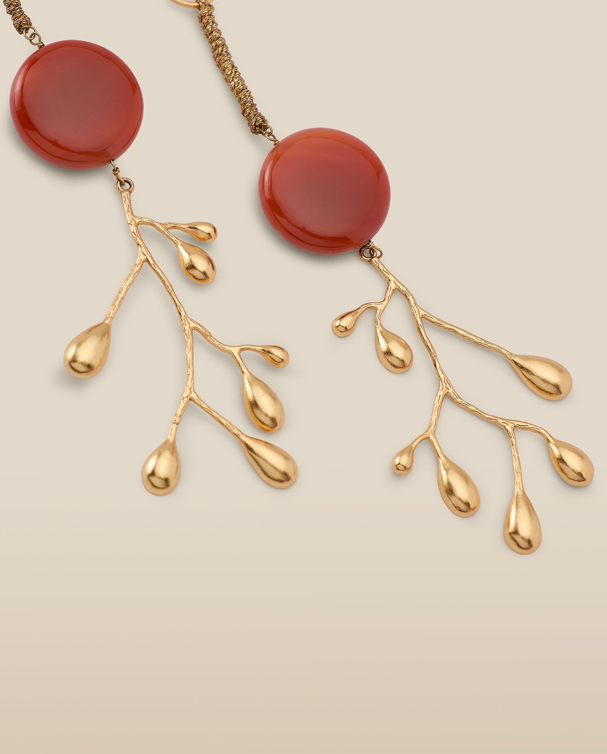 | Inspired by organic forms, the Brancheen earrings combine sculptural branches with a touch of natural color. Crafted from 22k gold-plated metal, they feature vibrant stone discs and delicate branch-like drops, adding a striking, nature-inspired element to any look. • 22k gold-plated metal with natural stone accents • Secure hook fastenings • Drop length approximately 12 cm • Non-returnable for hygiene reasons. |