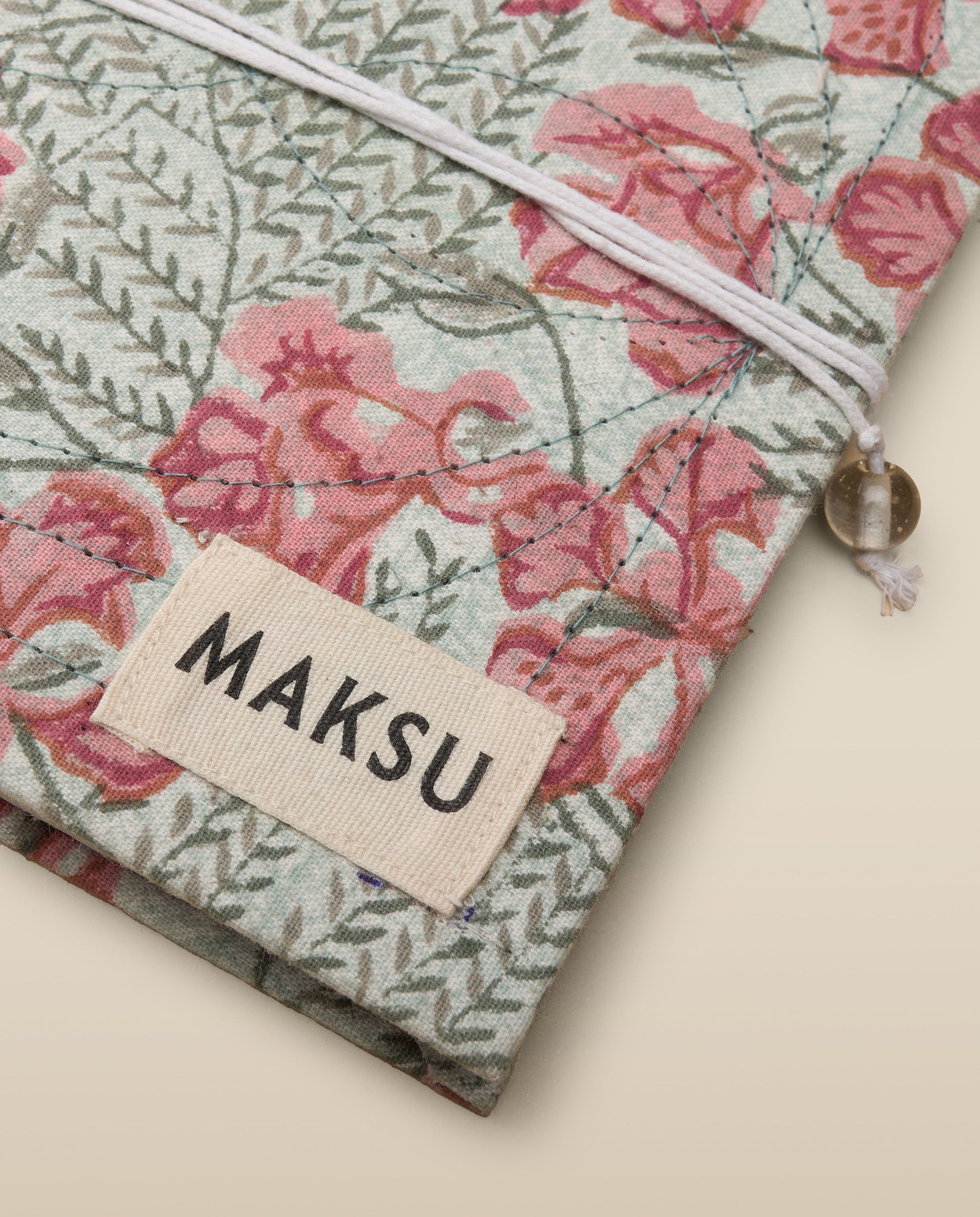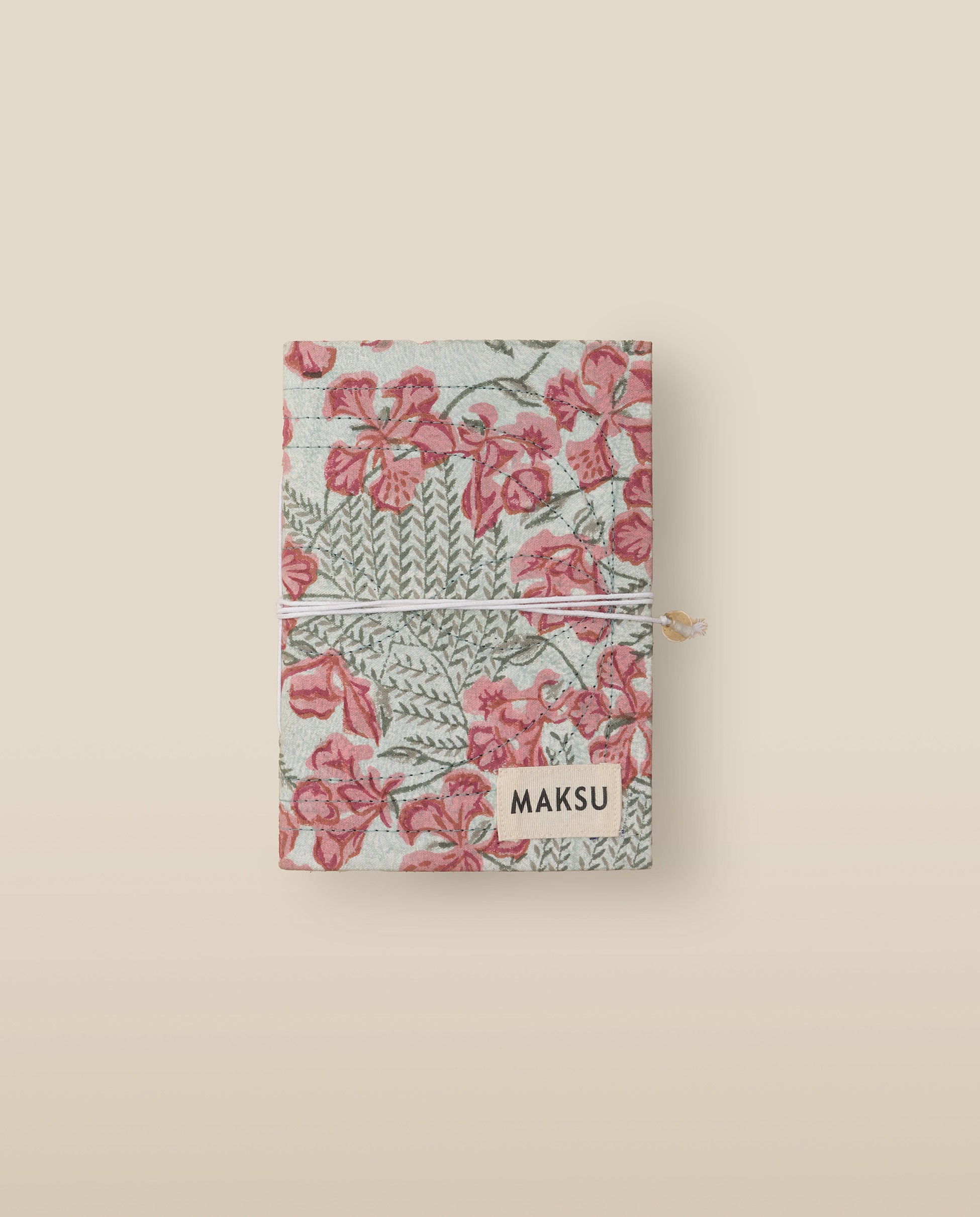 A charming companion for thoughts, sketches or notes. This softbound notebook features a delicate pink floral print on a sage green base, accented with subtle stitched detailing. The cover is made from recycled, handmade paper and finished with a tie-and-bead closure. Inside, you'll find 60 blank pages of bleached 90 GSM paper—perfect for everyday journaling or gifting.