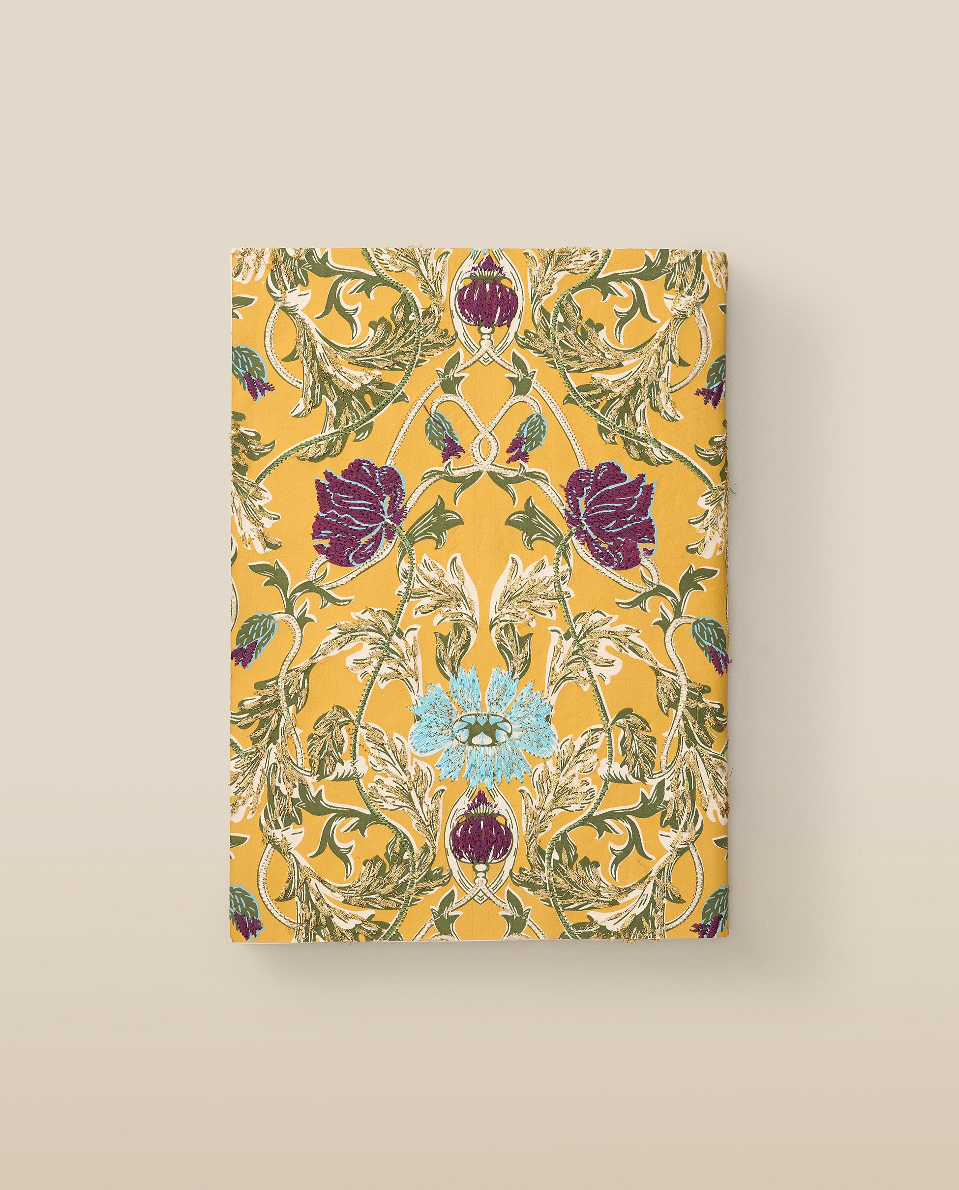 A vibrant blend of craftsmanship and utility, this softbound notebook is wrapped in a golden yellow floral print and elevated with intricate embroidery in gold, green, turquoise and plum. The cover is made from recycled, handmade paper—bringing artisanal character to a daily essential. Inside, you'll find 60 lined pages of smooth bleached 90 GSM paper, perfect for journaling, sketching or notes.