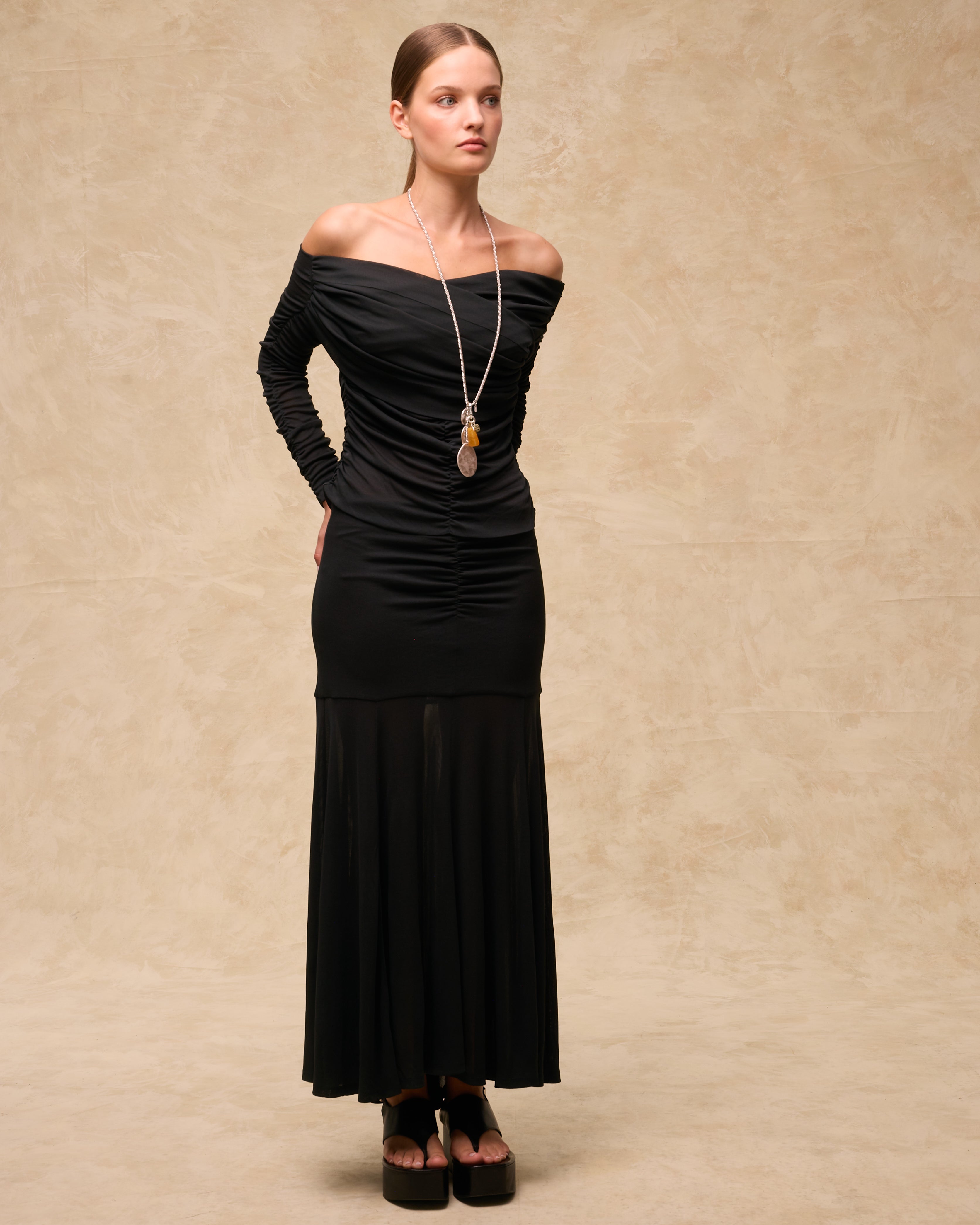 Sleek, sculptural and effortlessly versatile, the Jane top is crafted in soft black jersey with natural stretch. Designed with a flattering off-shoulder neckline, it features full-length ruched sleeves and delicate draping across the bodice for a contoured, body-skimming fit. Style it with the matching skirt for a modern, fluid silhouette.