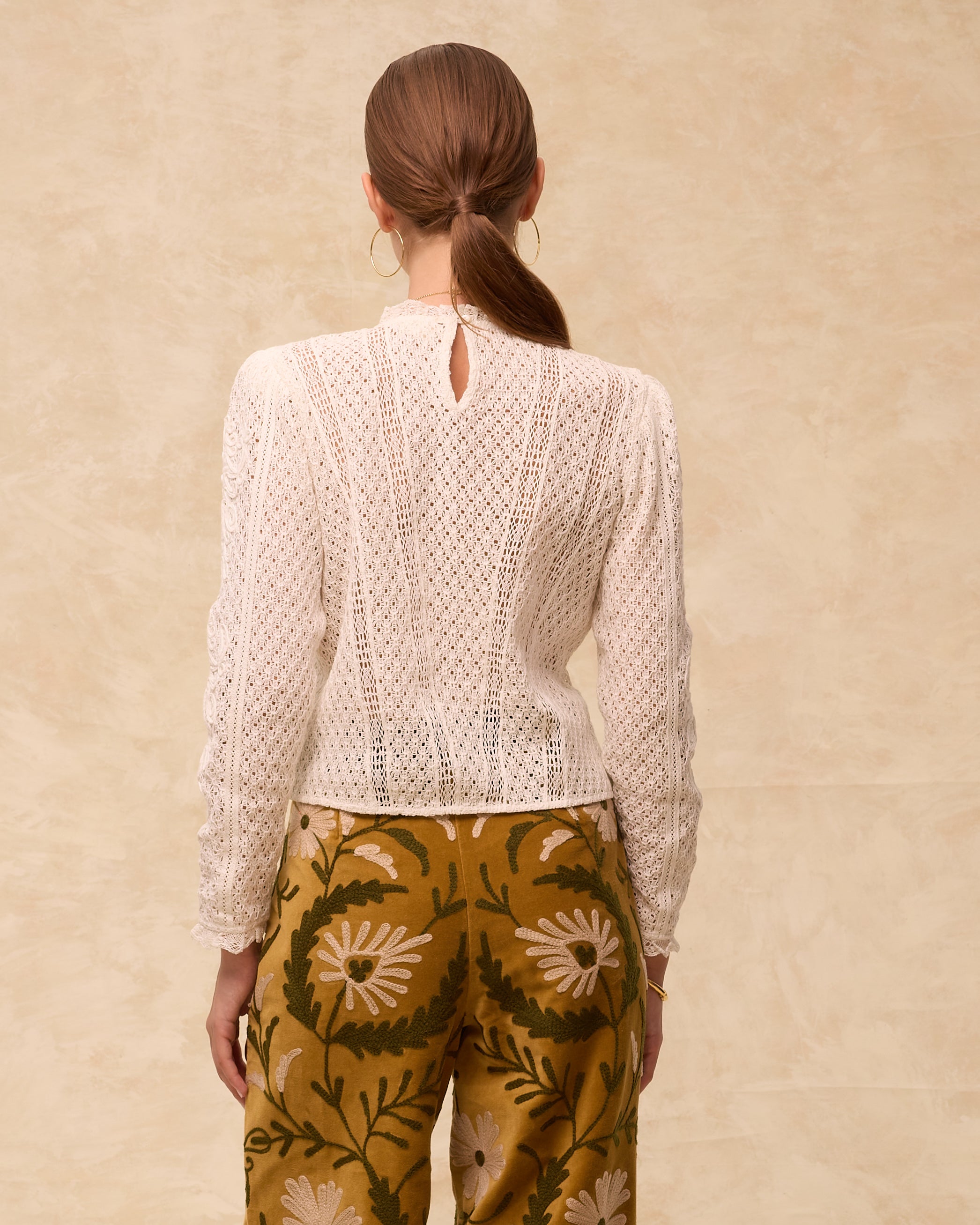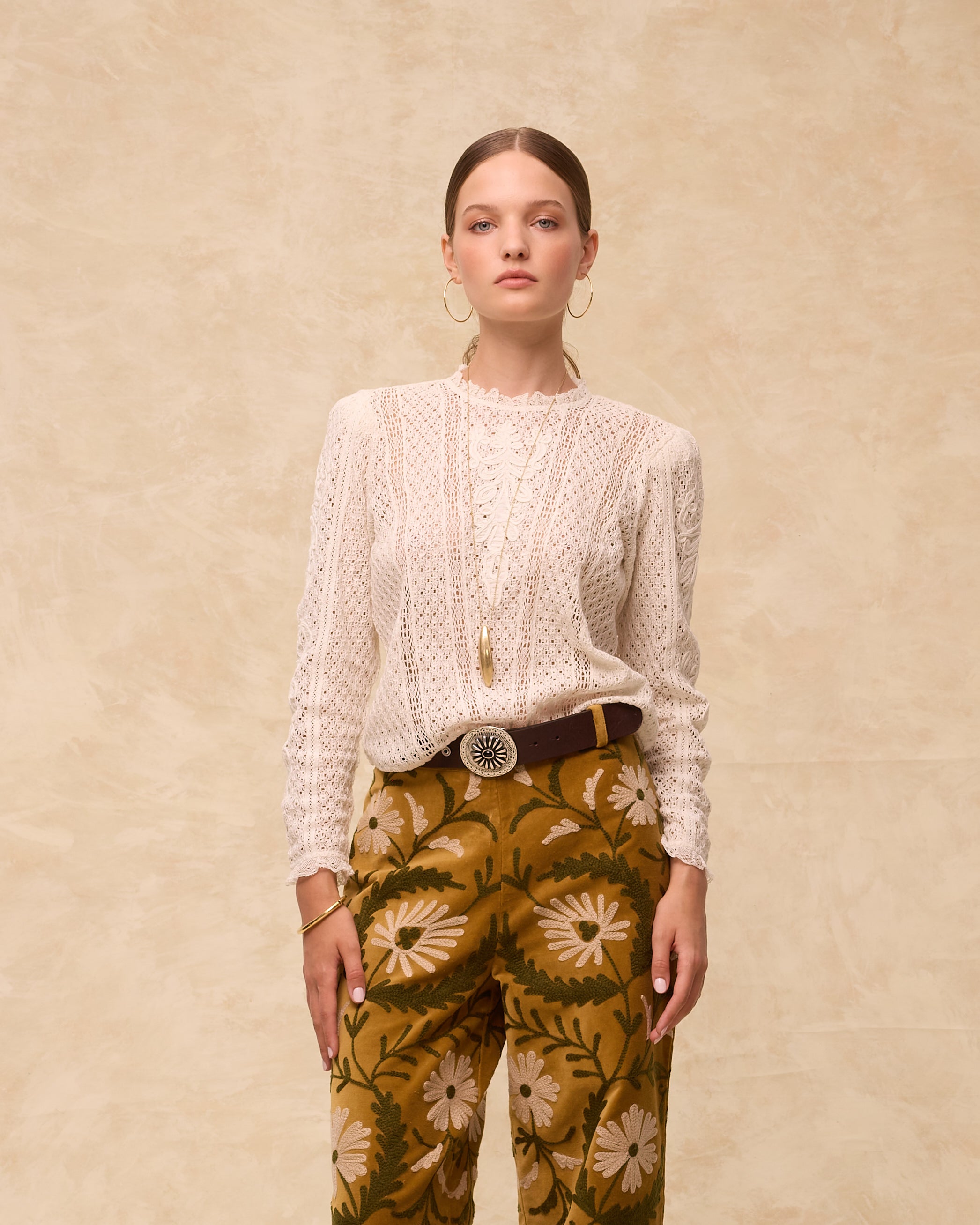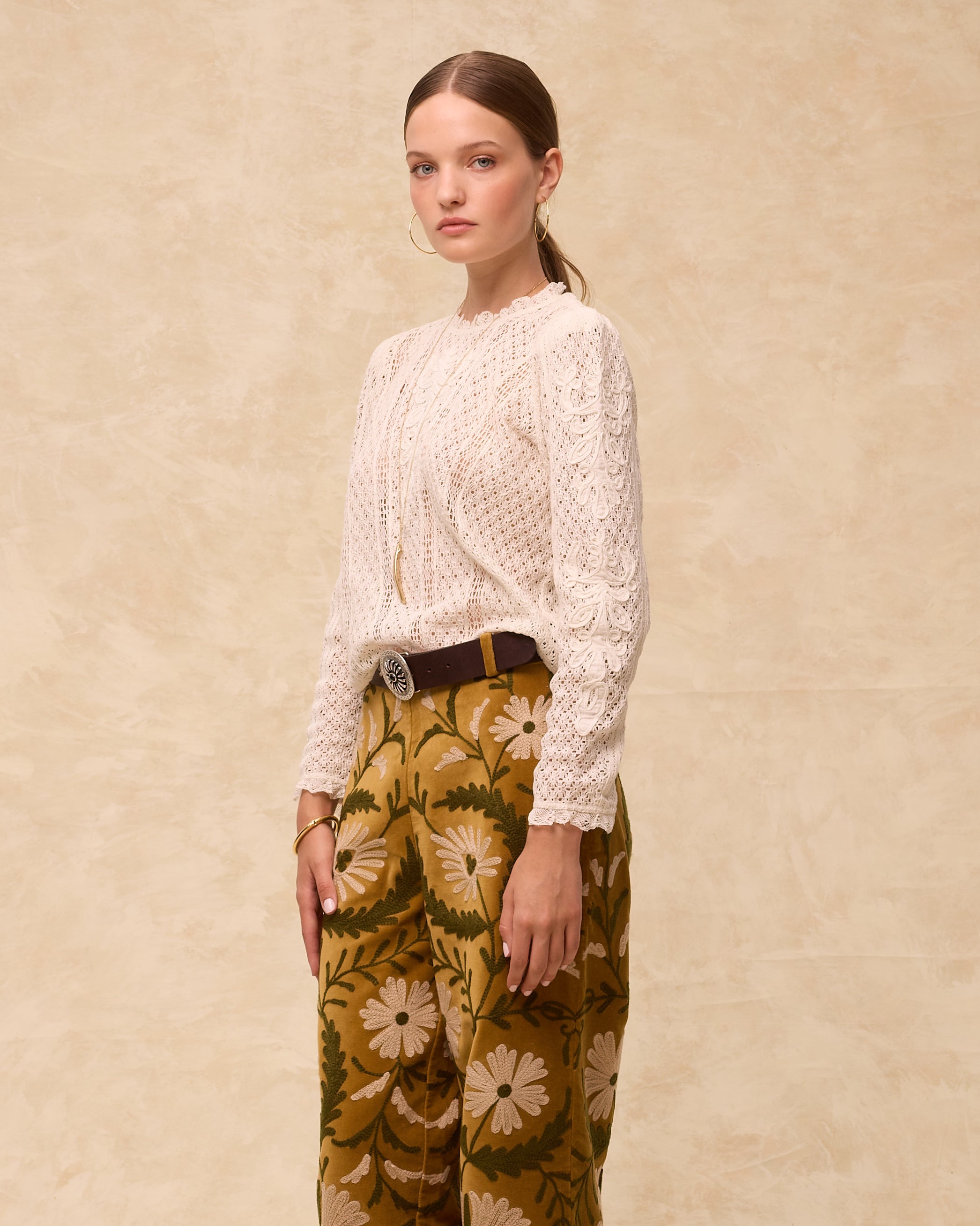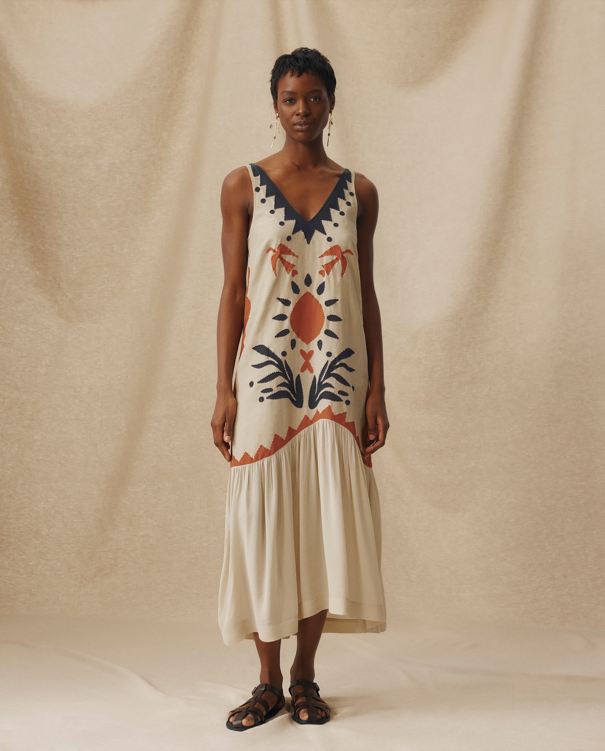 HELEN | Ecru Cotton-Linen Embroidered Drop Waist Midi Dress