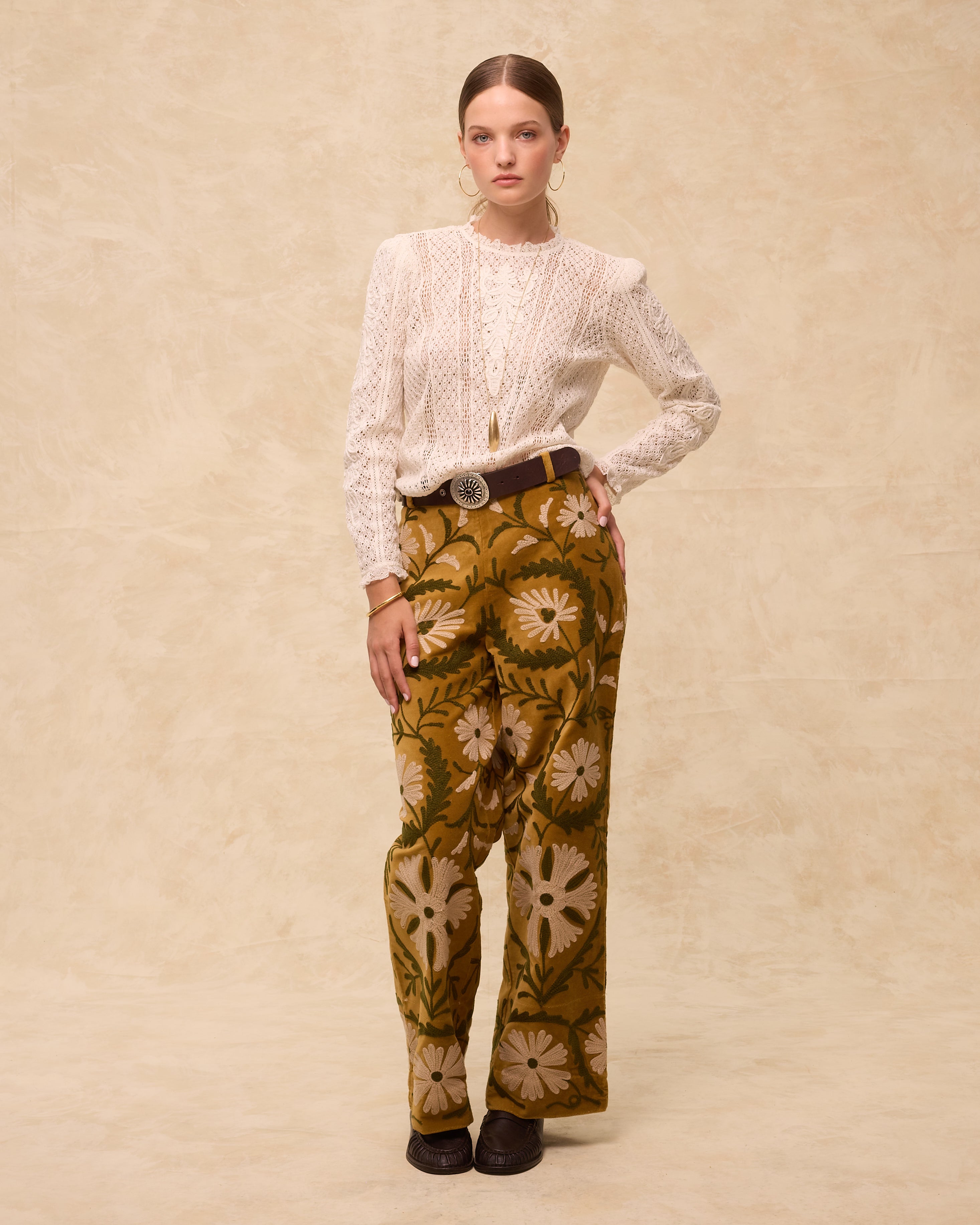 GENOVEVA | Black Geometric Embroidery Wide-Leg Cotton-Linen Jumpsuit