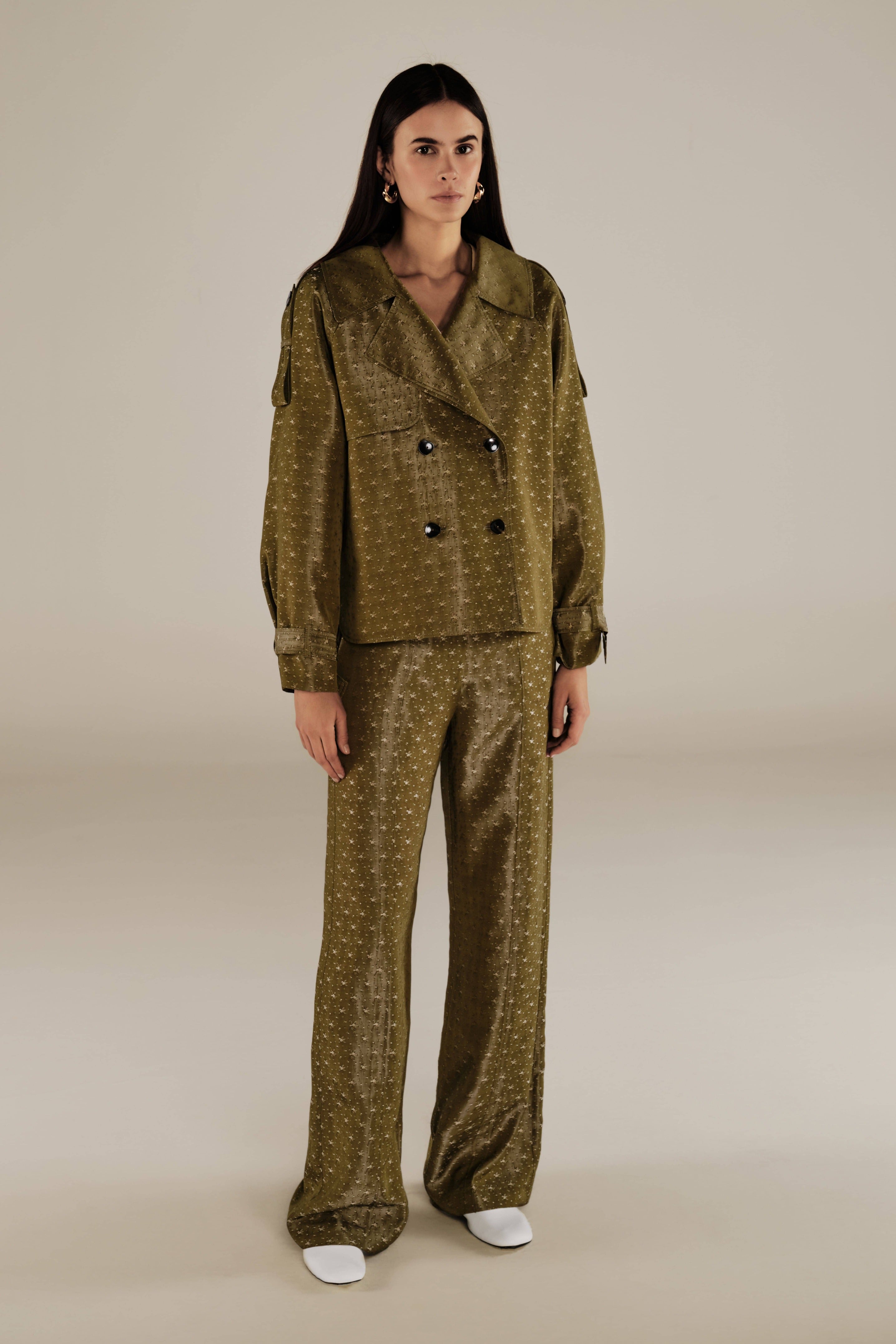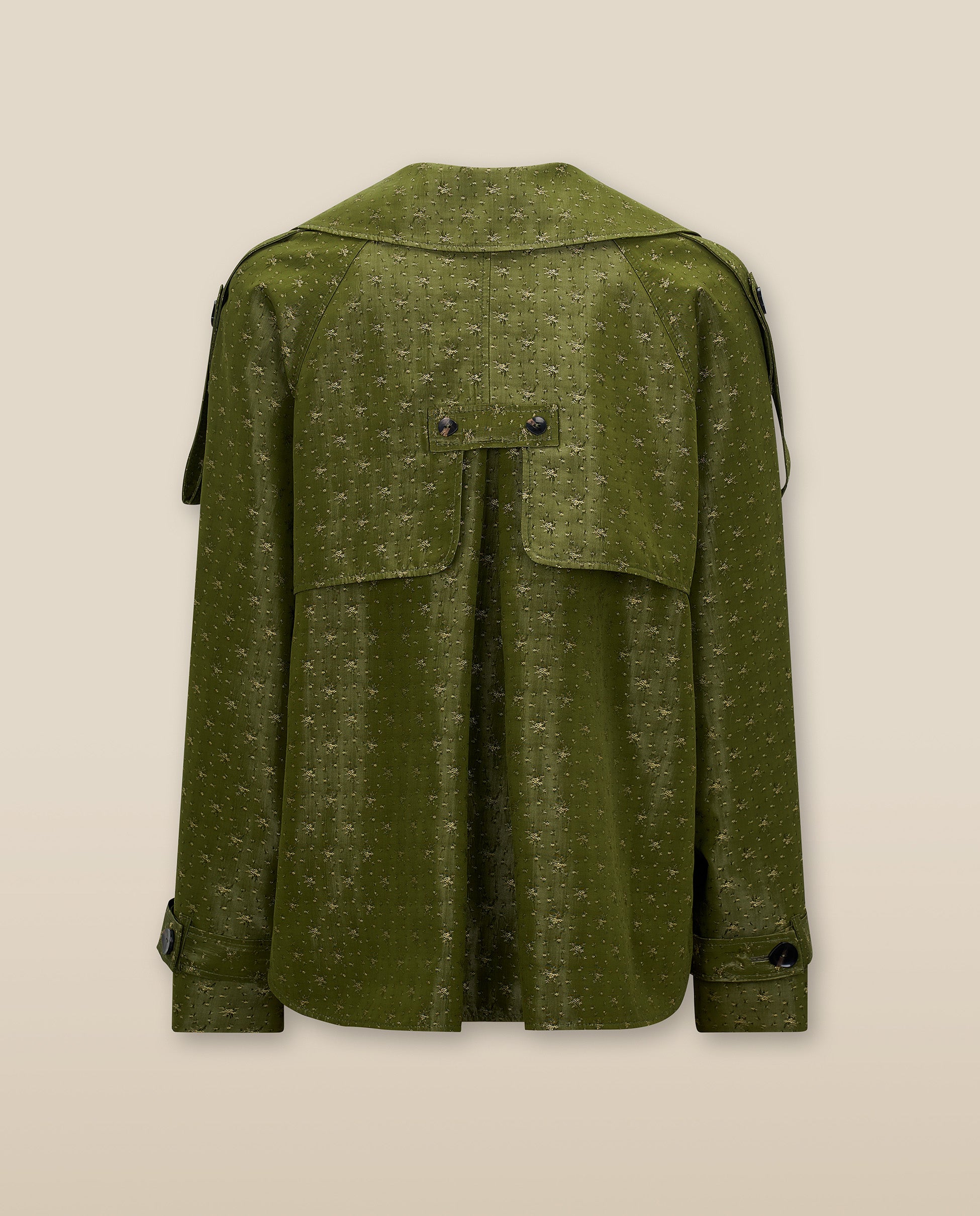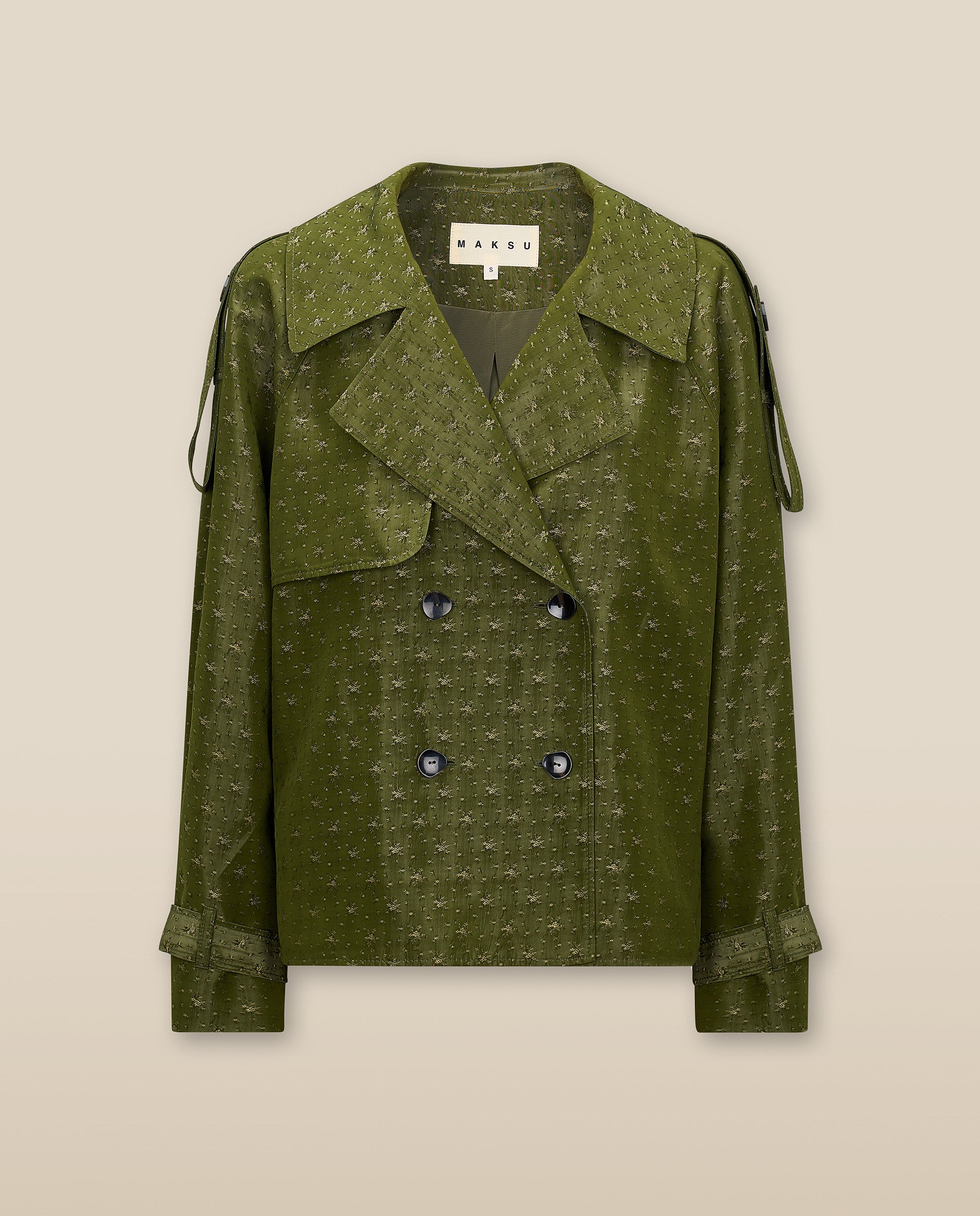 HAMA | Green & Gold Flower Jacquard Short Trench Coat