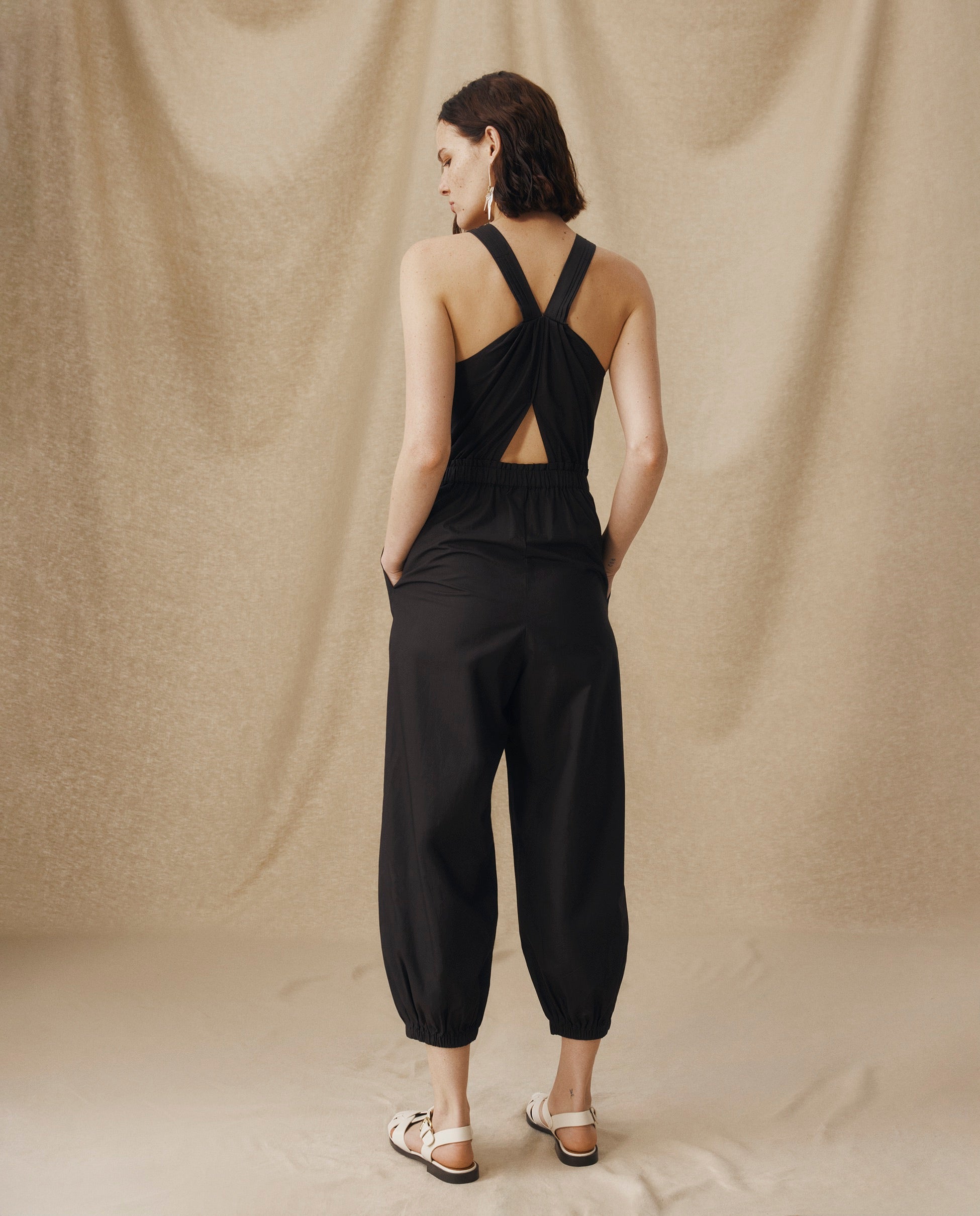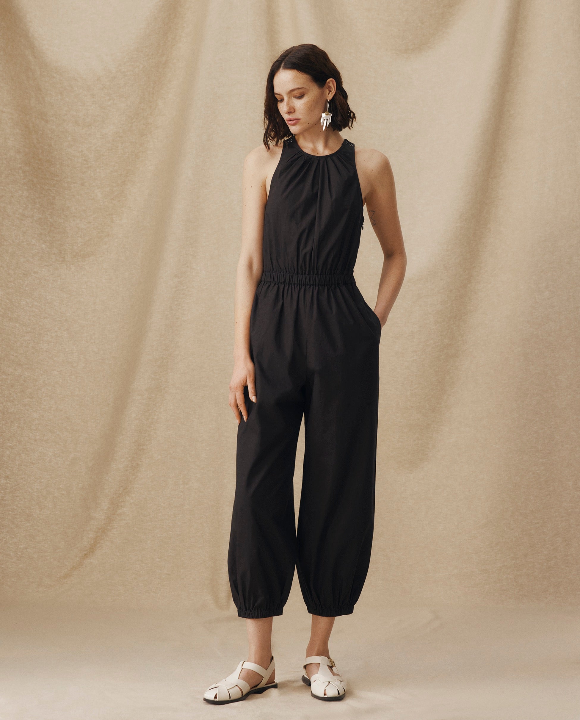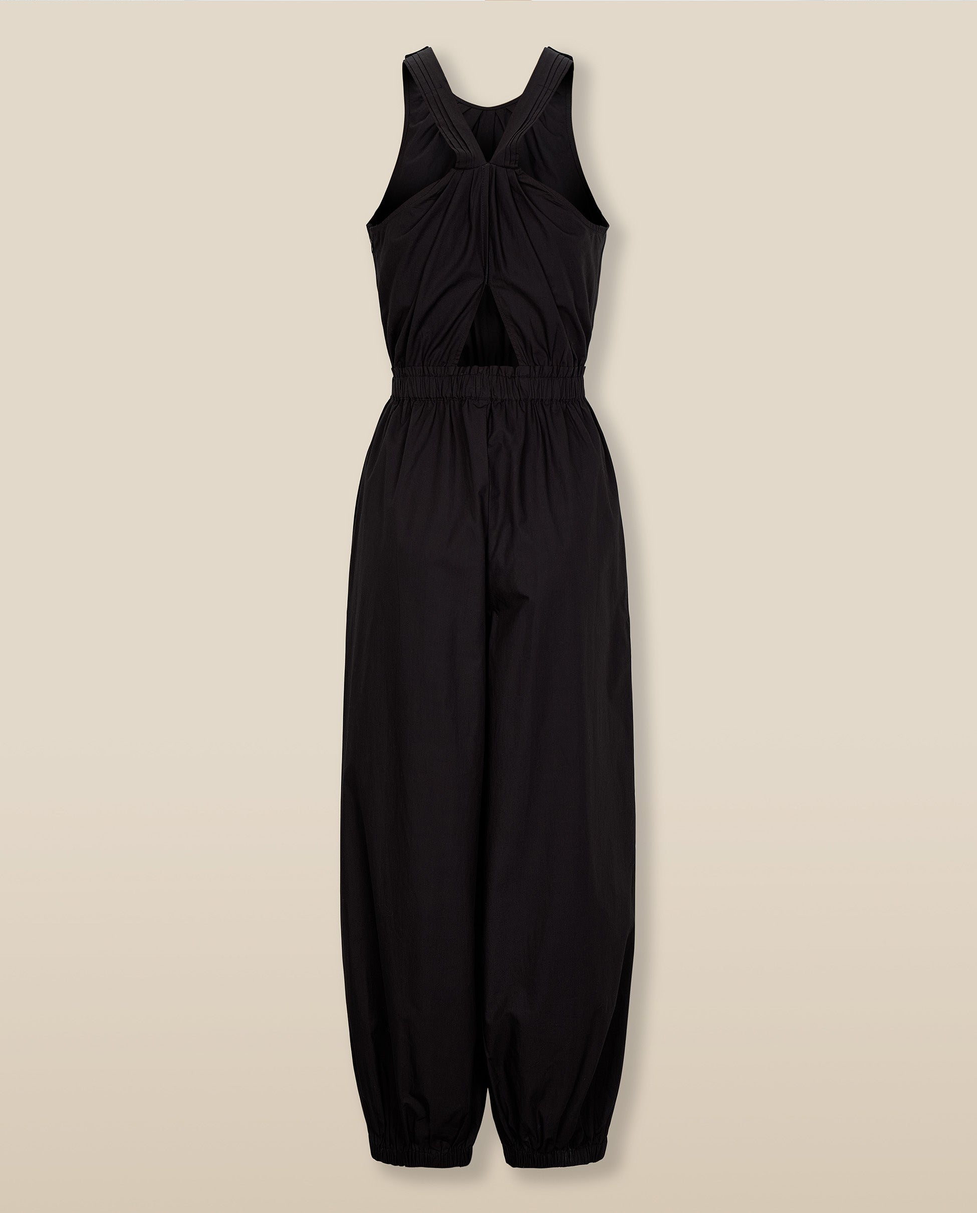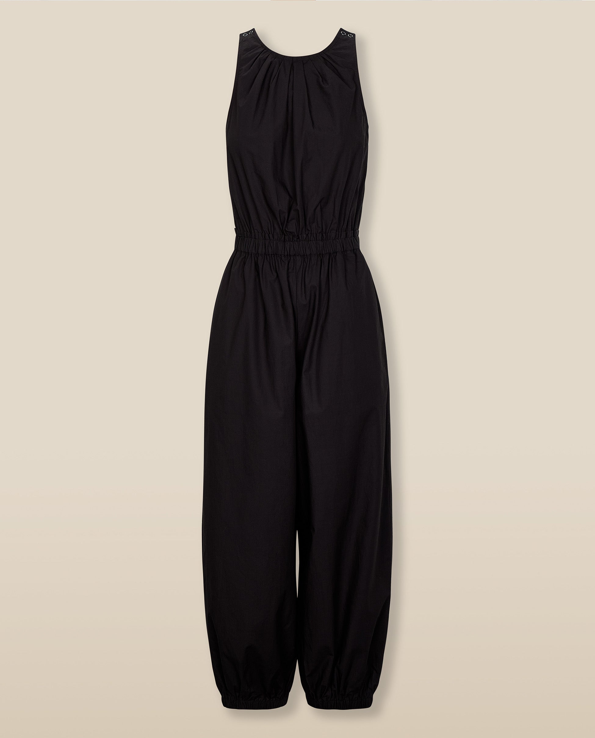 Effortlessly cool and endlessly wearable, the Dawa Jumpsuit is crafted from crisp black cotton for a lightweight feel with clean structure. The sleeveless silhouette features a gathered round neckline, tapered legs with elasticated cuffs and a crossover back with a keyhole detail for an unexpected twist. A concealed zip ensures ease of wear.