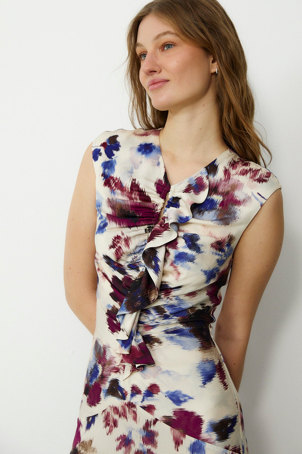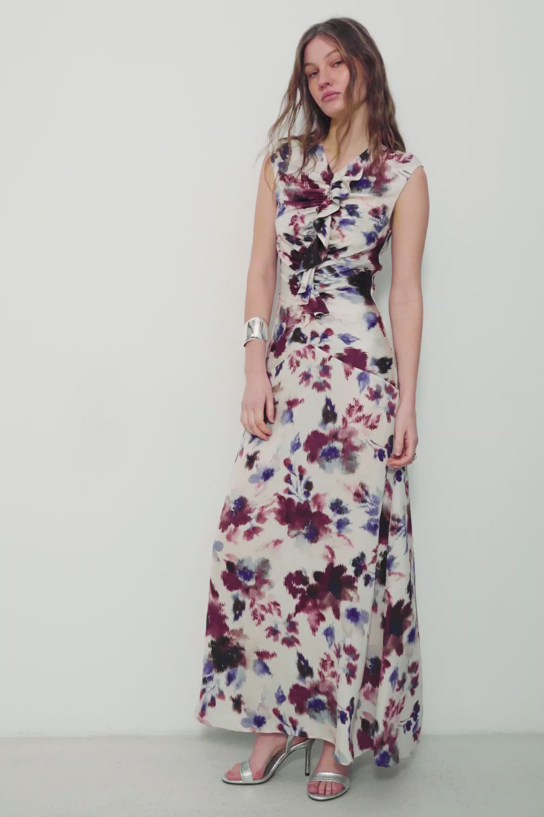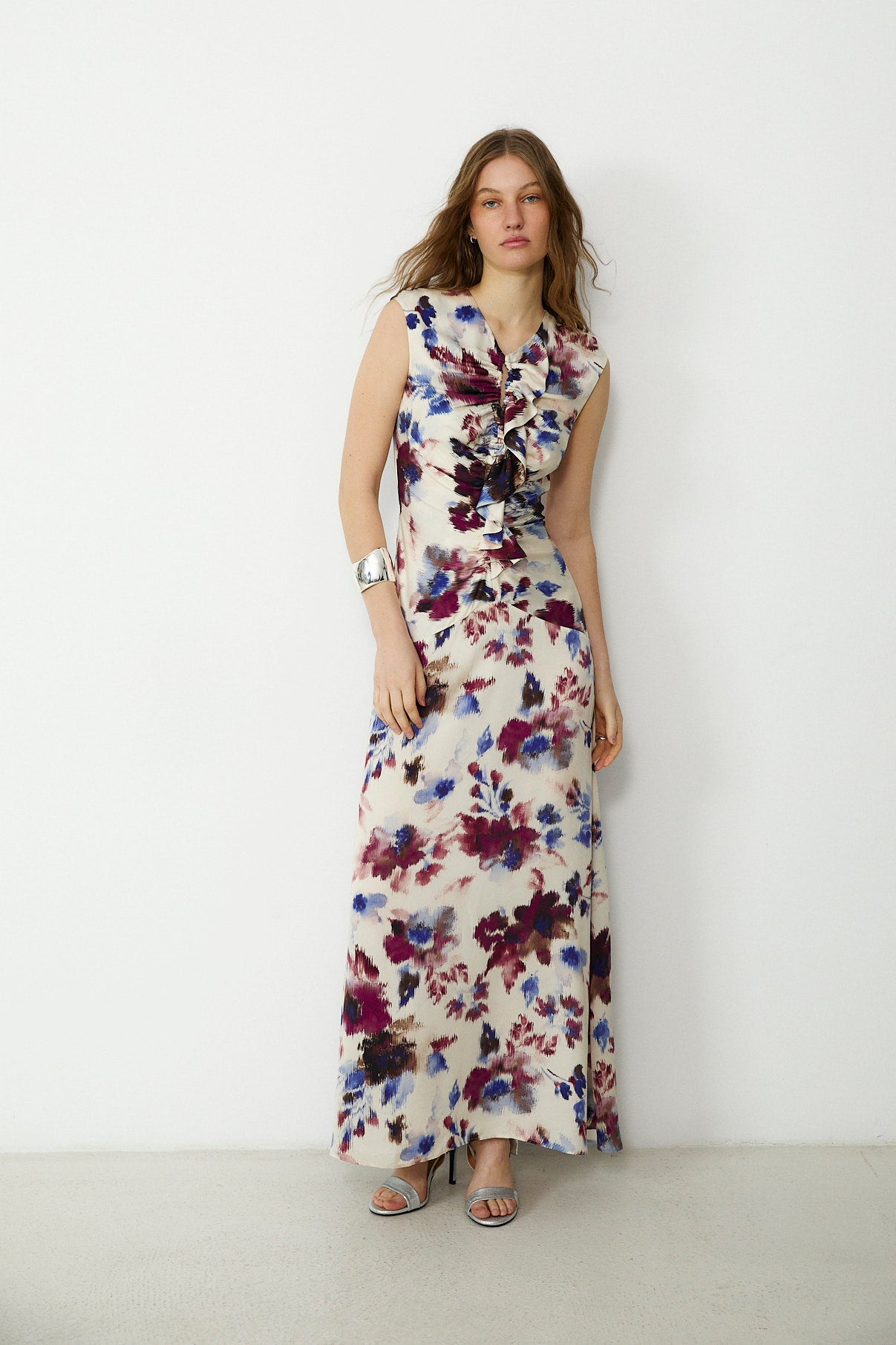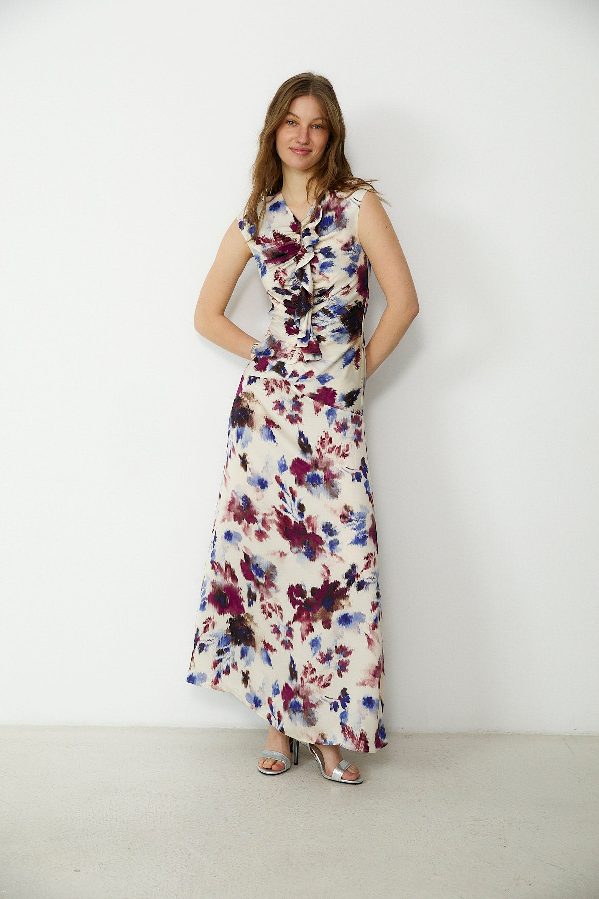 Elegant and fluid, the Saachi maxi dress is crafted from soft bamboo-viscose with a beautifully fluid drape. The sleeveless silhouette is defined by sculpted ruching through the bodice and a cascading ruffle detail at the front, creating a flattering, elongated line. Falling to a full-length hem, it fastens with a concealed zip at the back for a smooth, refined finish.