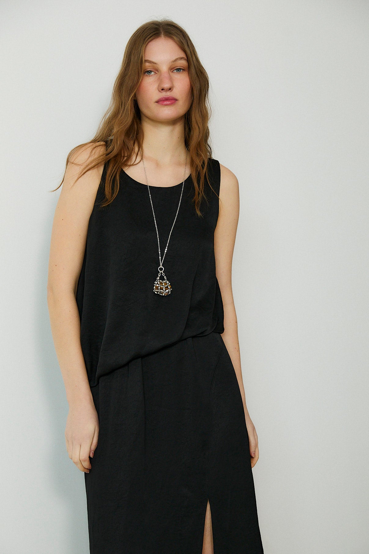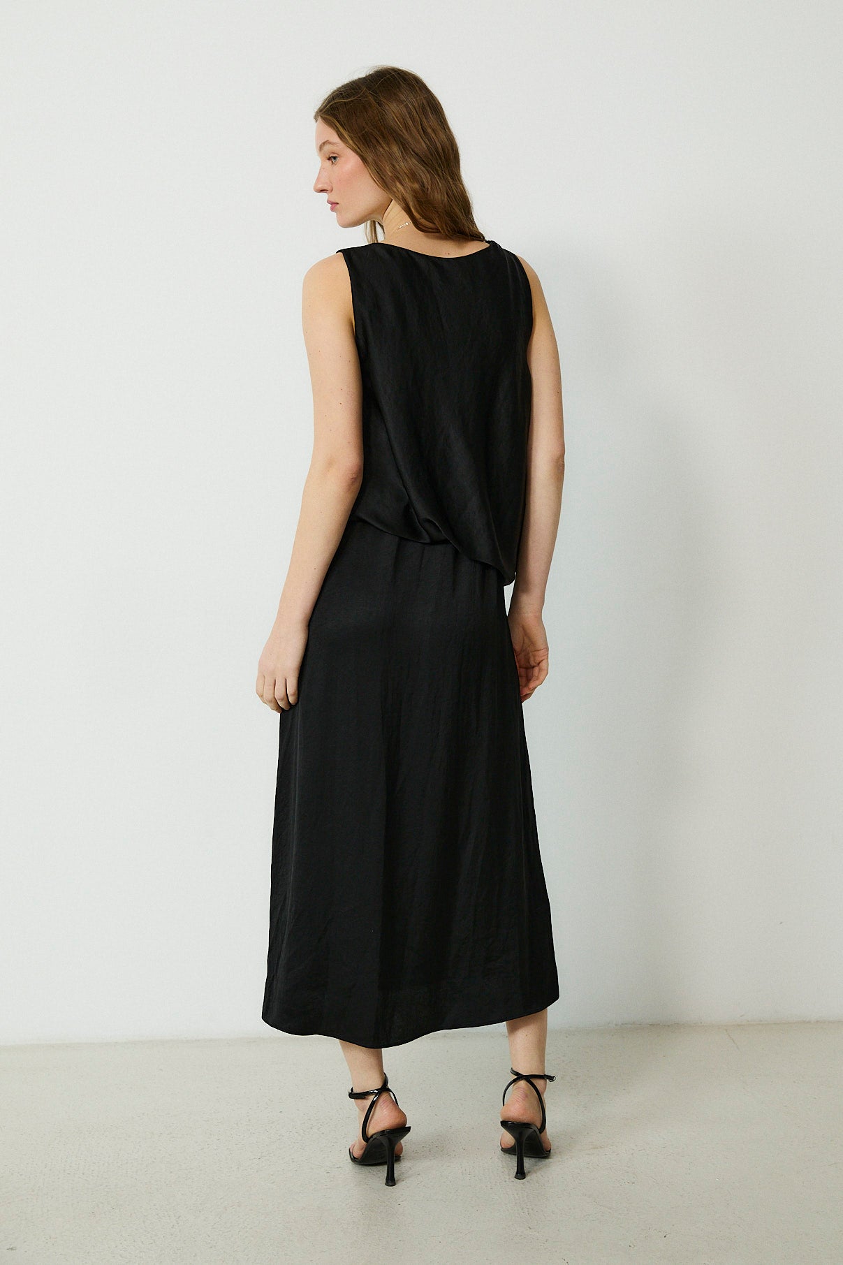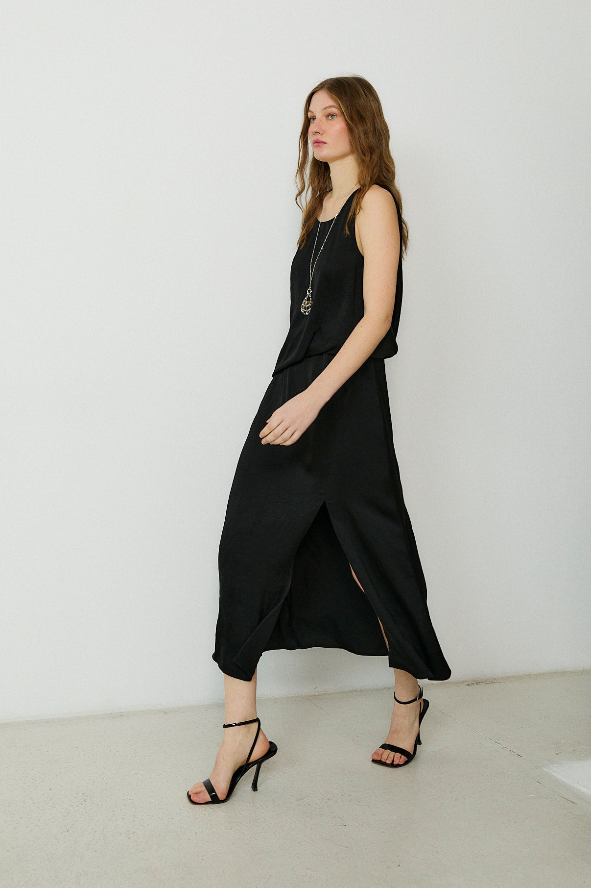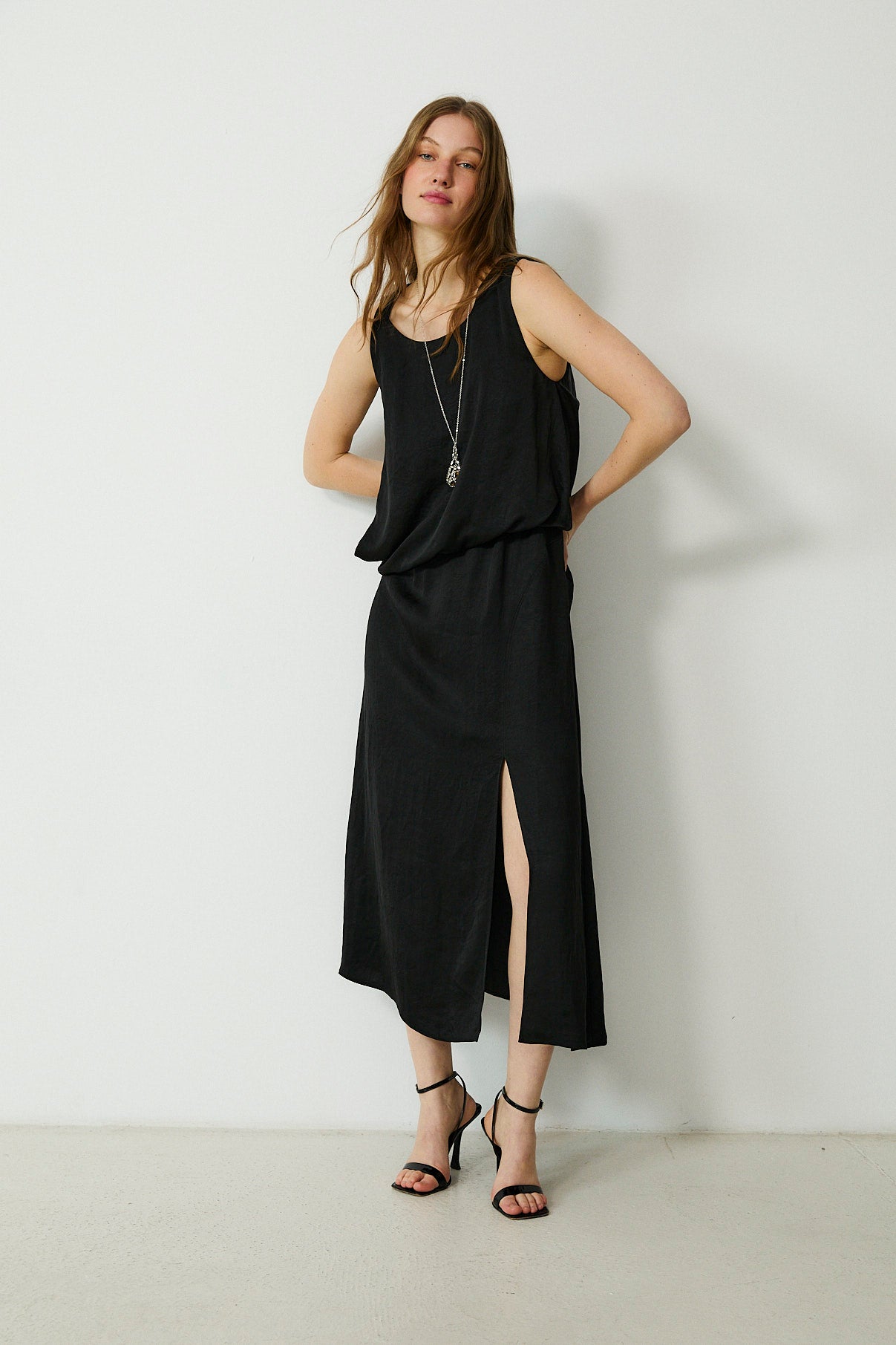 Effortless and refined, the Sema midi dress is a modern staple designed for day-to-night ease. Cut in a fluid black fabrication, it features a clean sleeveless silhouette with a softly draped bodice and an elegant midi-length skirt. Finished with a front split for subtle movement, it’s a timeless piece to wear with minimal jewellery and barely-there heels.