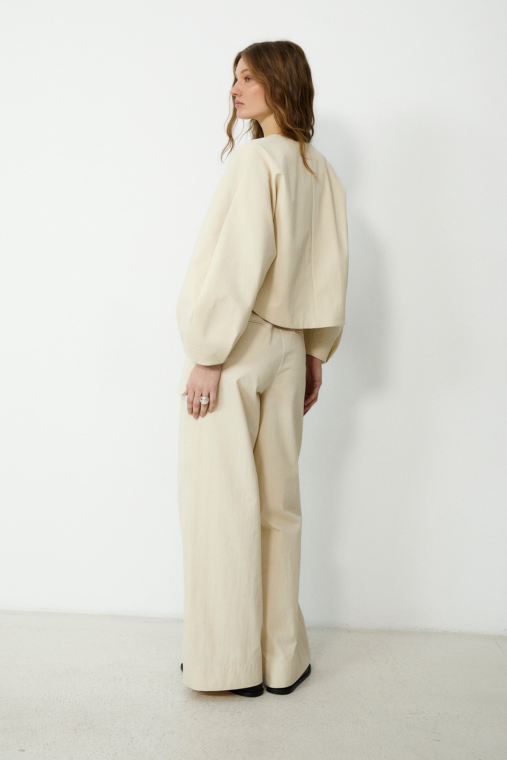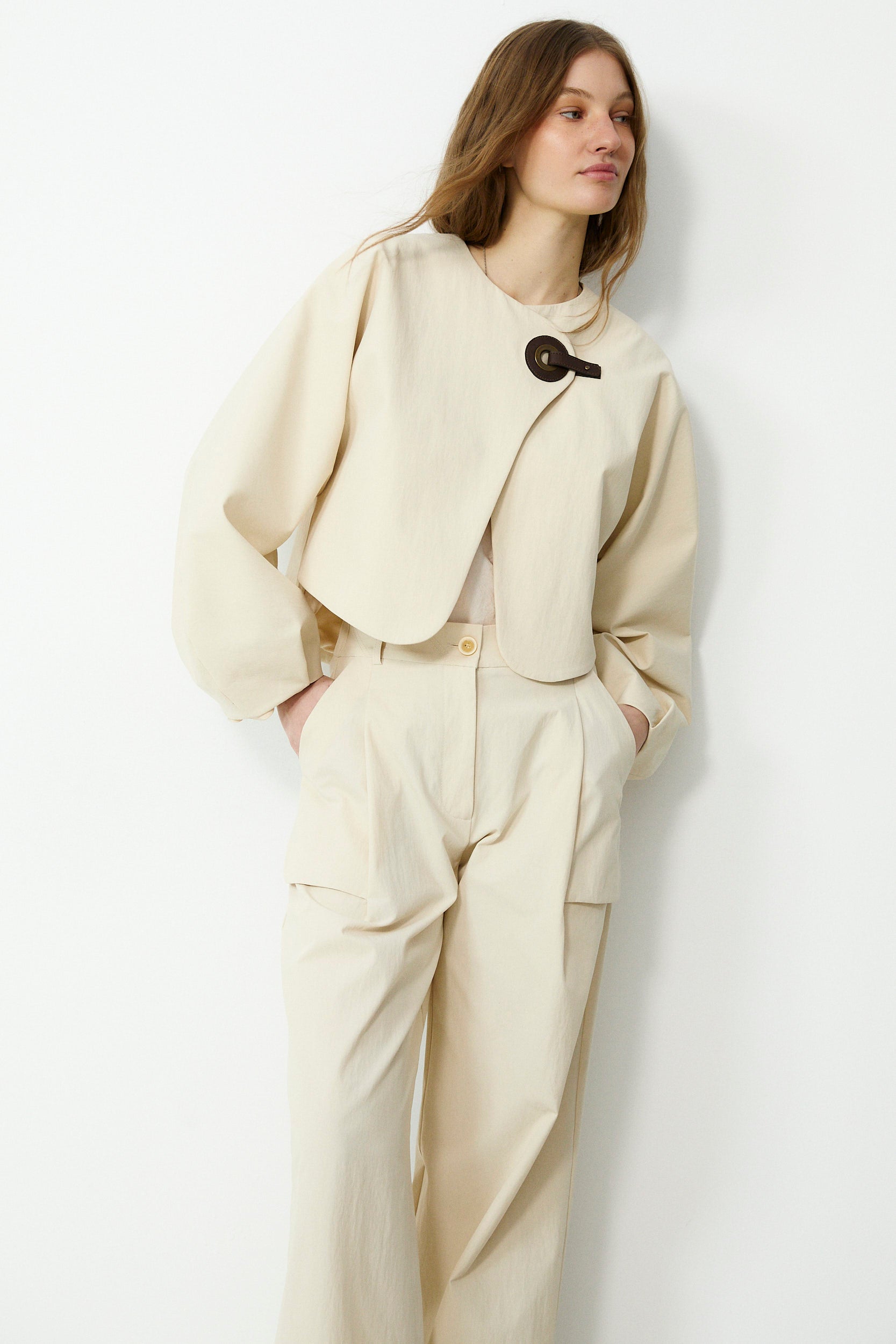 Clean, sculptural and quietly distinctive, the Odette short jacket is designed to elevate everyday looks with minimal effort. Cut in a structured cotton blend, it features voluminous balloon sleeves and a curved front opening, finished with a statement clasp at the neckline for a refined touch. Fully lined for comfort, it layers beautifully over dresses, tailoring and denim. Pair with the matching trousers for effortless coordination.