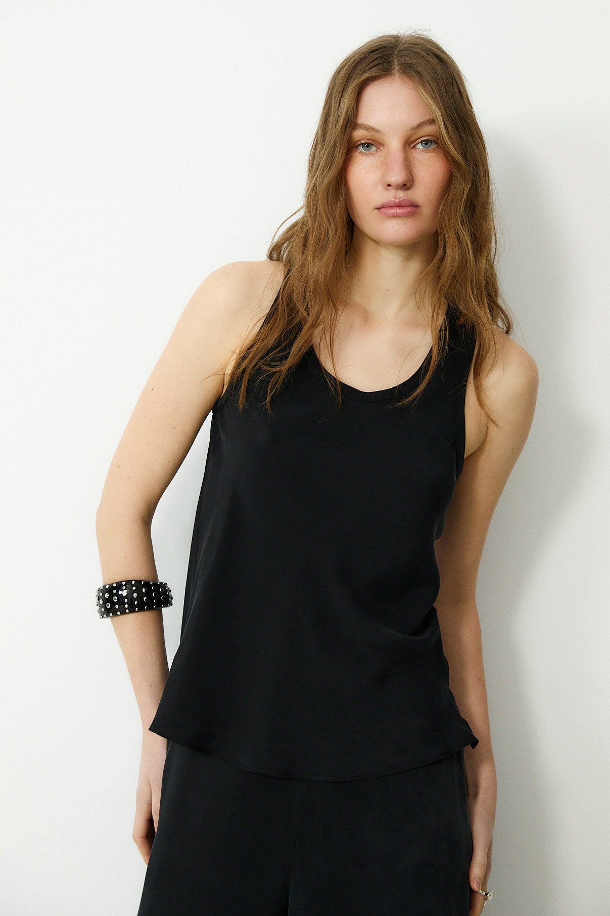 Minimal and refined, the Berta top is an effortless wardrobe essential with a softly fluid feel. Cut to a relaxed sleeveless silhouette, it features a clean scoop neckline and gently flared hem that drapes beautifully on the body. Designed for versatile styling, it works just as well worn loose over tailoring as it does tucked into high-waisted skirts or trousers.