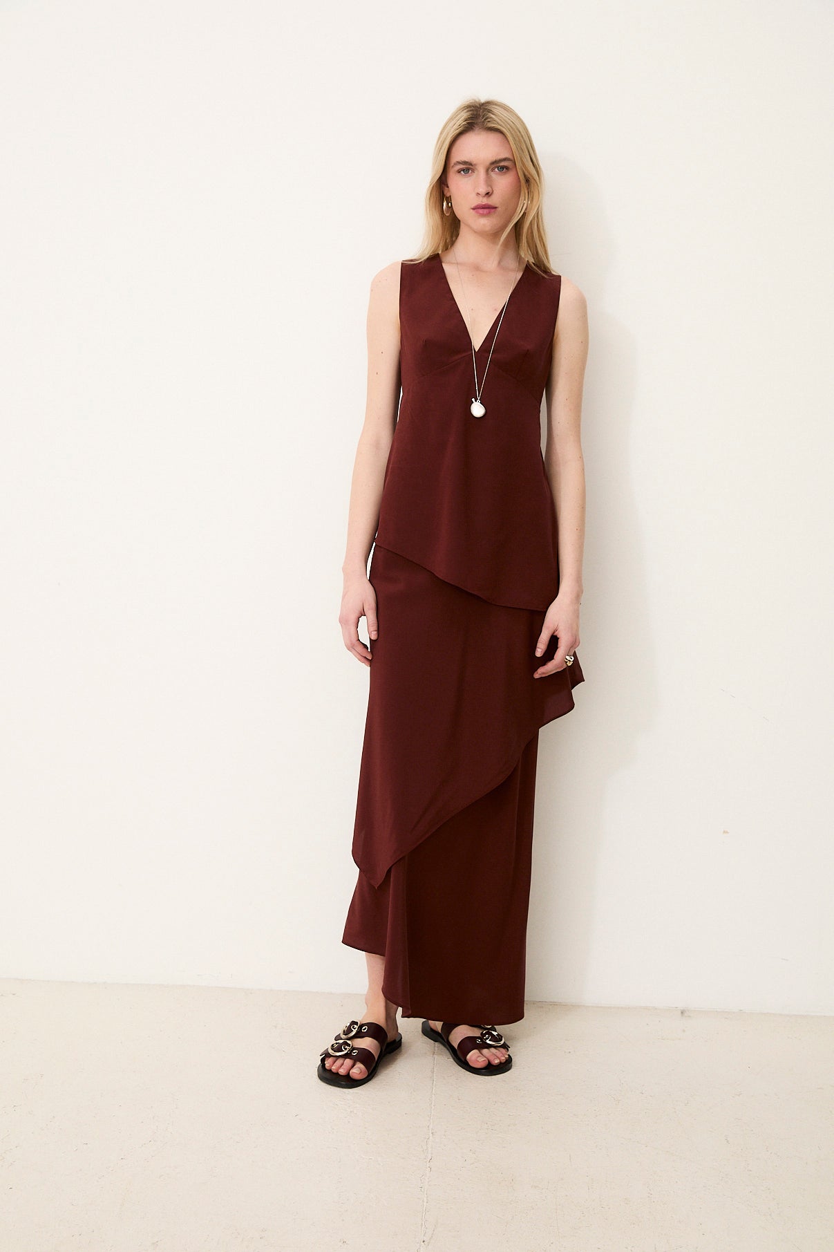 The Ginevra skirt stands out for its timeless elegance and graceful movement. Crafted from natural silk, it features a fluid silhouette with layered panels that create a refined asymmetric effect. Its soft drape adds beautiful movement with every step, making it a versatile and sophisticated piece. Pair it with the matching Ginevra top for a coordinated, elevated look.