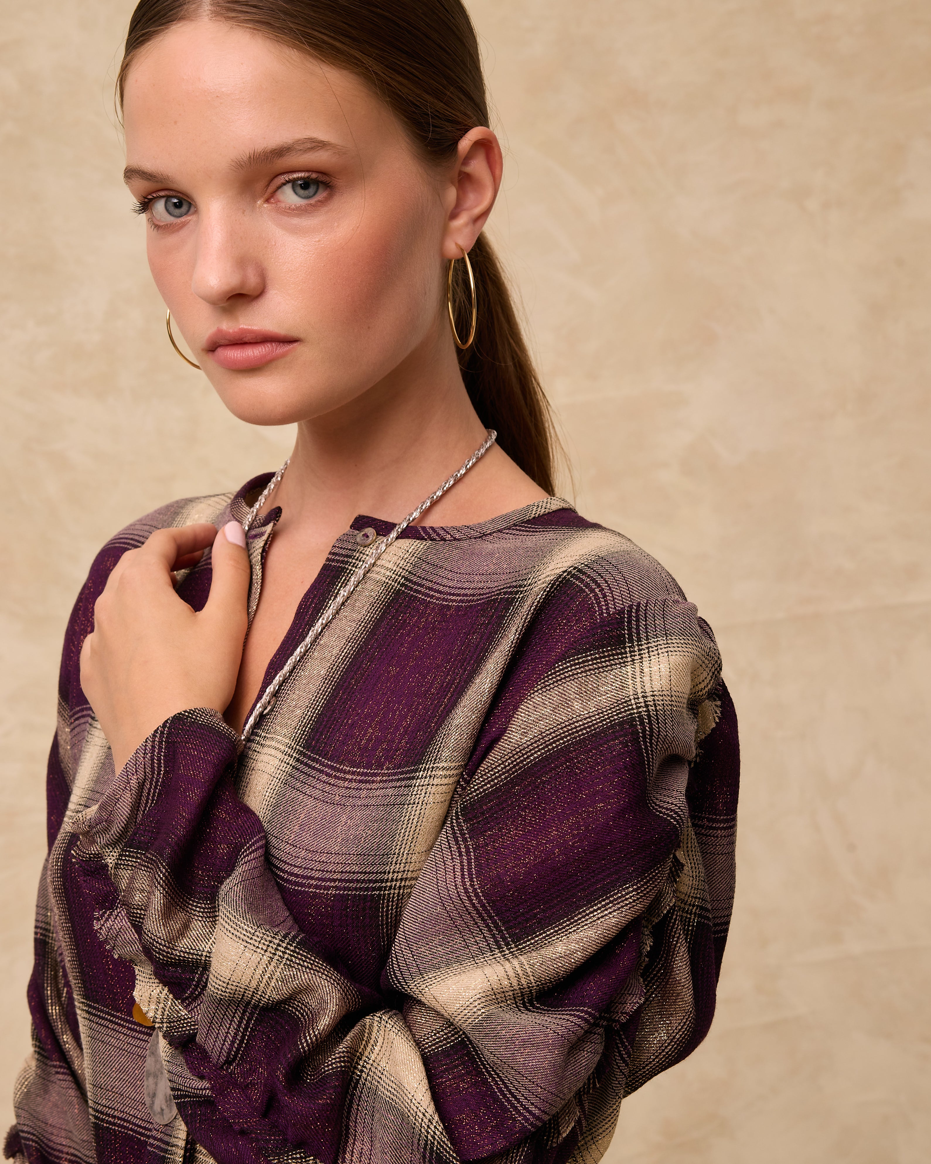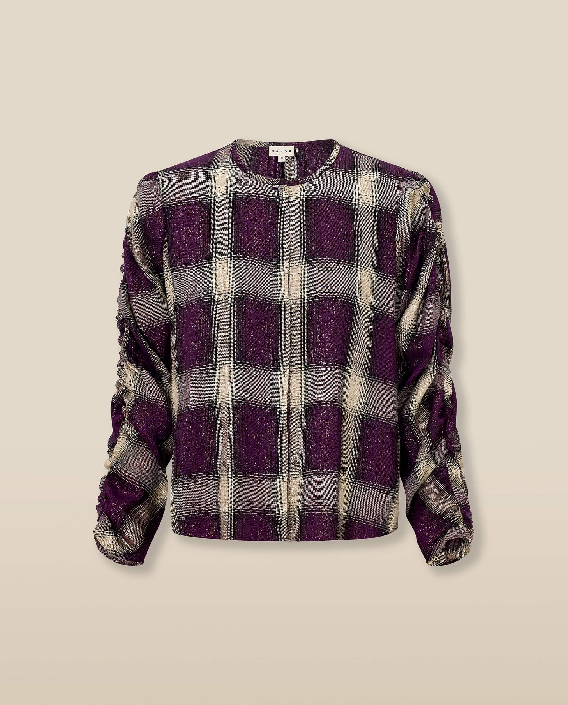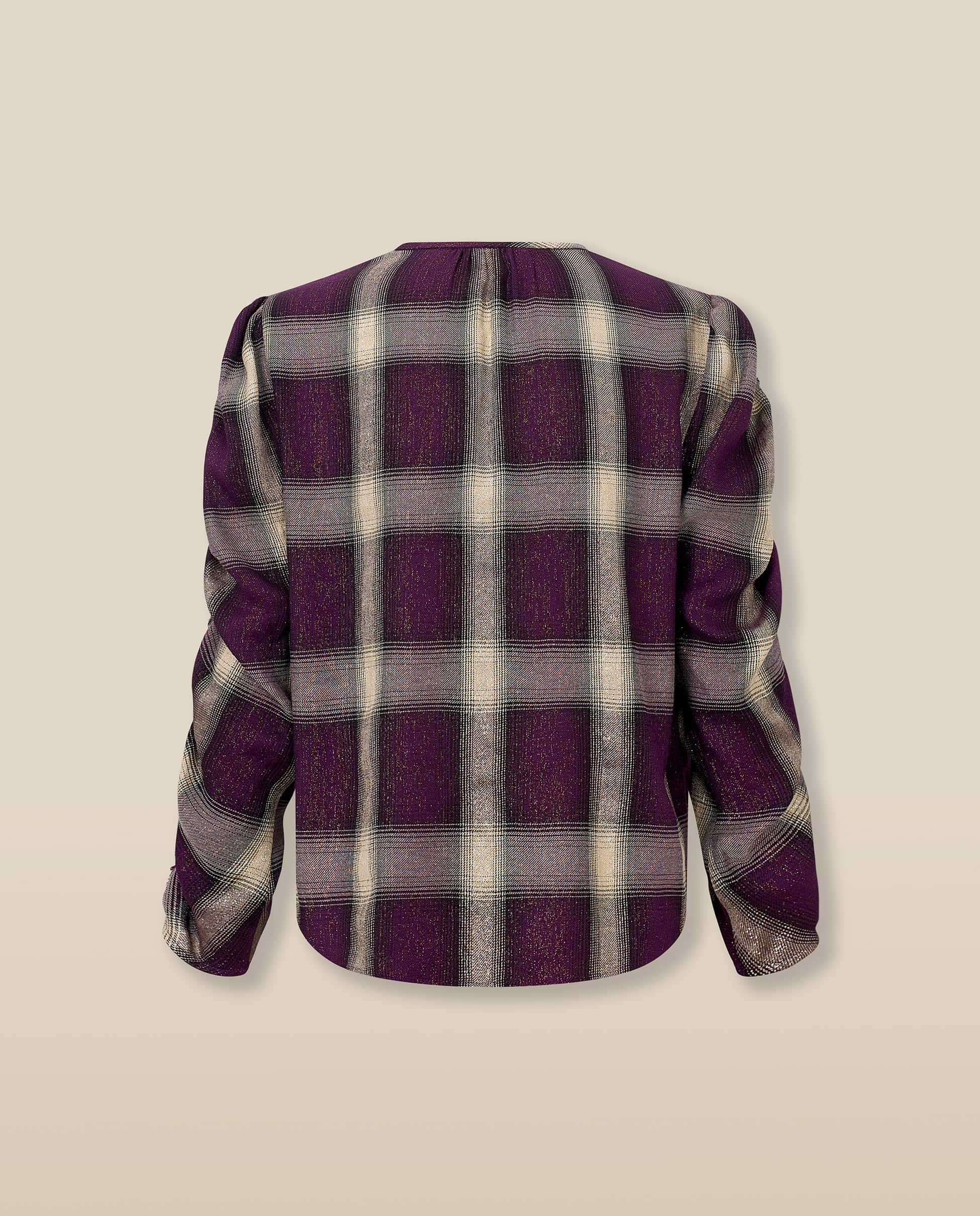 The Arianne blouse is crafted from Italian check fabric in rich aubergine and neutral tones, woven with subtle golden lurex for a soft shimmer. Designed with a clean round neckline and a single visible button at the top, it fastens through a concealed front placket for a minimal finish. The long sleeves are softly ruched for added texture and movement. • Italian check with golden lurex thread • Round neckline with single top button and concealed placket • Ruched long sleeves in a softly structured silhouette