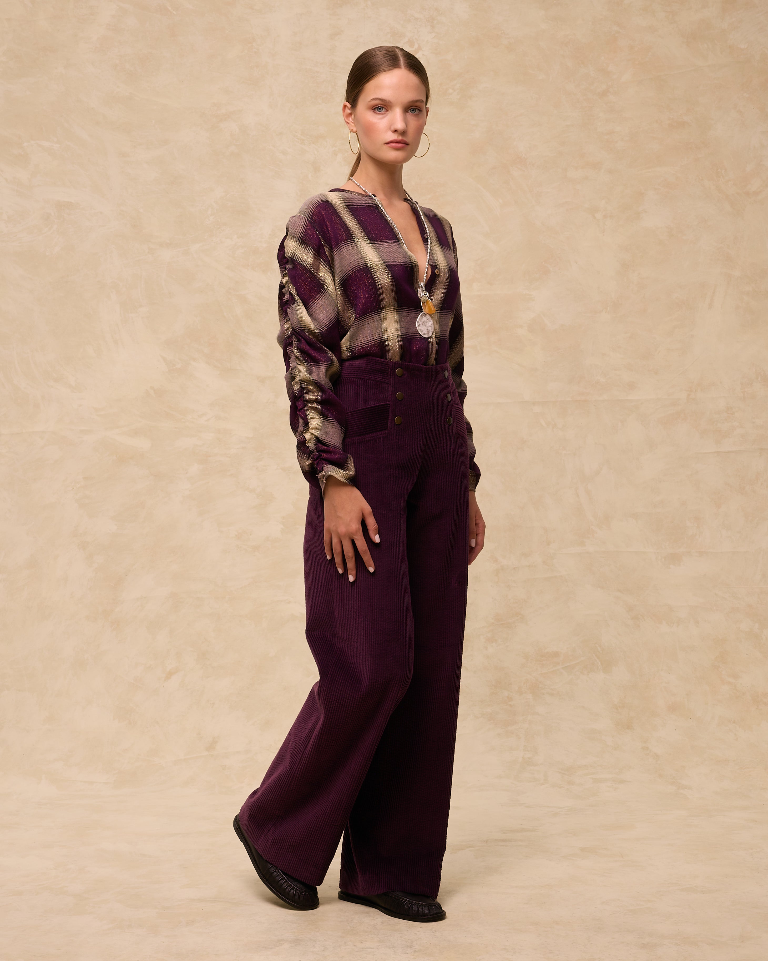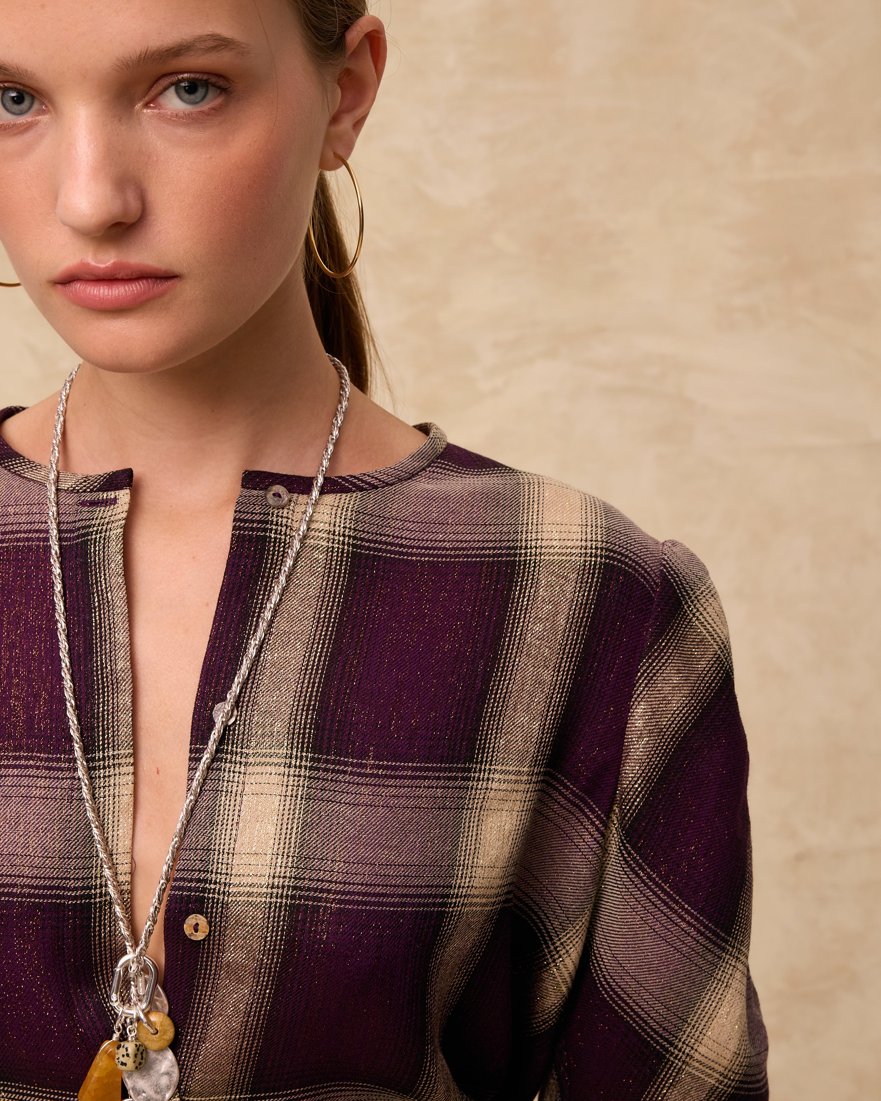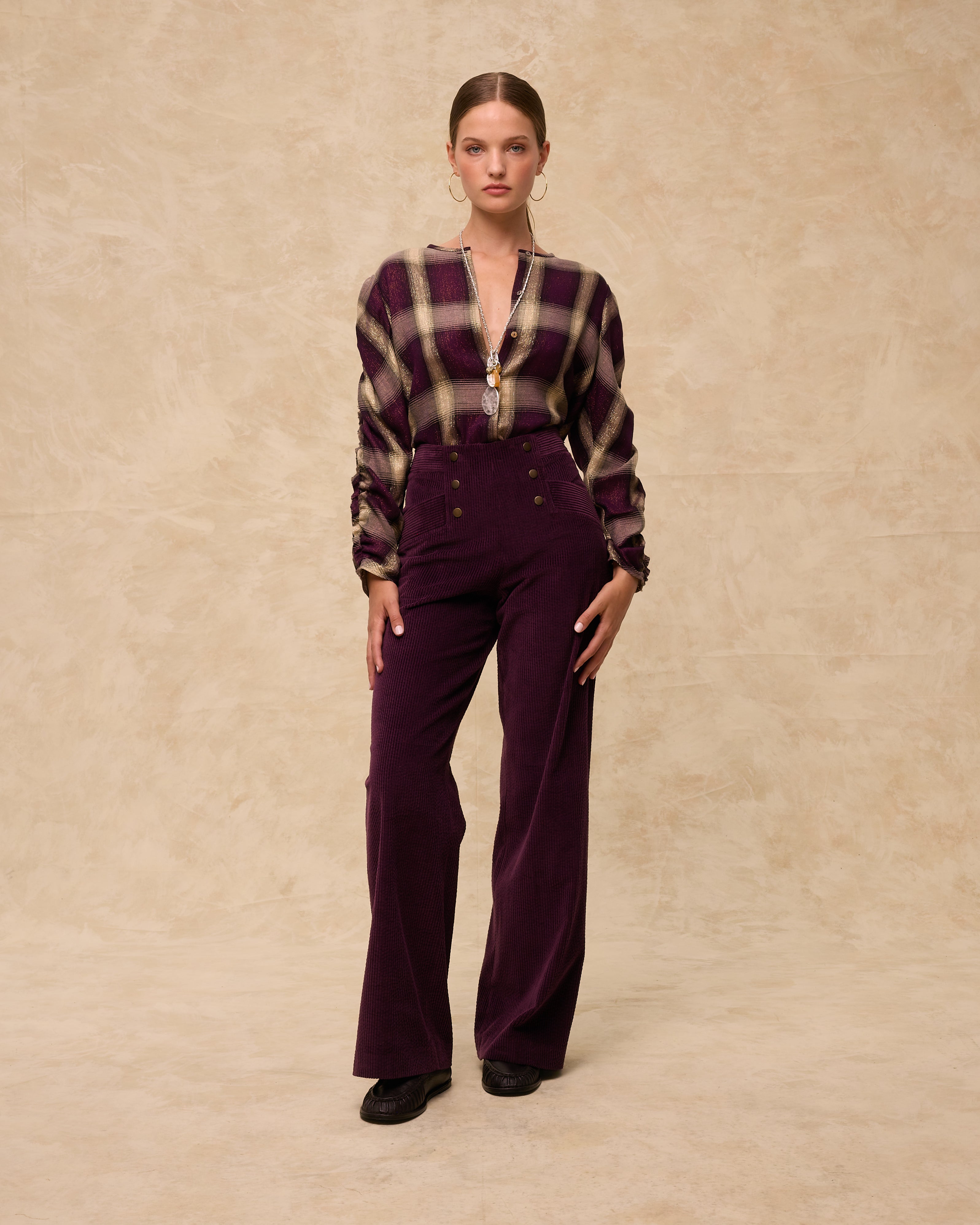 The Arianne blouse is crafted from Italian check fabric in rich aubergine and neutral tones, woven with subtle golden lurex for a soft shimmer. Designed with a clean round neckline and a single visible button at the top, it fastens through a concealed front placket for a minimal finish. The long sleeves are softly ruched for added texture and movement. • Italian check with golden lurex thread • Round neckline with single top button and concealed placket • Ruched long sleeves in a softly structured silhouette