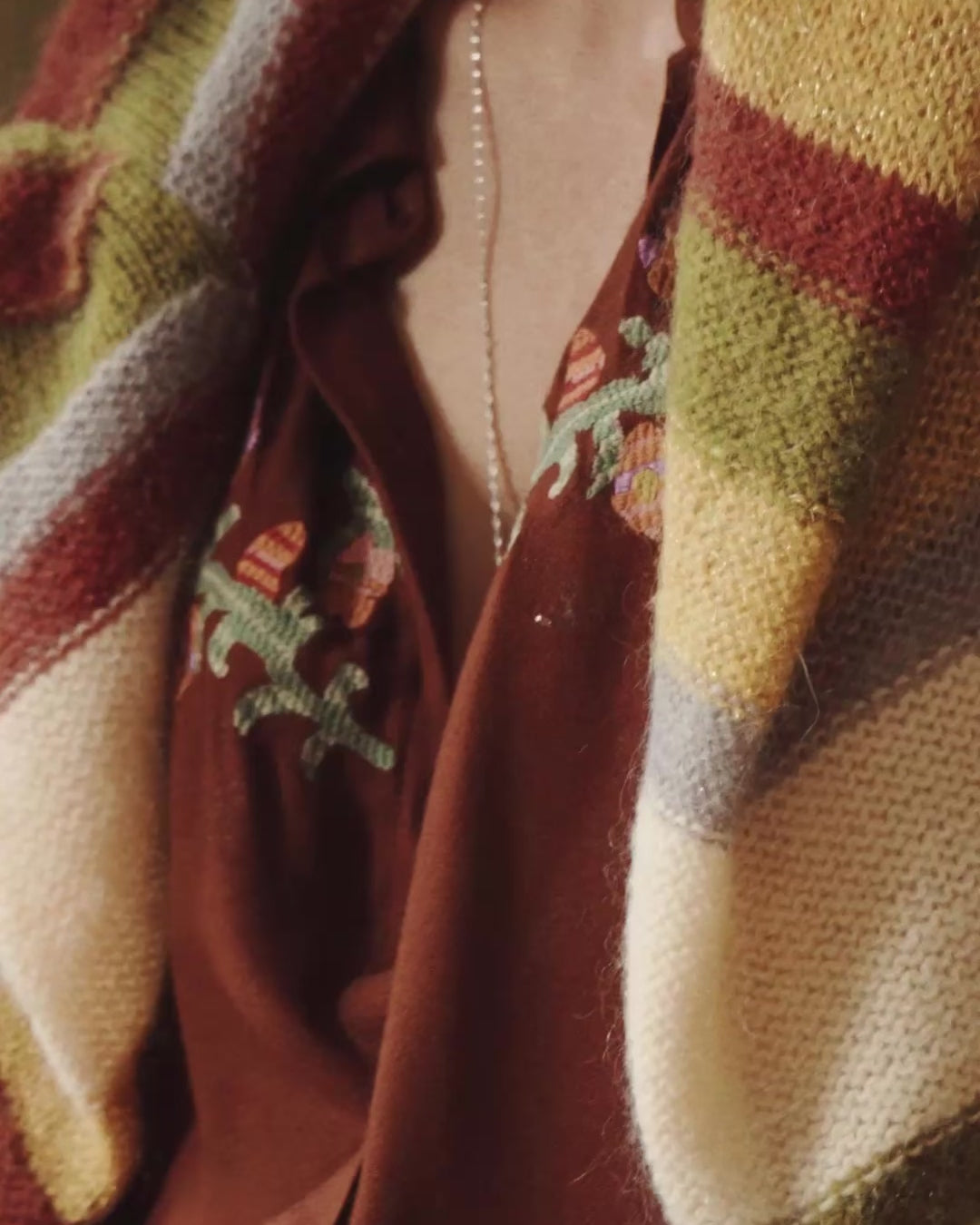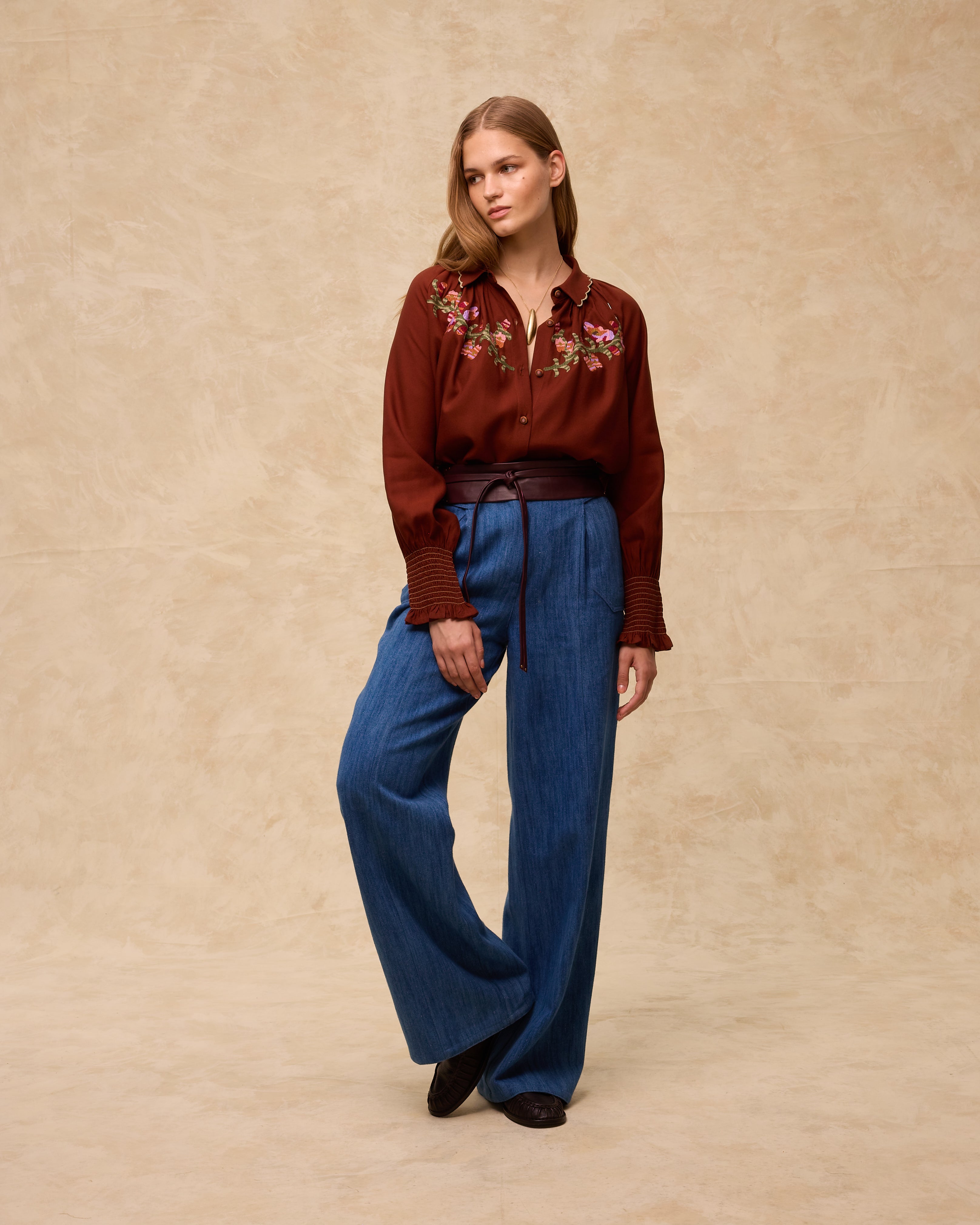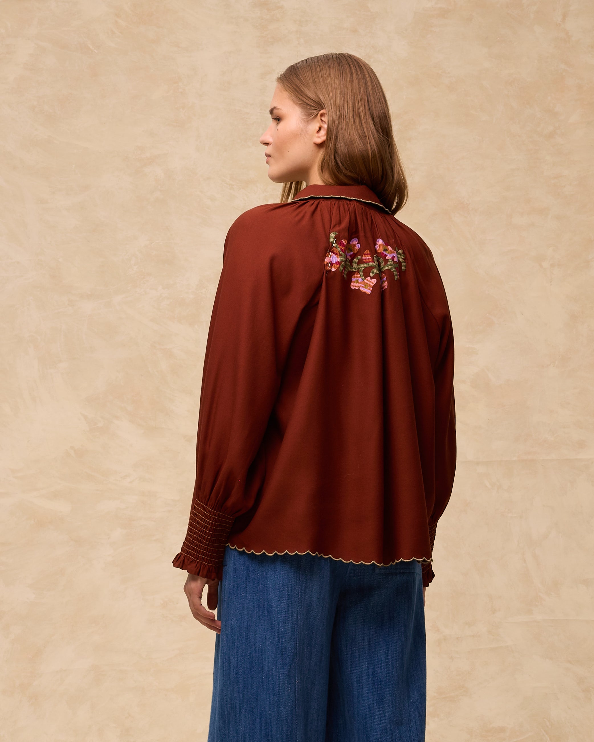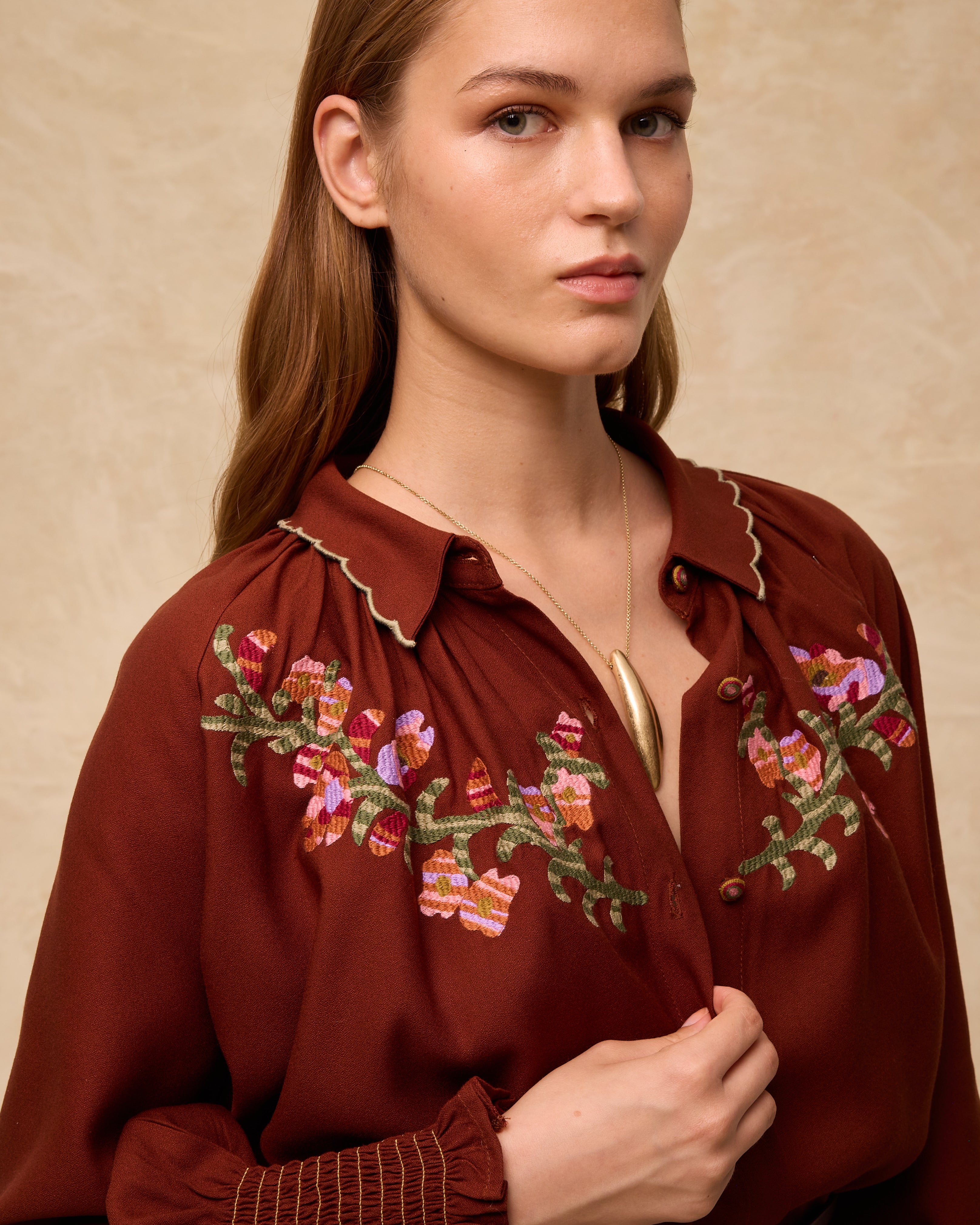 Rooted in artisanal detail, the Botanic blouse is cut from fluid fabric in a rich chestnut brown and features floral embroidery in shades of pink, purple and green. Designed with a softly gathered silhouette, it includes a scalloped collar, button fastenings and smocked cuffs with delicate frill edging.