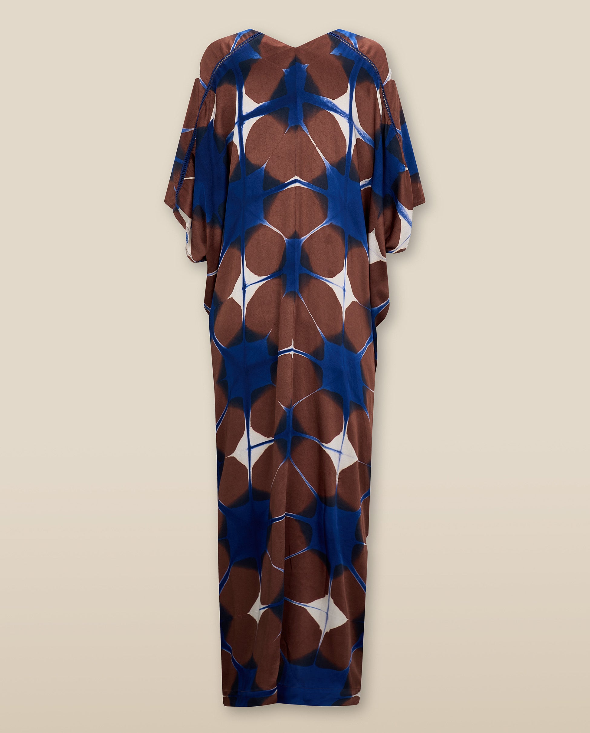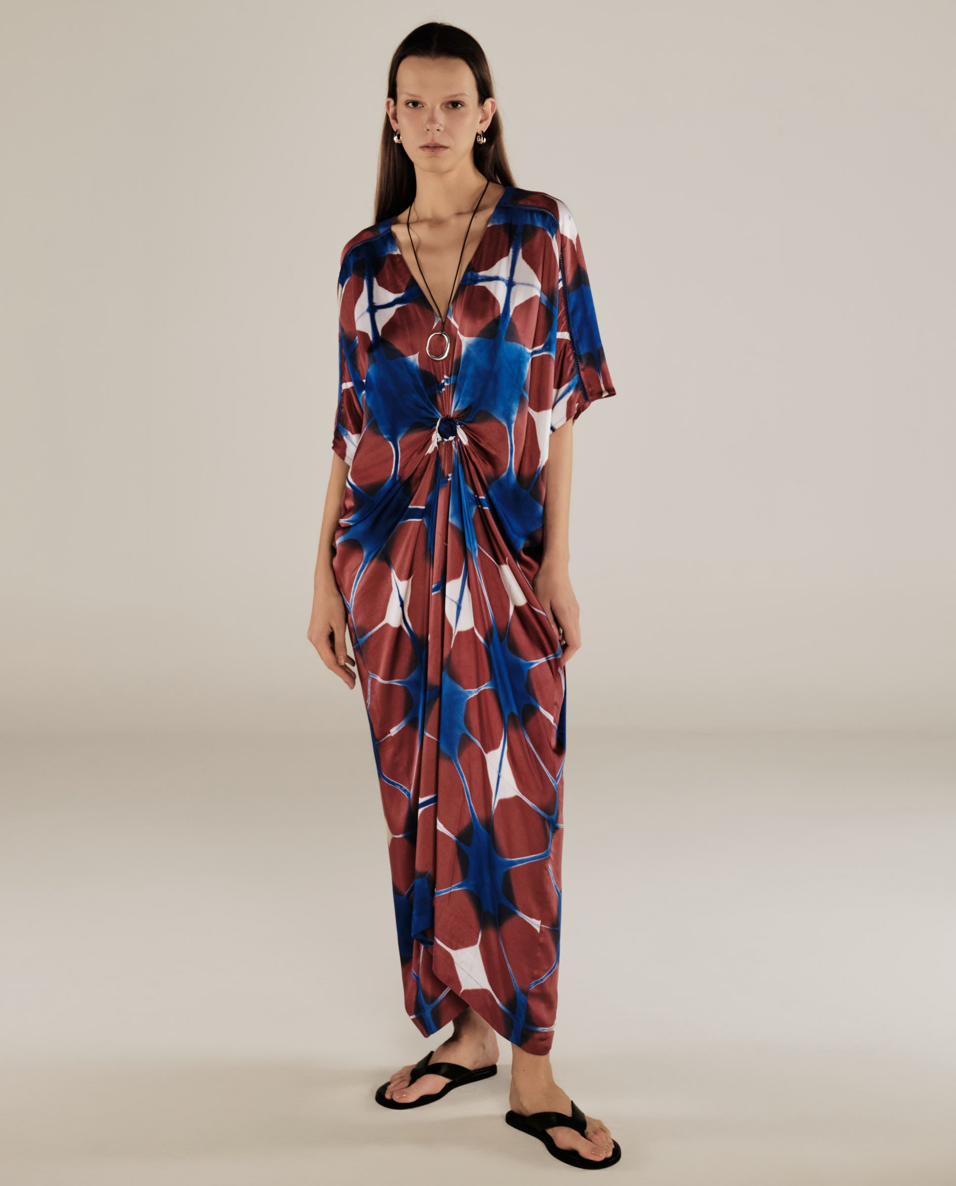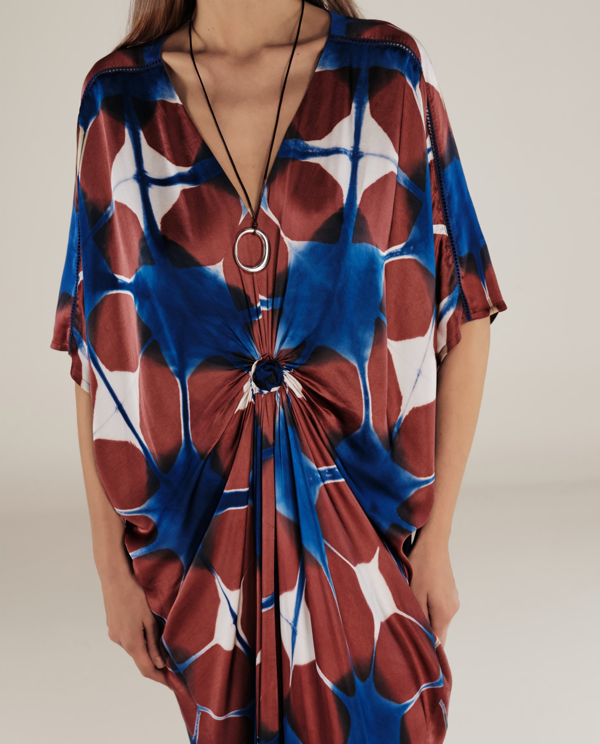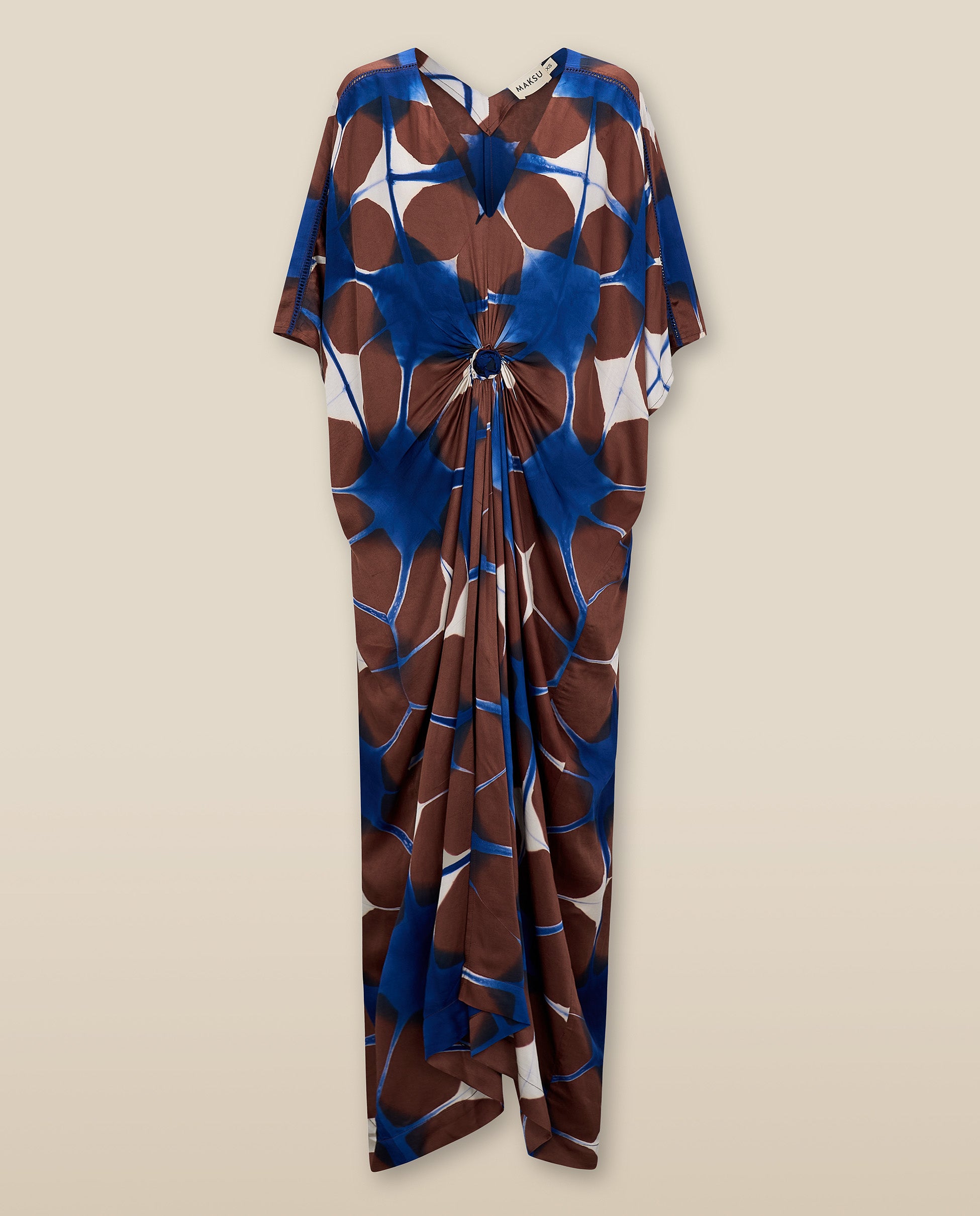 Celebrating free-spirited style, the Bruna Tunic showcases an artistic abstract print in lush blues and browns. Cut in a relaxed, draped silhouette, this kaftan-inspired piece cinches effortlessly at the front with a subtle knot detail—perfectly capturing MAKSU’s dreamy, wanderlust-infused aesthetic. The soft V-neckline and flowing sleeves create an elongated shape, adding an understated elegance to this statement-making tunic.