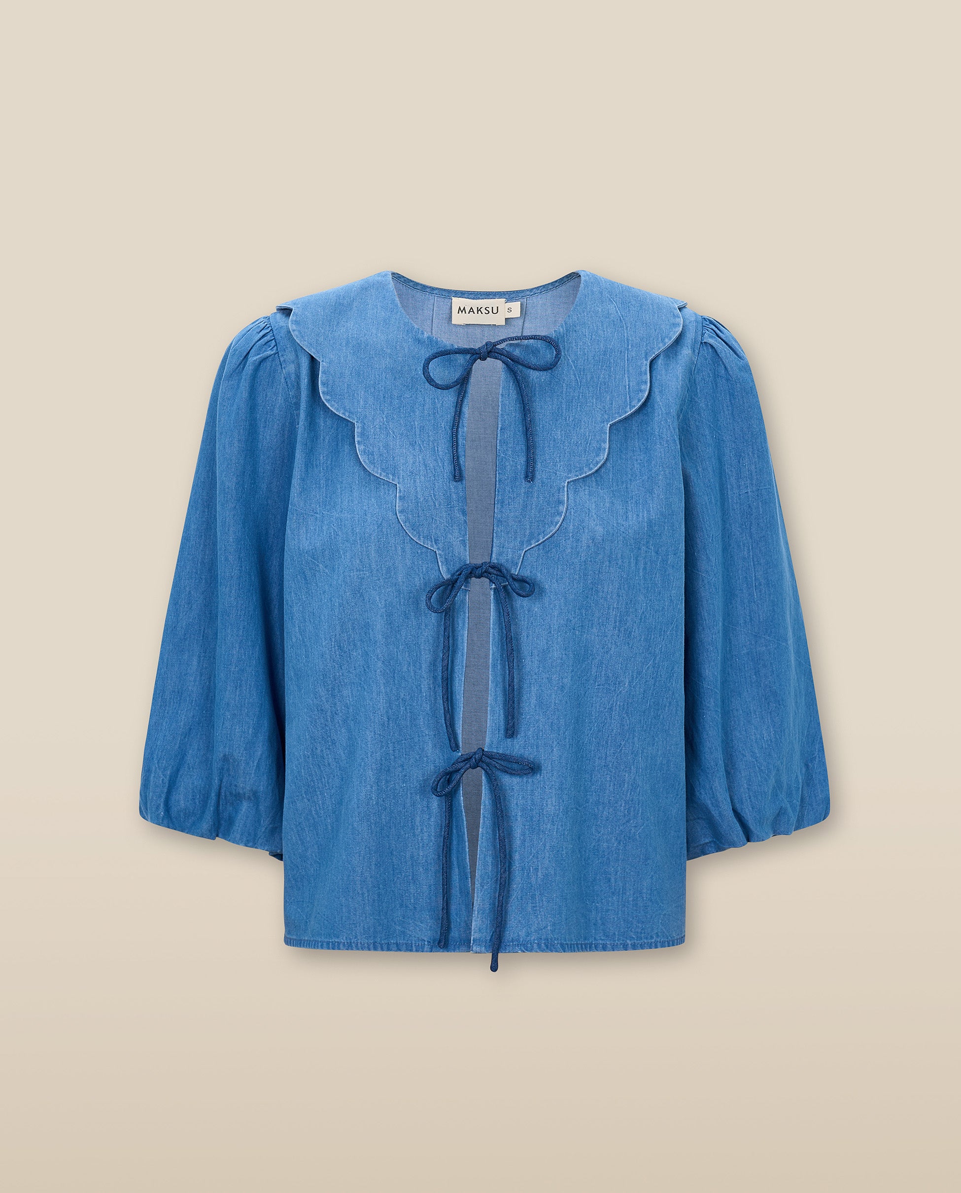 The Brunella Blouse reimagines denim with a romantic twist—featuring a flattering scalloped collar and bow tie closures. Voluminous three-quarter sleeves imbue a carefree bohemian vibe, while the lightweight denim ensures day-long comfort. Perfect for dressing up a casual look or adding texture to a tailored ensemble.
