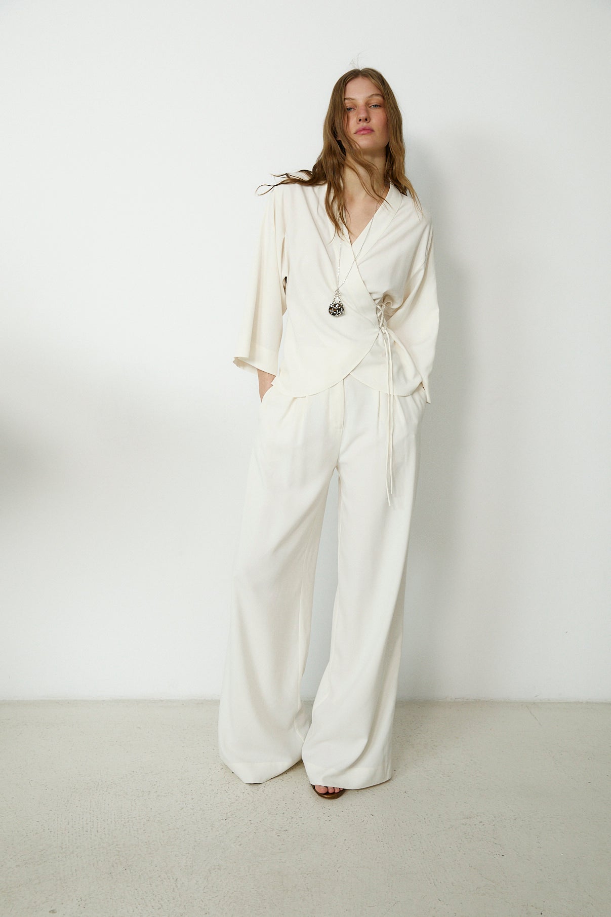 The Lourdes Trousers offer a refined balance of structure and movement. Designed to sit high on the waist, they fall into a wide leg silhouette that elongates the frame. Crafted from the same natural silk as the matching blazer, they create a clean, effortless foundation for a coordinated look.