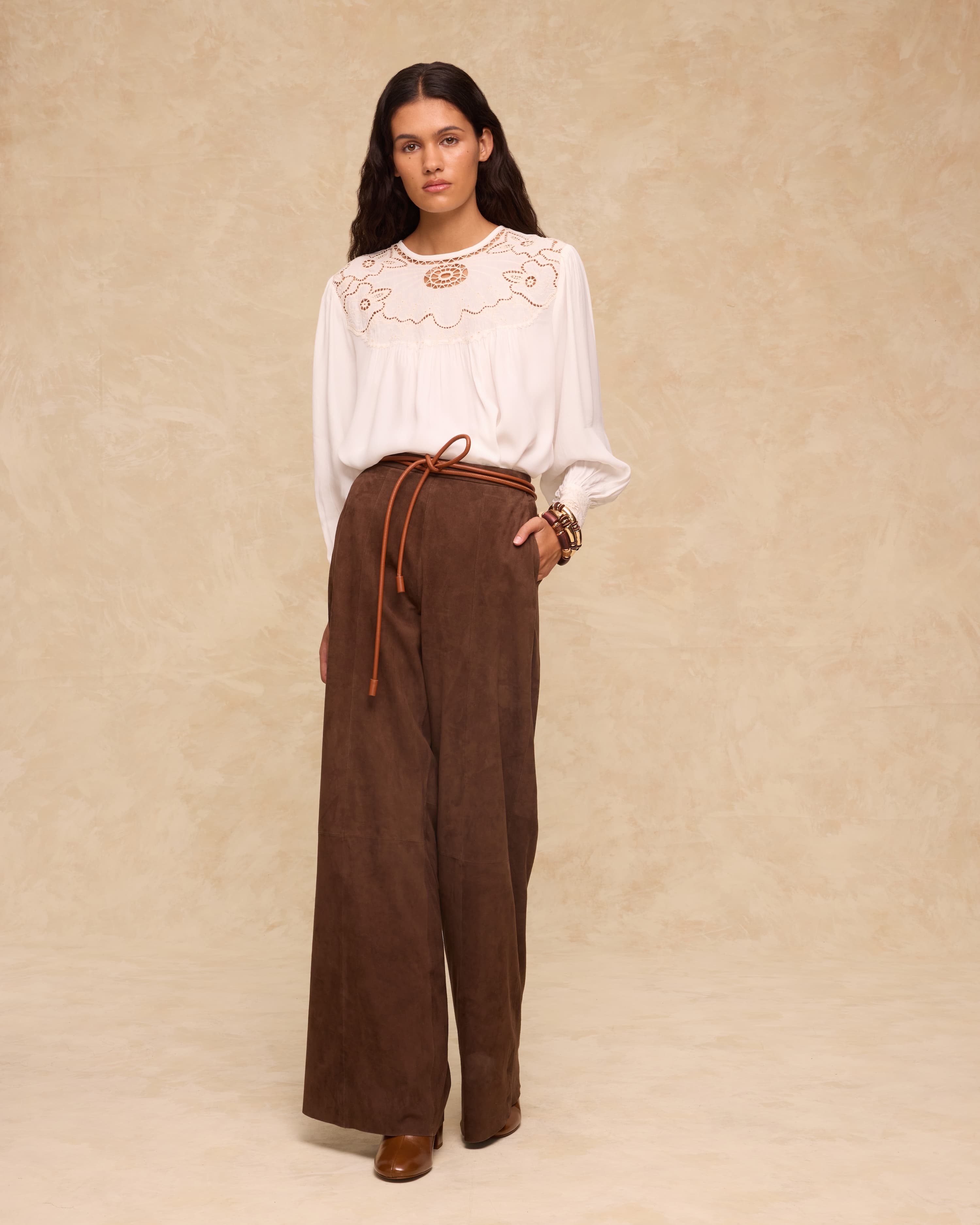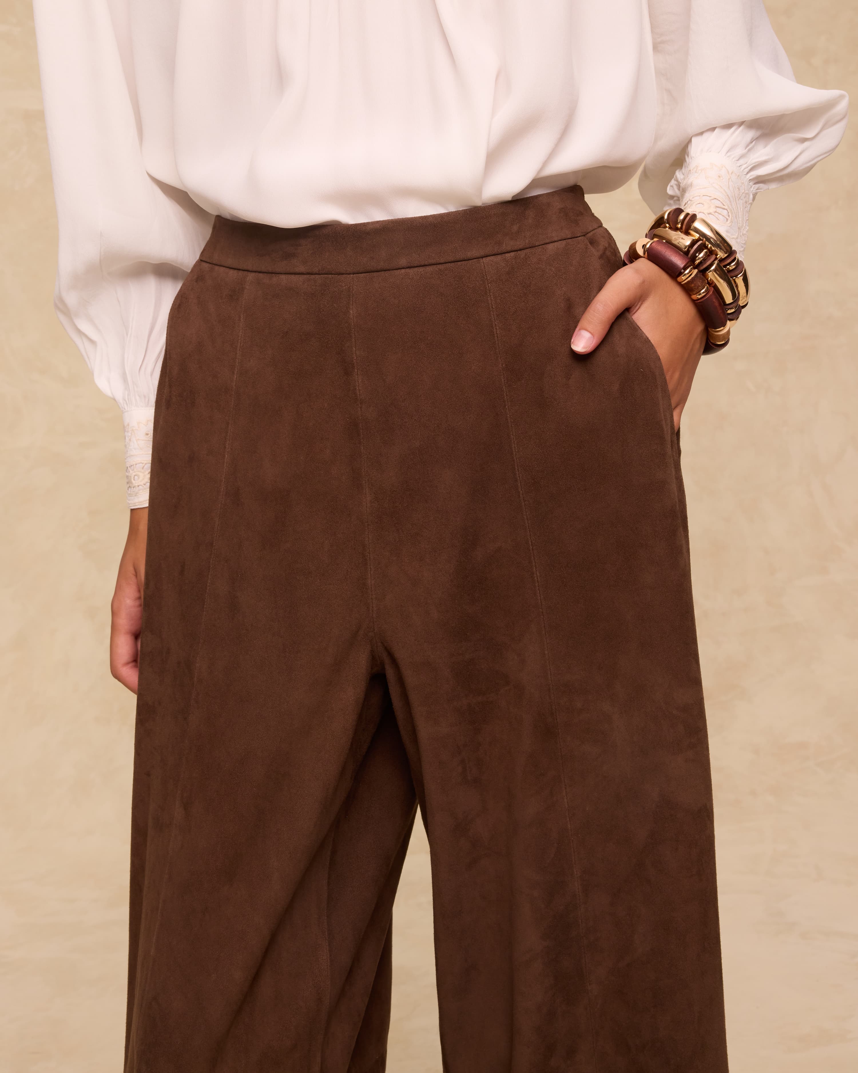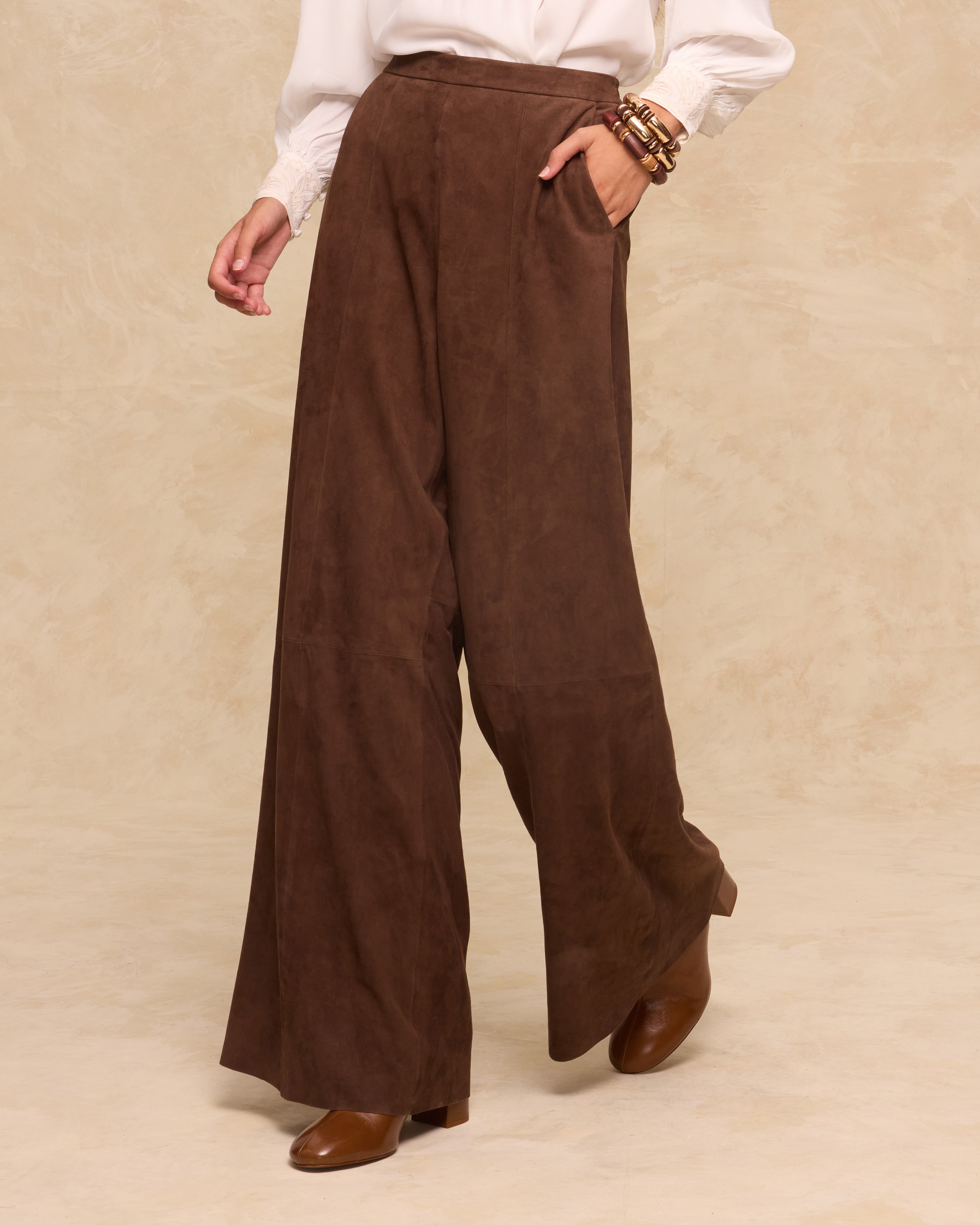 Cut from 100% goat leather suede, the Mocha trousers combine softness with structure in a rich, deep brown tone. Designed to sit high on the waist, they feature a clean waistband, subtle front seams and generous wide legs for graceful movement. Side pockets add functionality, while the fluid silhouette makes them ideal for elevating day-to-evening looks.