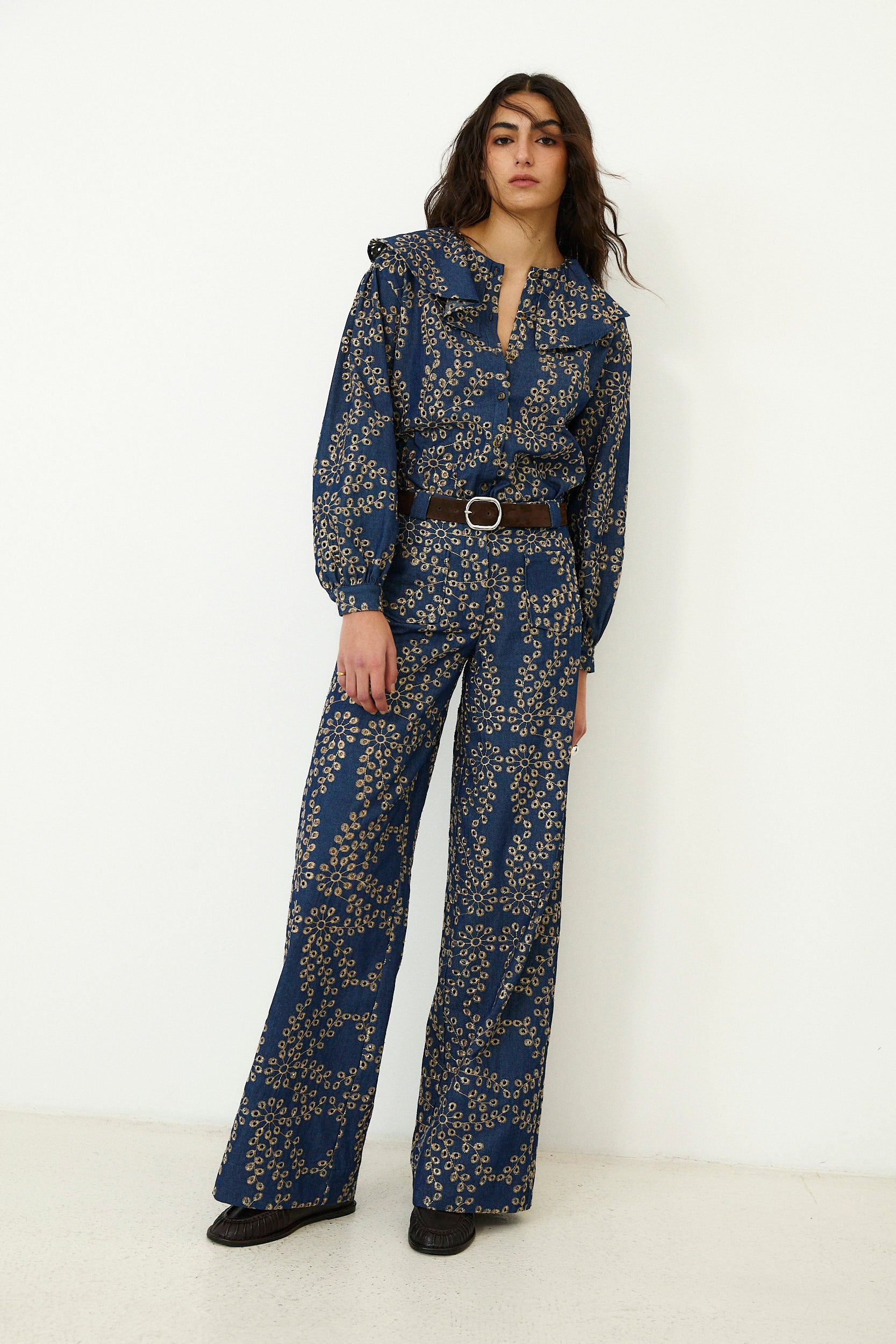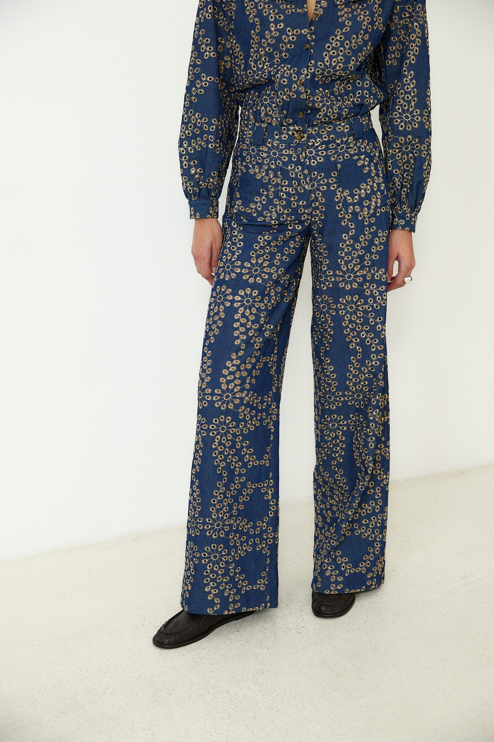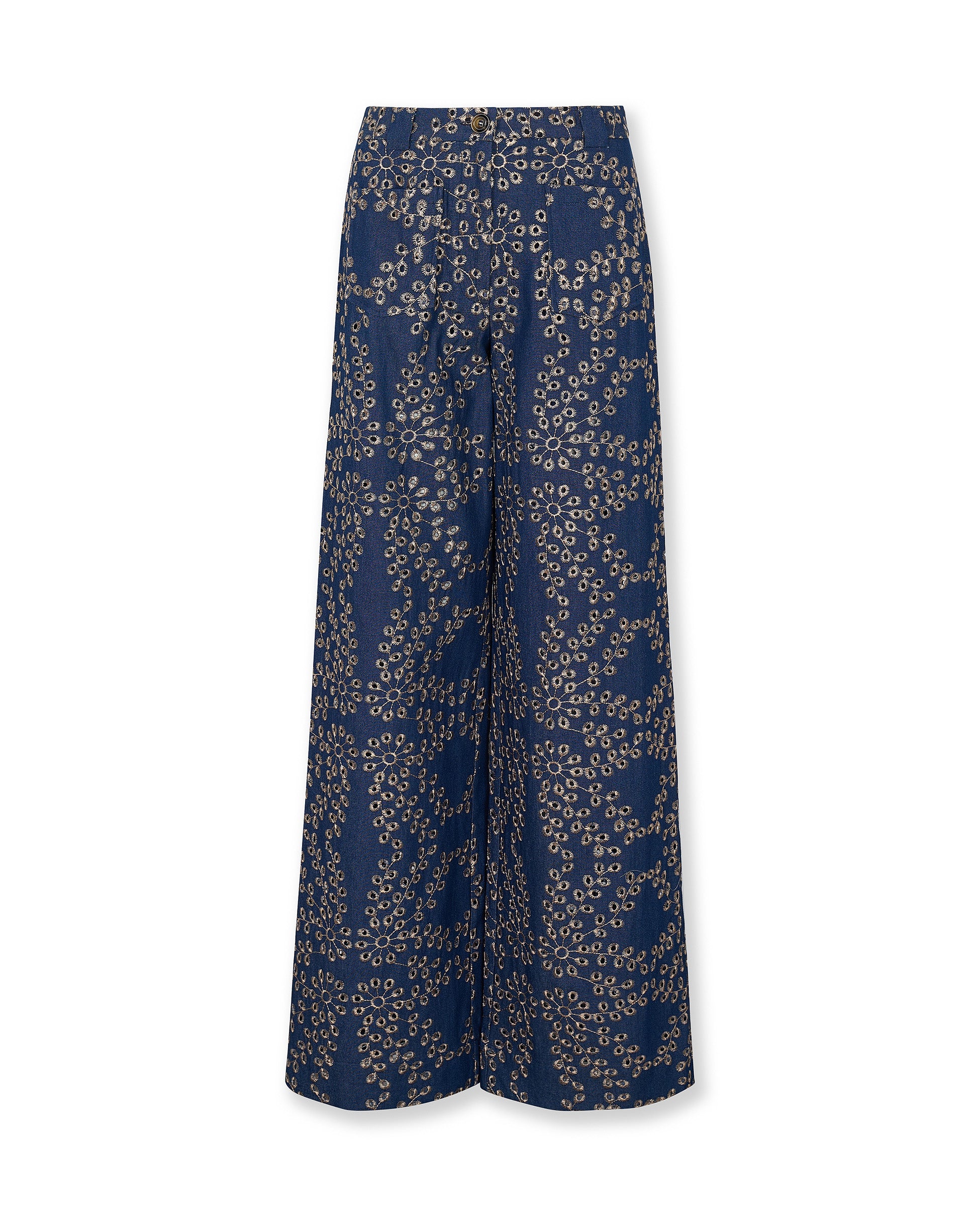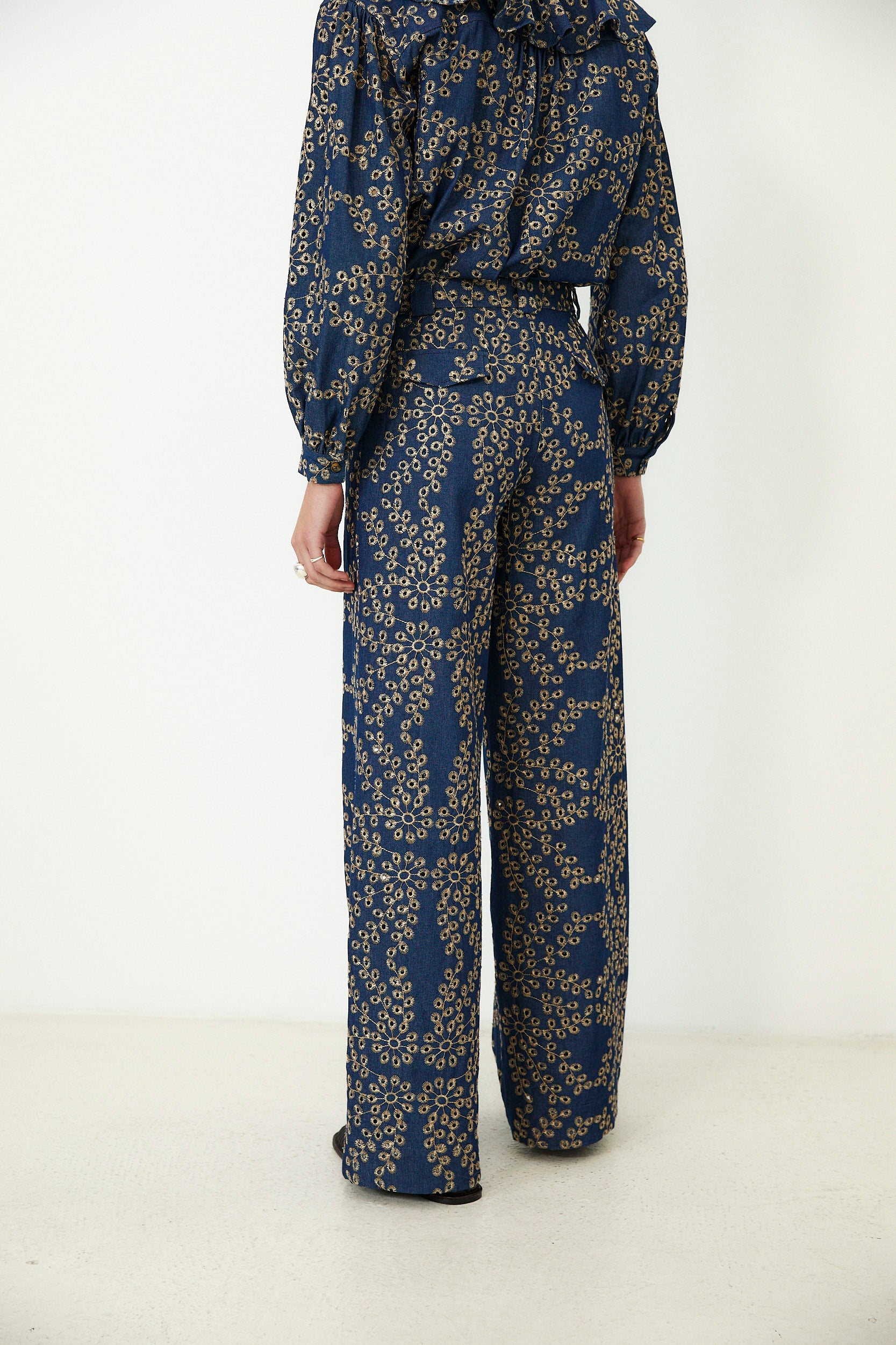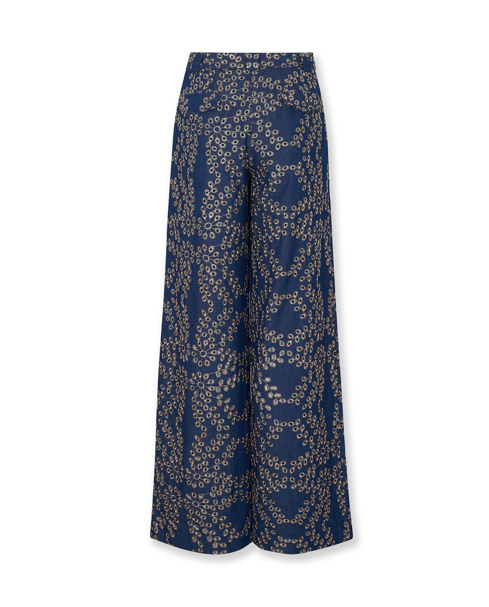 Crafted from 100% Italian cotton, the Skystitch trousers are designed to make everyday dressing feel considered. Cut to a high rise, wide leg silhouette, they feature intricate all over embroidery in soft contrast tones for a statement finish with refined texture. Pair with the matching blouse for effortless coordination.