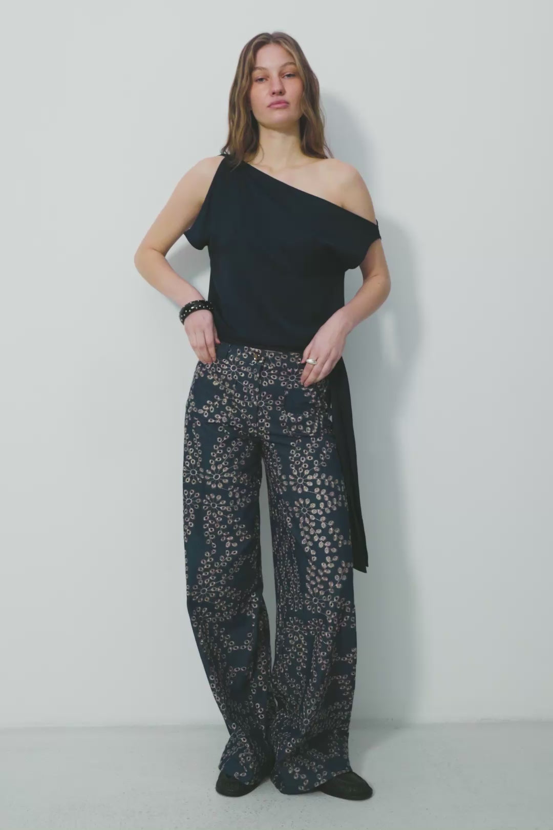 • High-rise, wide-leg silhouette with a fluid drape
