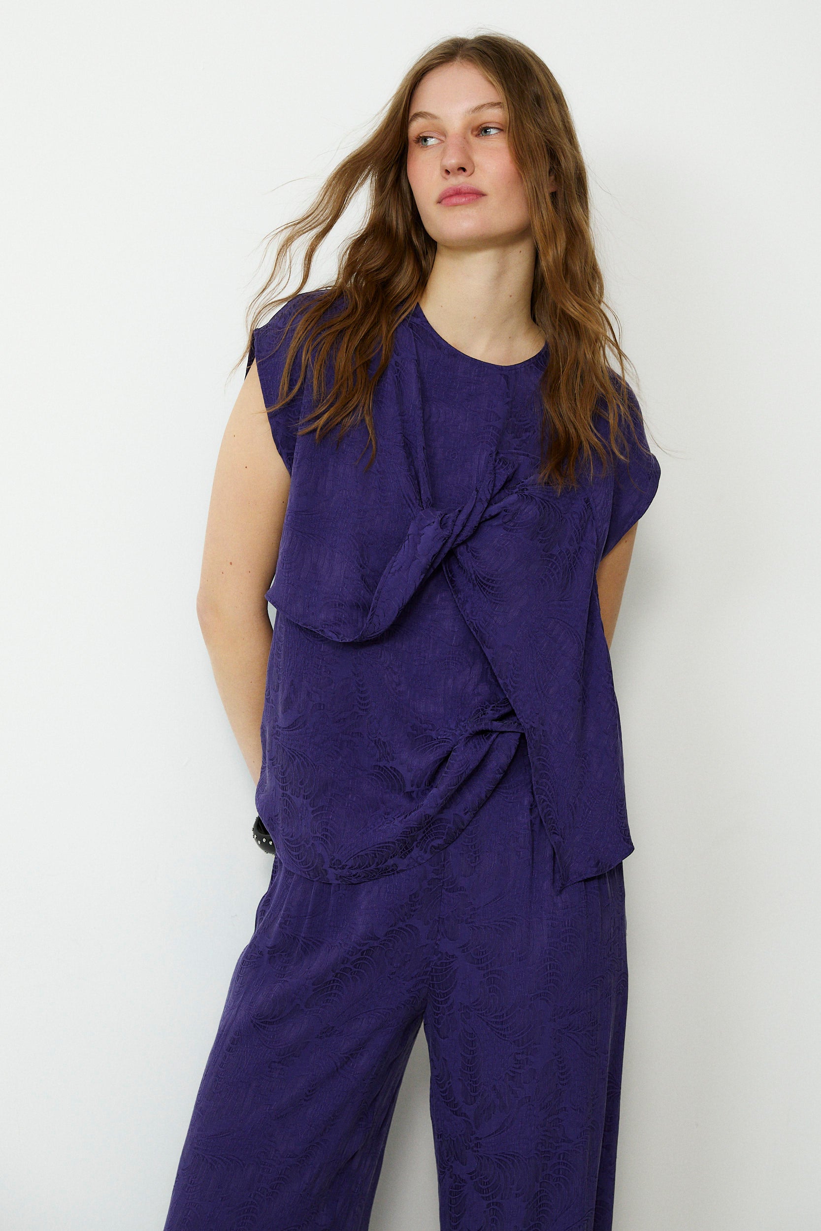 Cut in a rich dark purple cupro blend with a tonal jacquard finish, the Sultana trousers bring fluid movement and a refined feel to occasion and evening dressing. Designed with a flattering high-rise waist and a wide-leg silhouette, they fall effortlessly through the leg for an elegant line. Pair with the matching Sultana twist front top for a coordinated look.