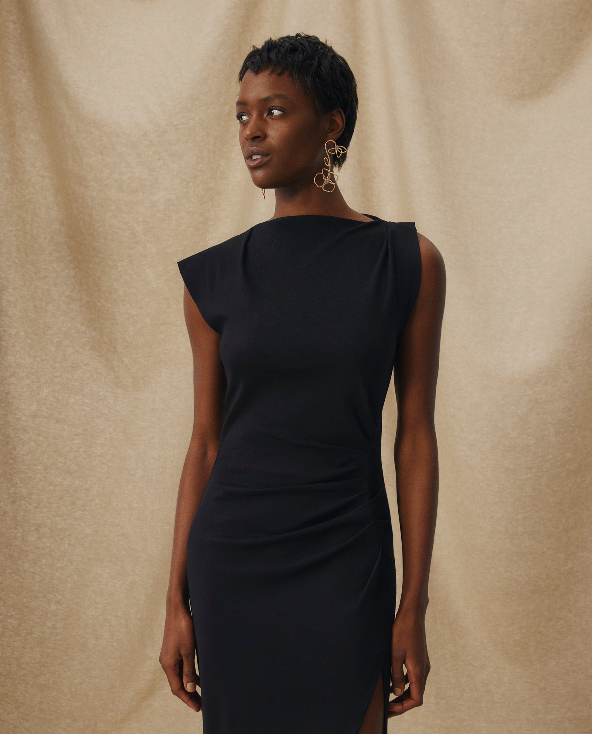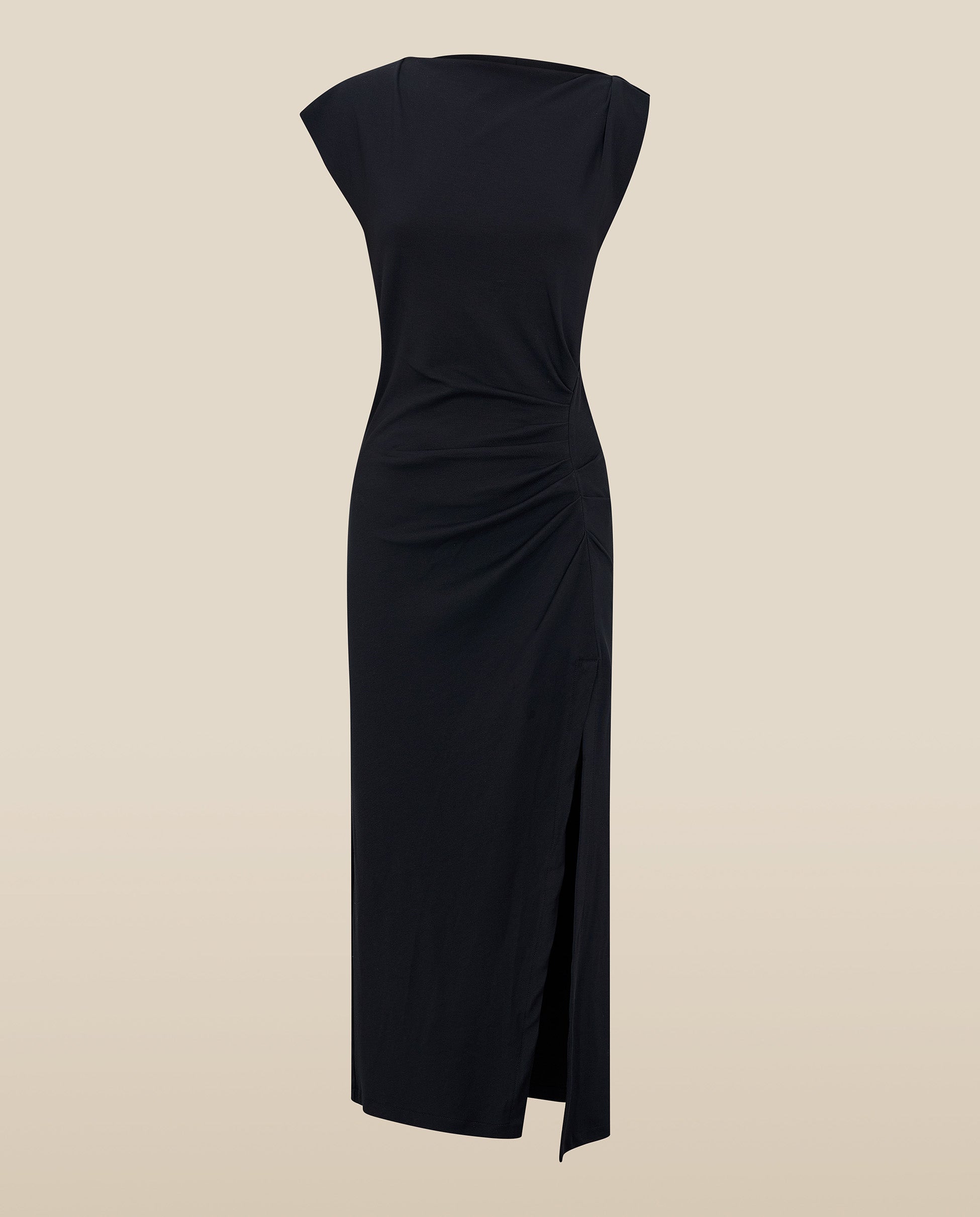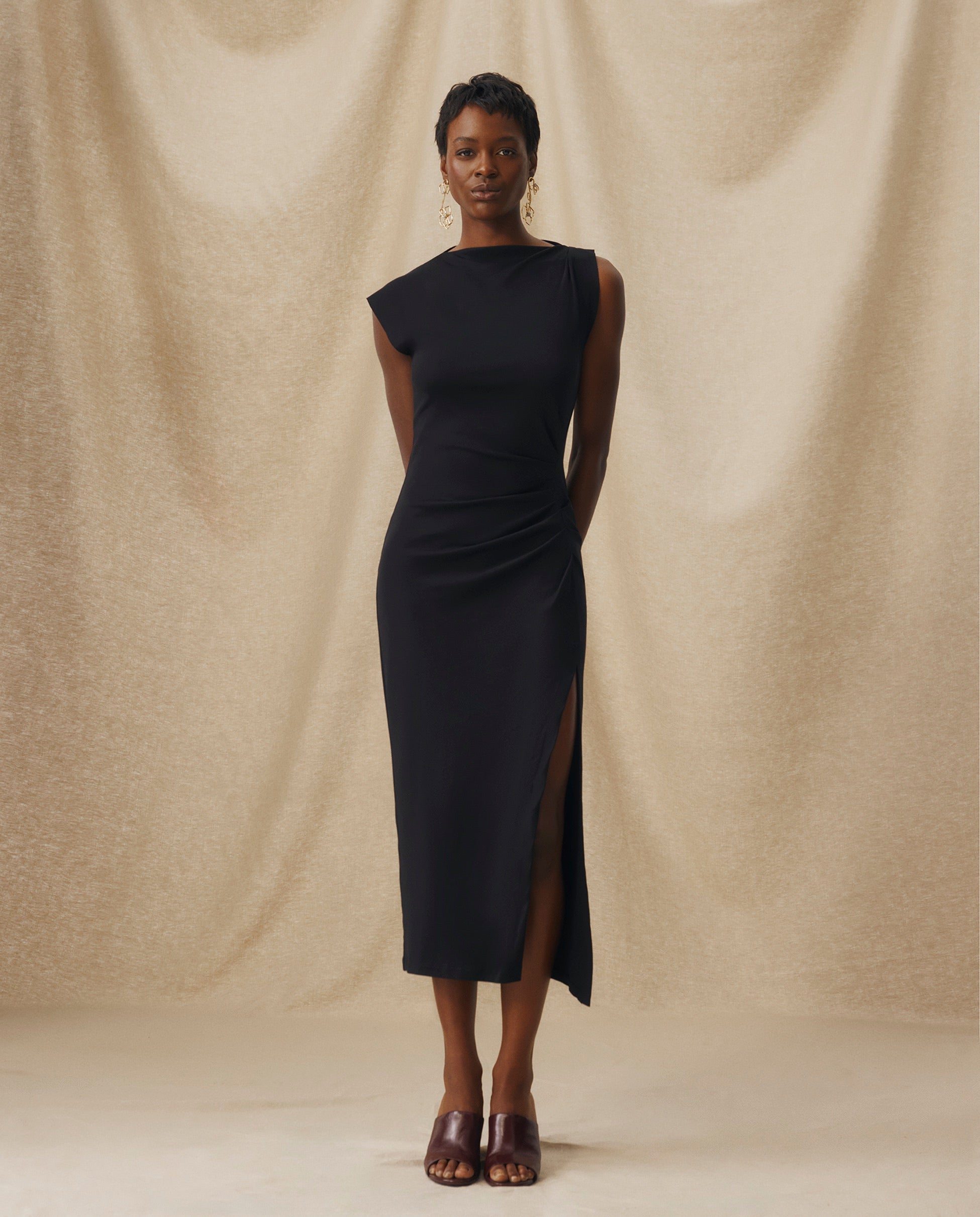 Sleek and sculptural, the Allie Dress in classic black is a contemporary classic. Crafted from 100% cotton with natural stretch, it features elegant ruching through the waist for a flattering, softly gathered effect. The high neckline and cap sleeves create a clean, modern silhouette, while the thigh-high split adds a confident edge.
