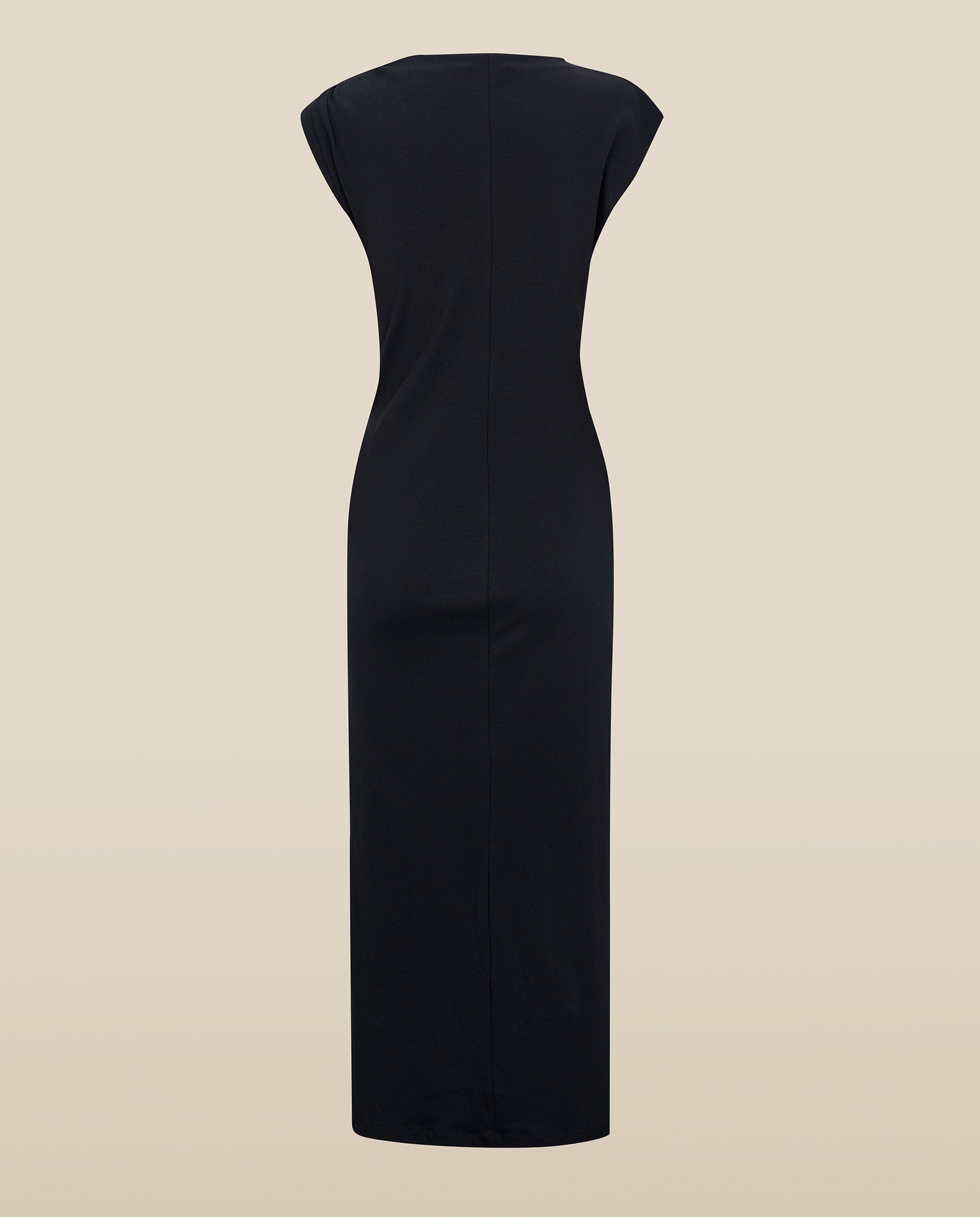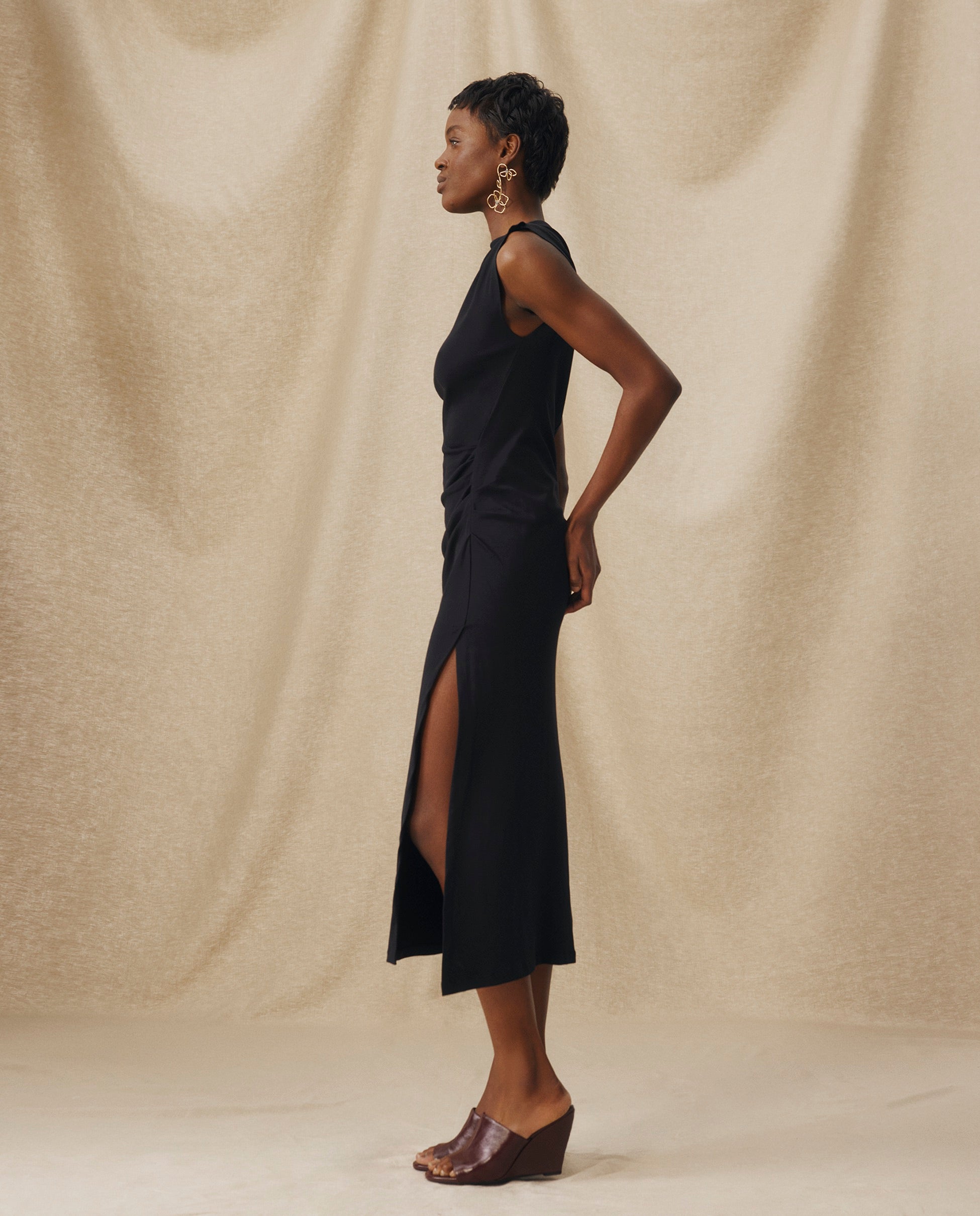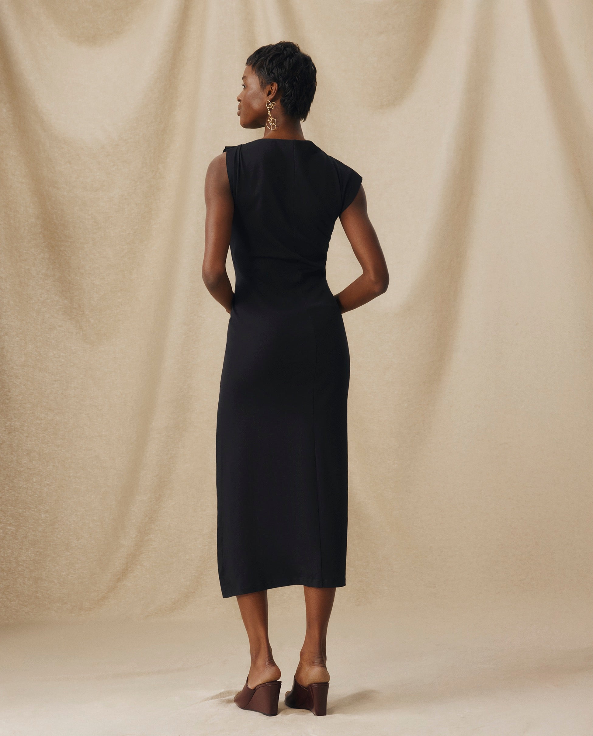 Sleek and sculptural, the Allie Dress in classic black is a contemporary classic. Crafted from 100% cotton with natural stretch, it features elegant ruching through the waist for a flattering, softly gathered effect. The high neckline and cap sleeves create a clean, modern silhouette, while the thigh-high split adds a confident edge.