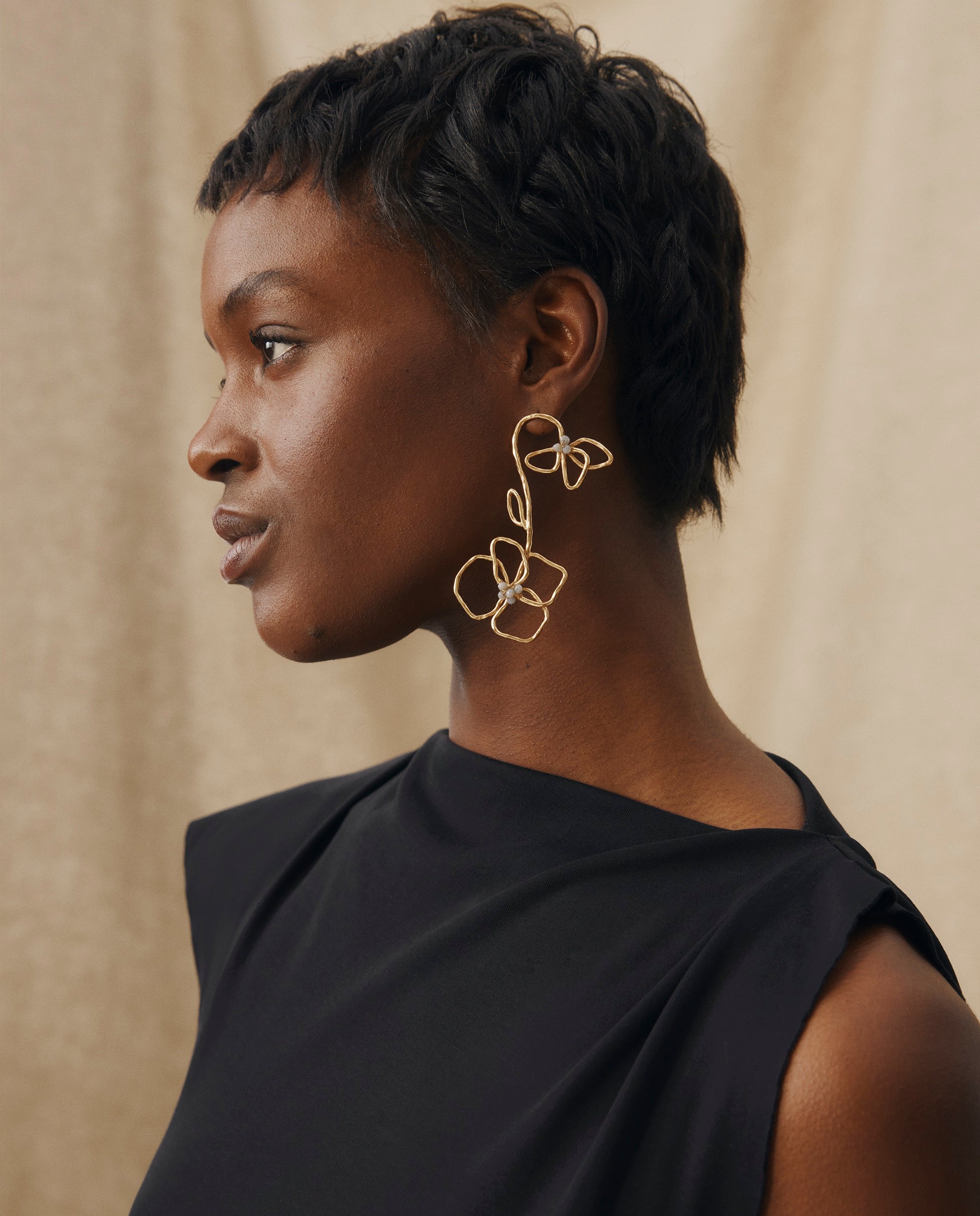 • Cap sleeves and high neckline for a structured, minimalist feel