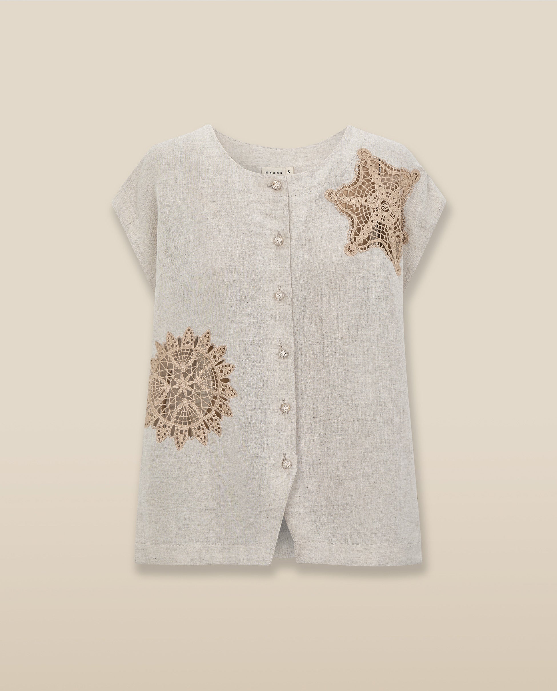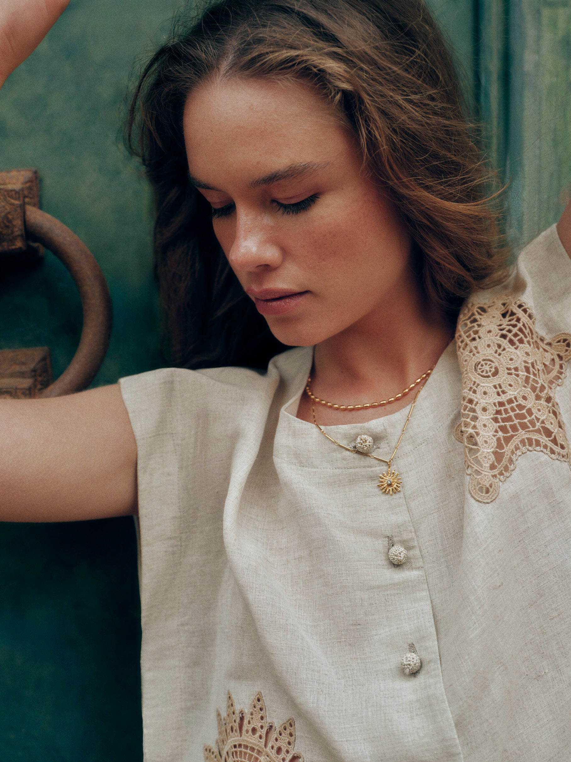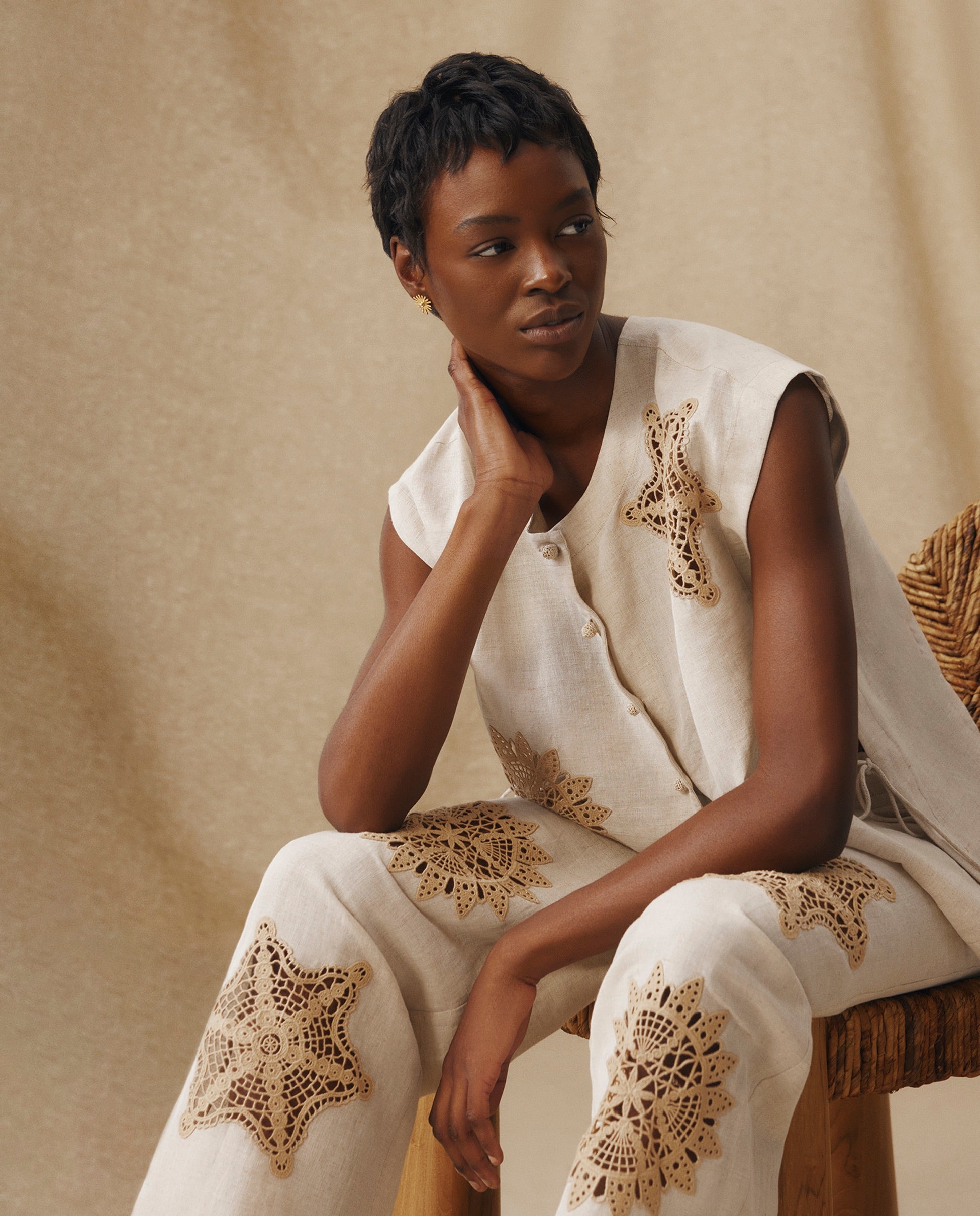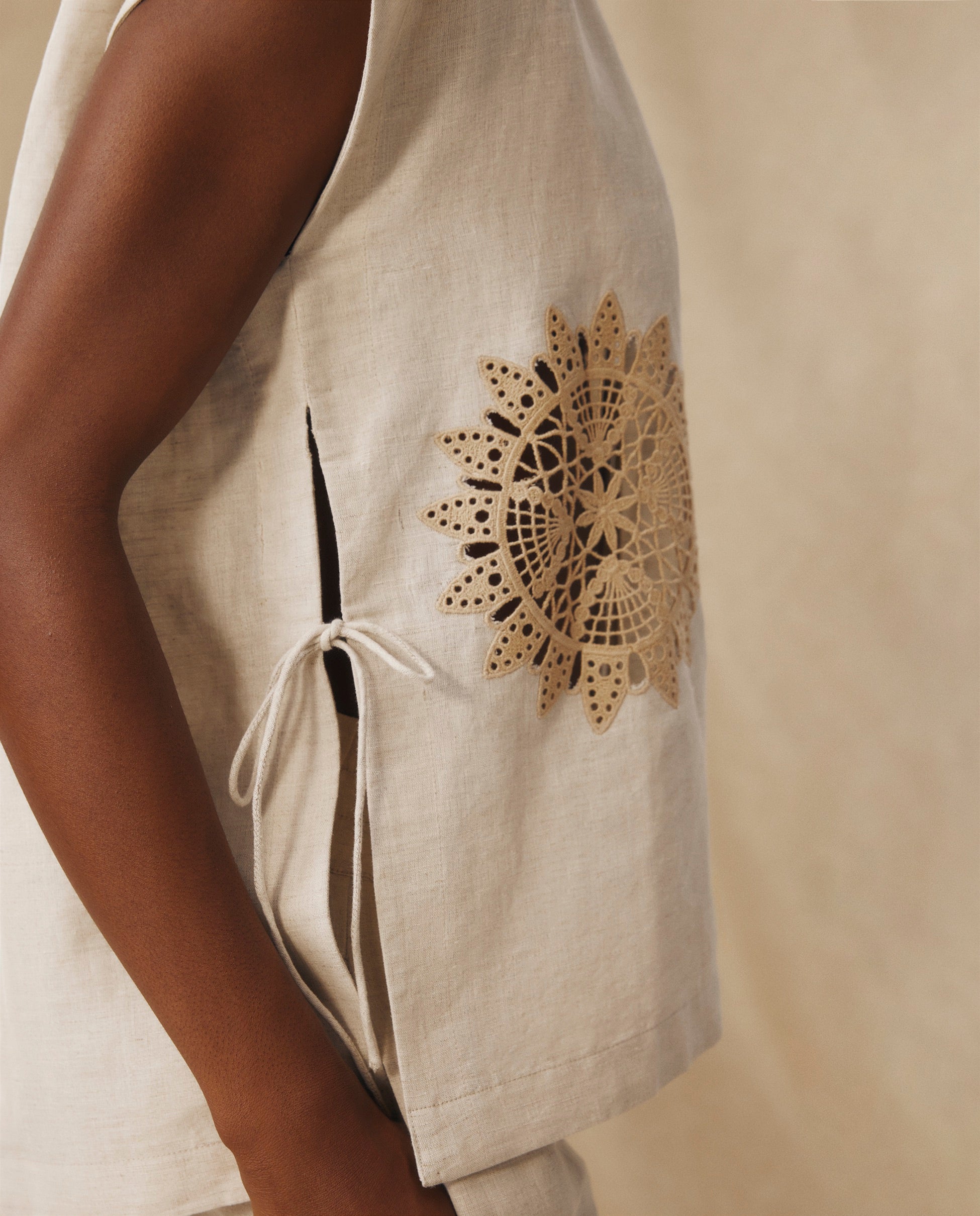 Crafted from a soft linen-cotton blend, the Soma Blouse features intricately embroidered patch motifs and crochet buttons, with adjustable side ties for a personalised fit. Style with the matching trousers for a coordinated look.