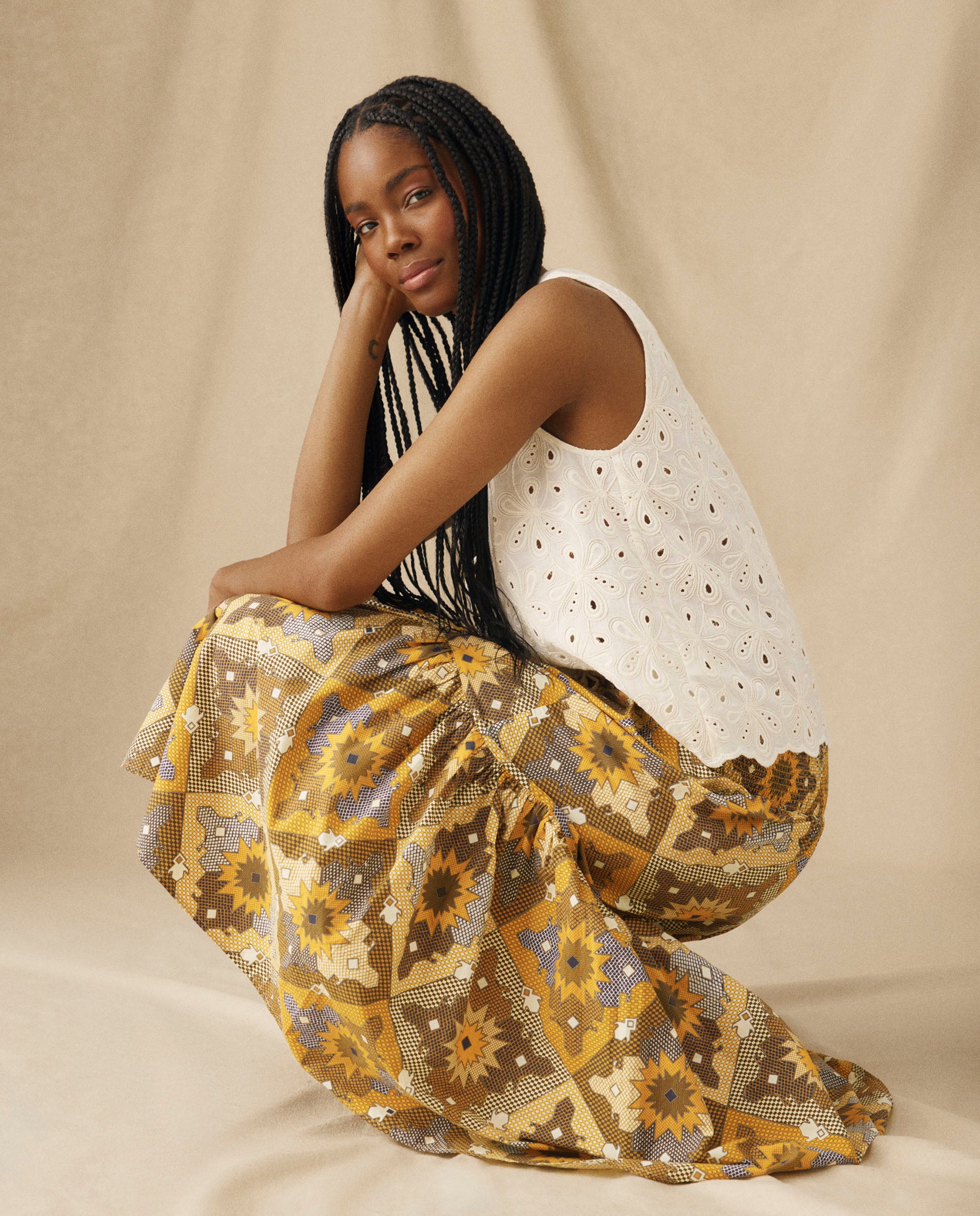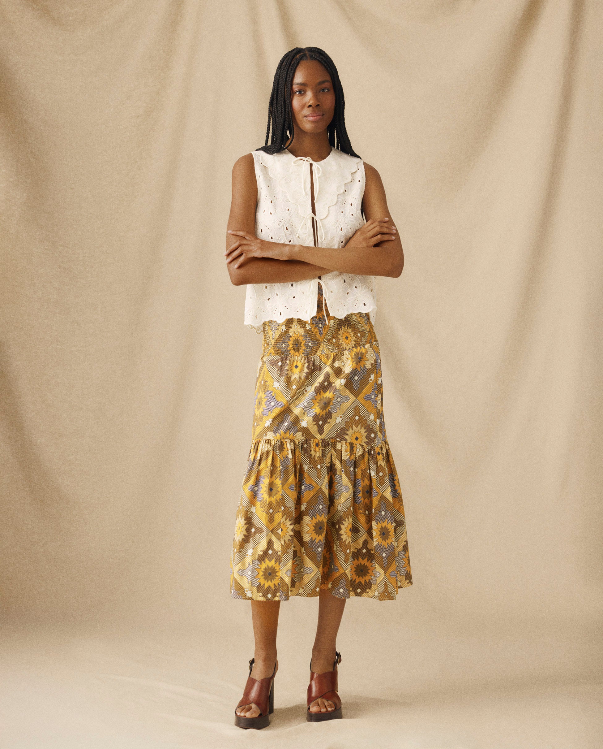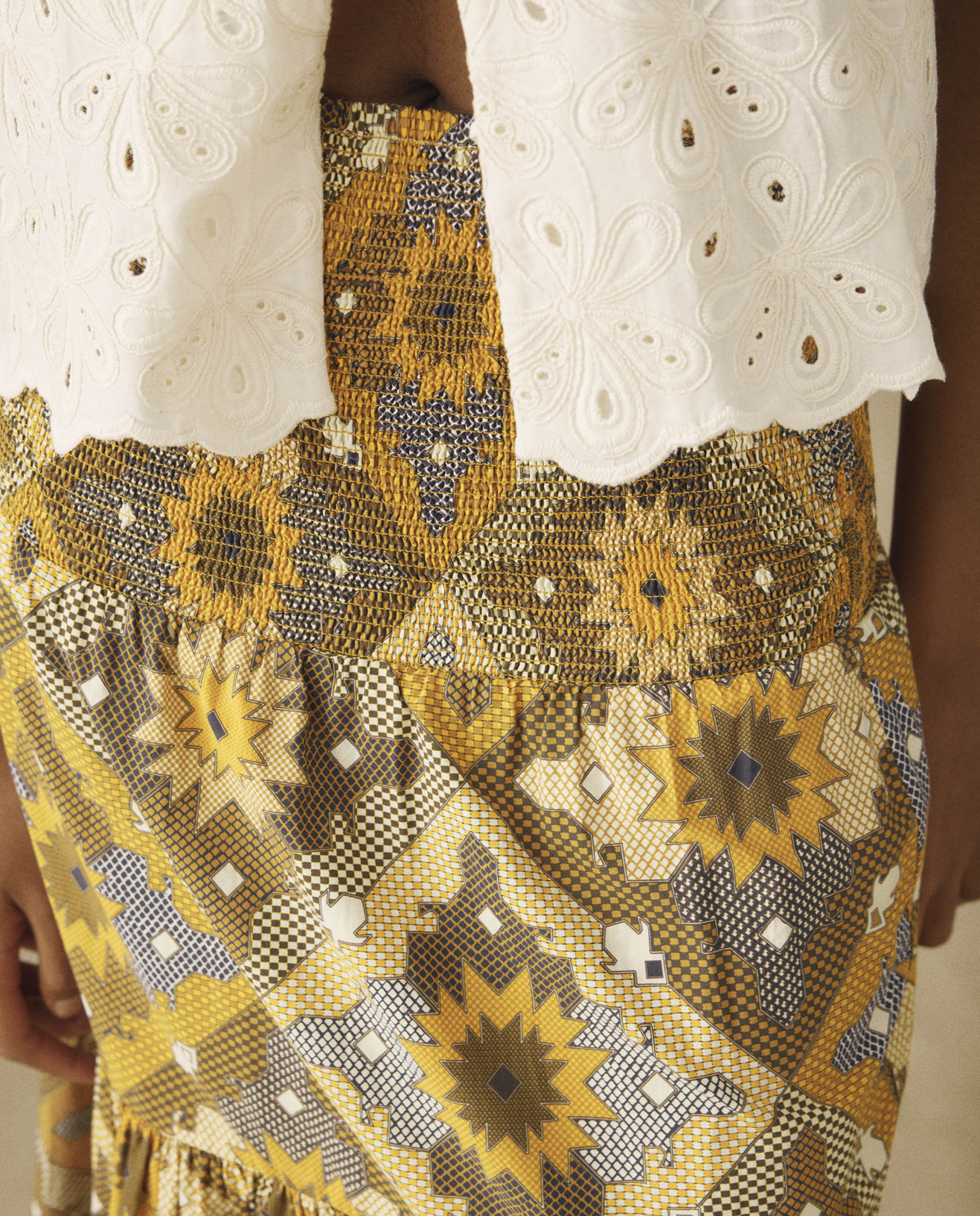 MONISHA | Falda de algodón con estampado multicolor en amarillo ocre