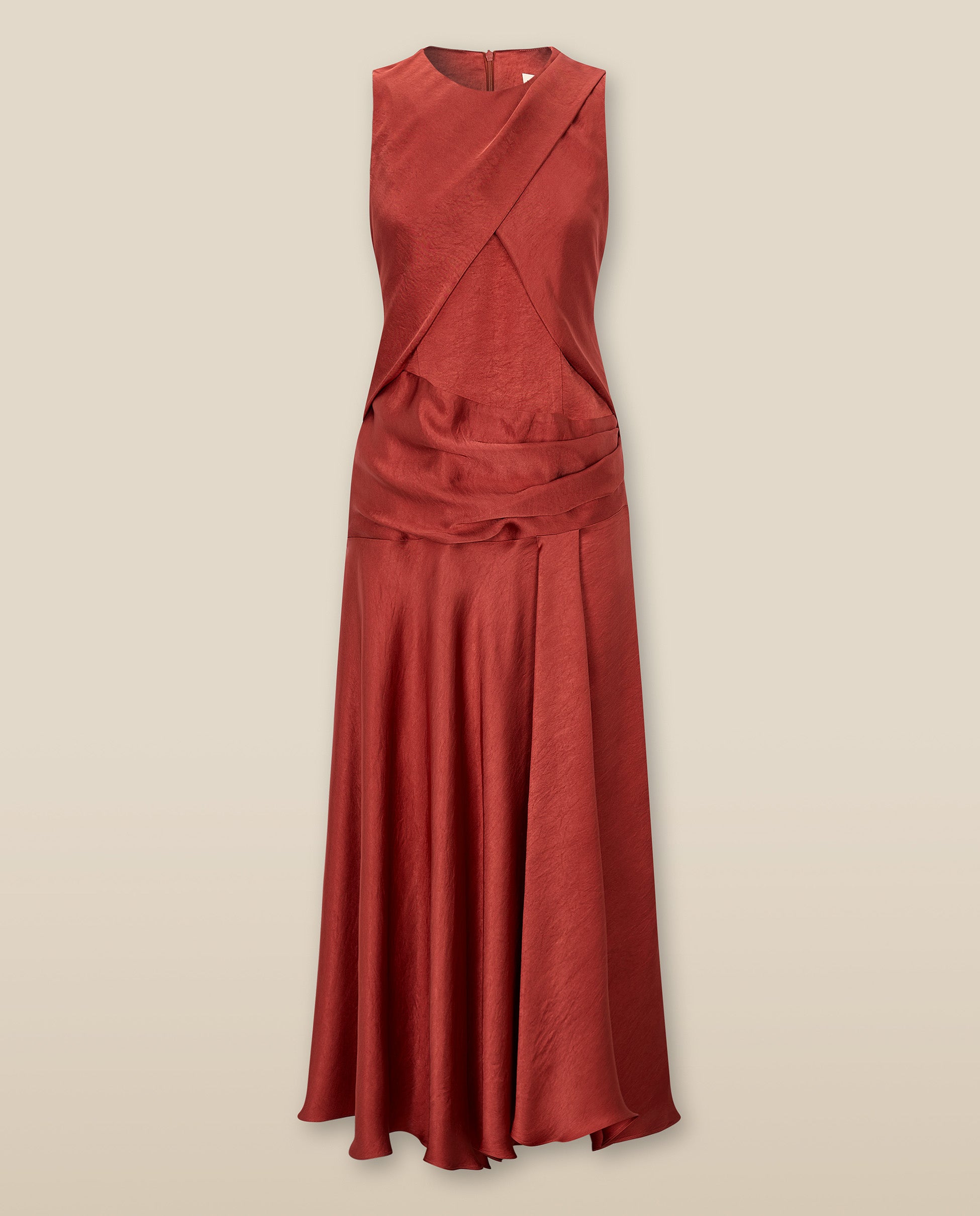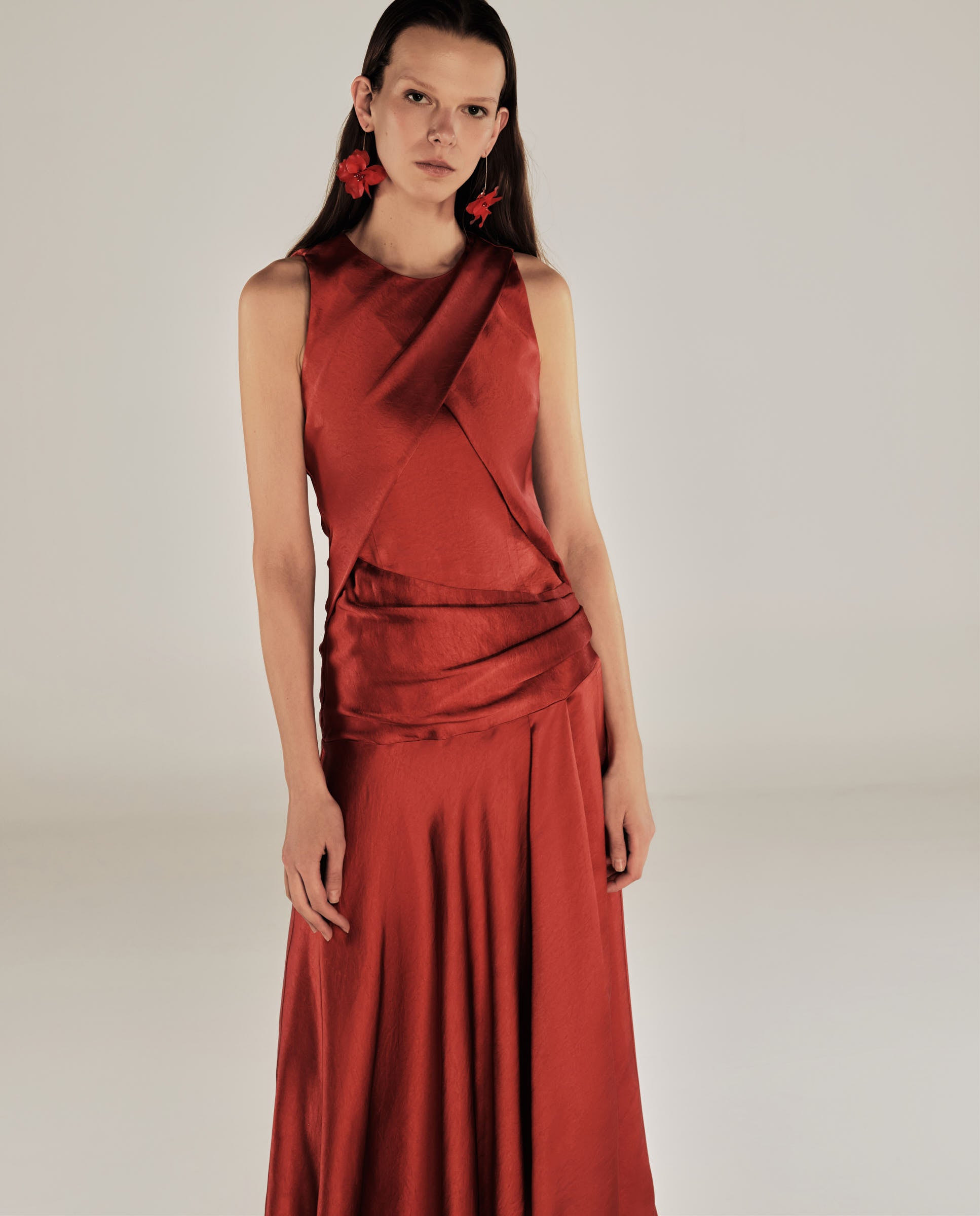 CAROLINA | Vestido cruzado midi de satén rojo pimentón