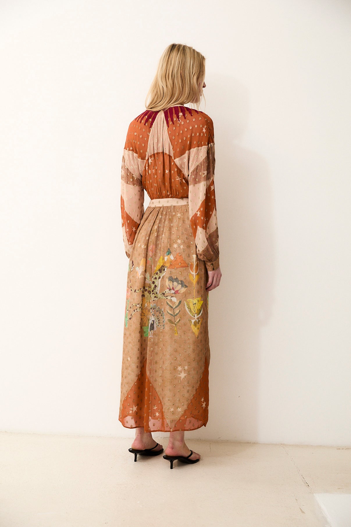 El vestido Esotico es una pieza única que combina artesanía y creatividad en un diseño lleno de carácter. Destaca por su bordado realizado manualmente, un proceso minucioso en el que se emplean aproximadamente 50 minutos por bordado, aportando textura y riqueza al tejido. El estampado digital, cuidadosamente desarrollado, requiere alrededor de 1,5 horas por vestido, creando una composición artística y vibrante. Su silueta fluida con escote en V y mangas largas aporta elegancia y movimiento, convirtiéndolo en un vestido especial y lleno de personalidad.